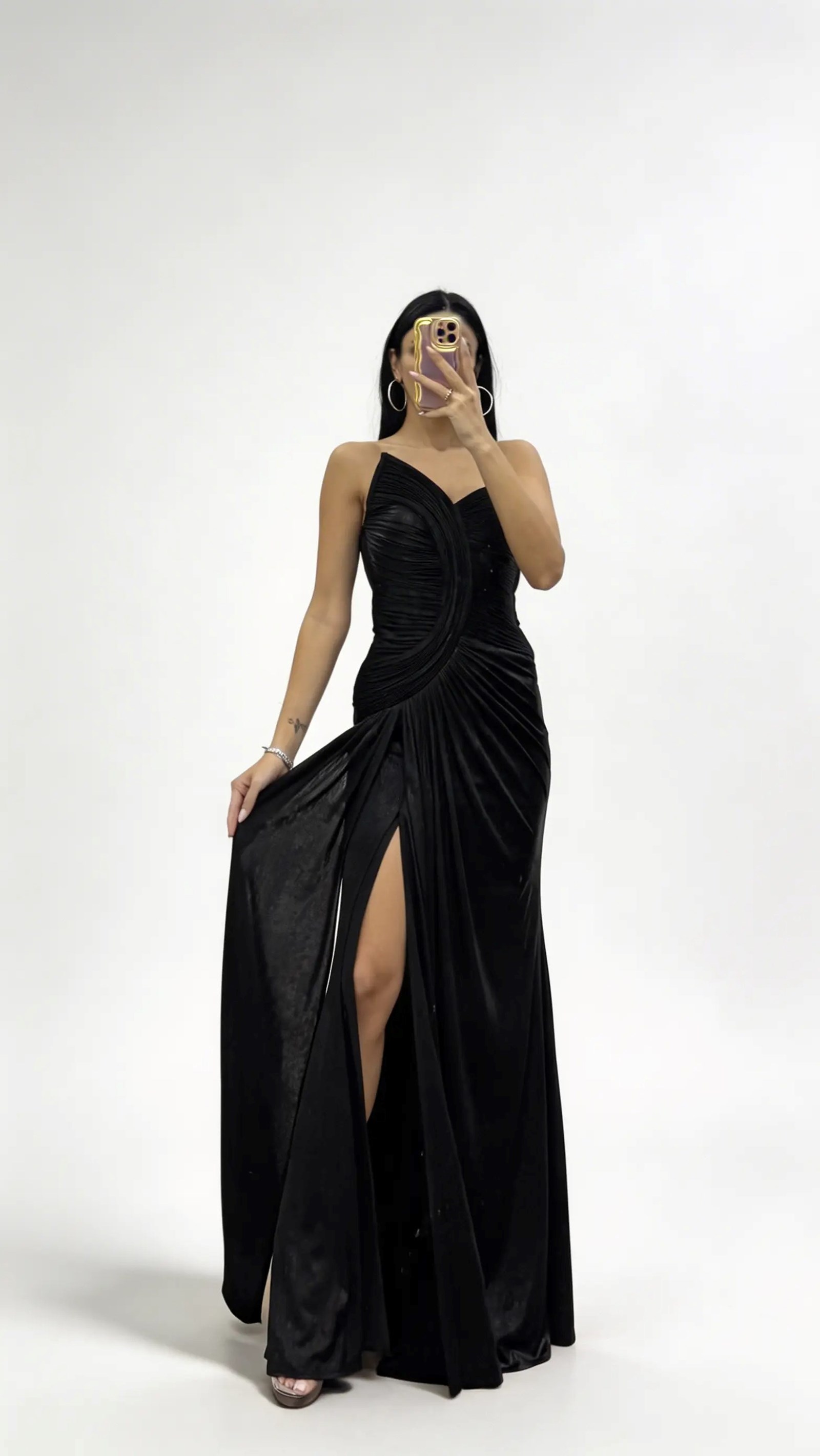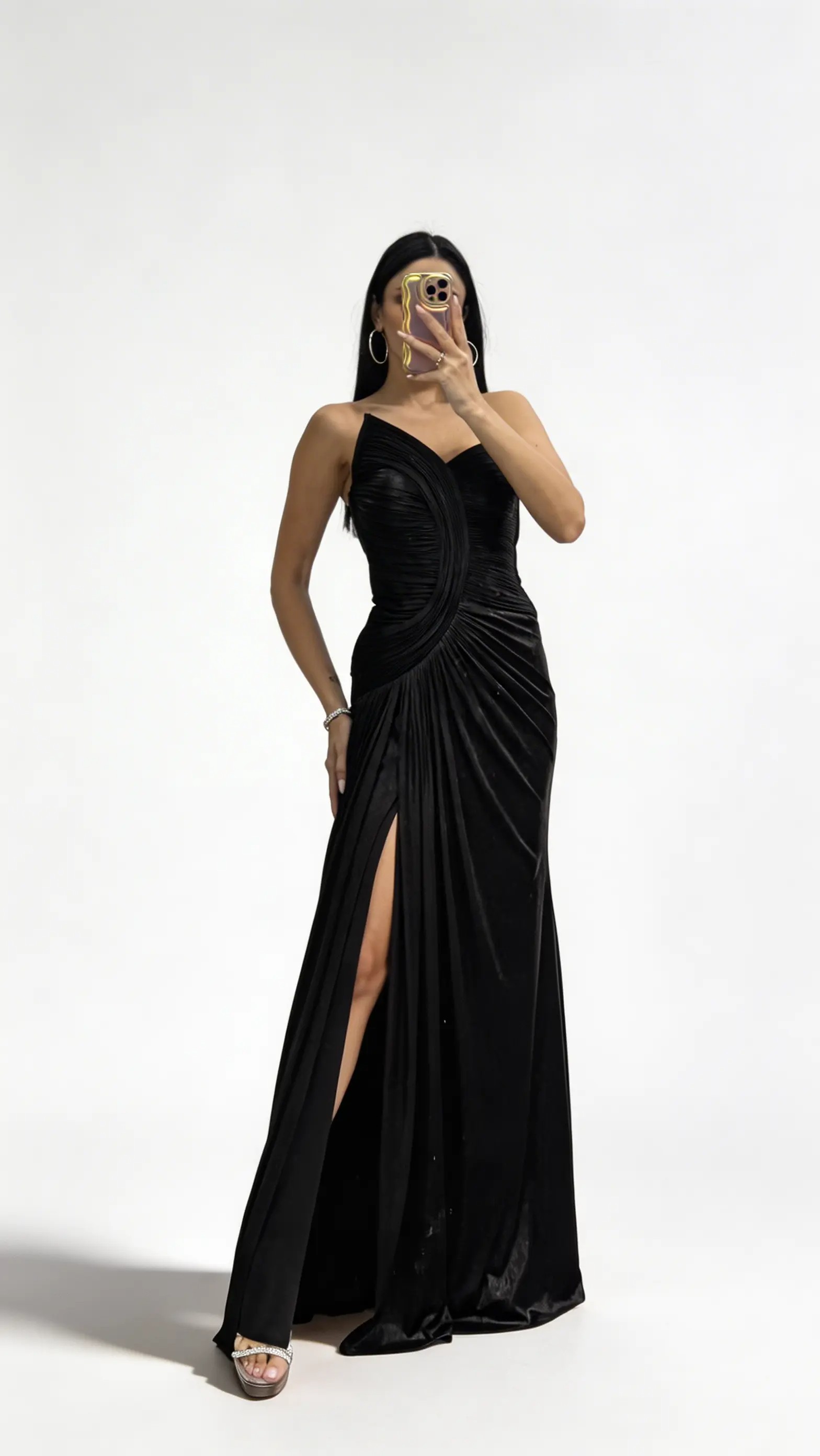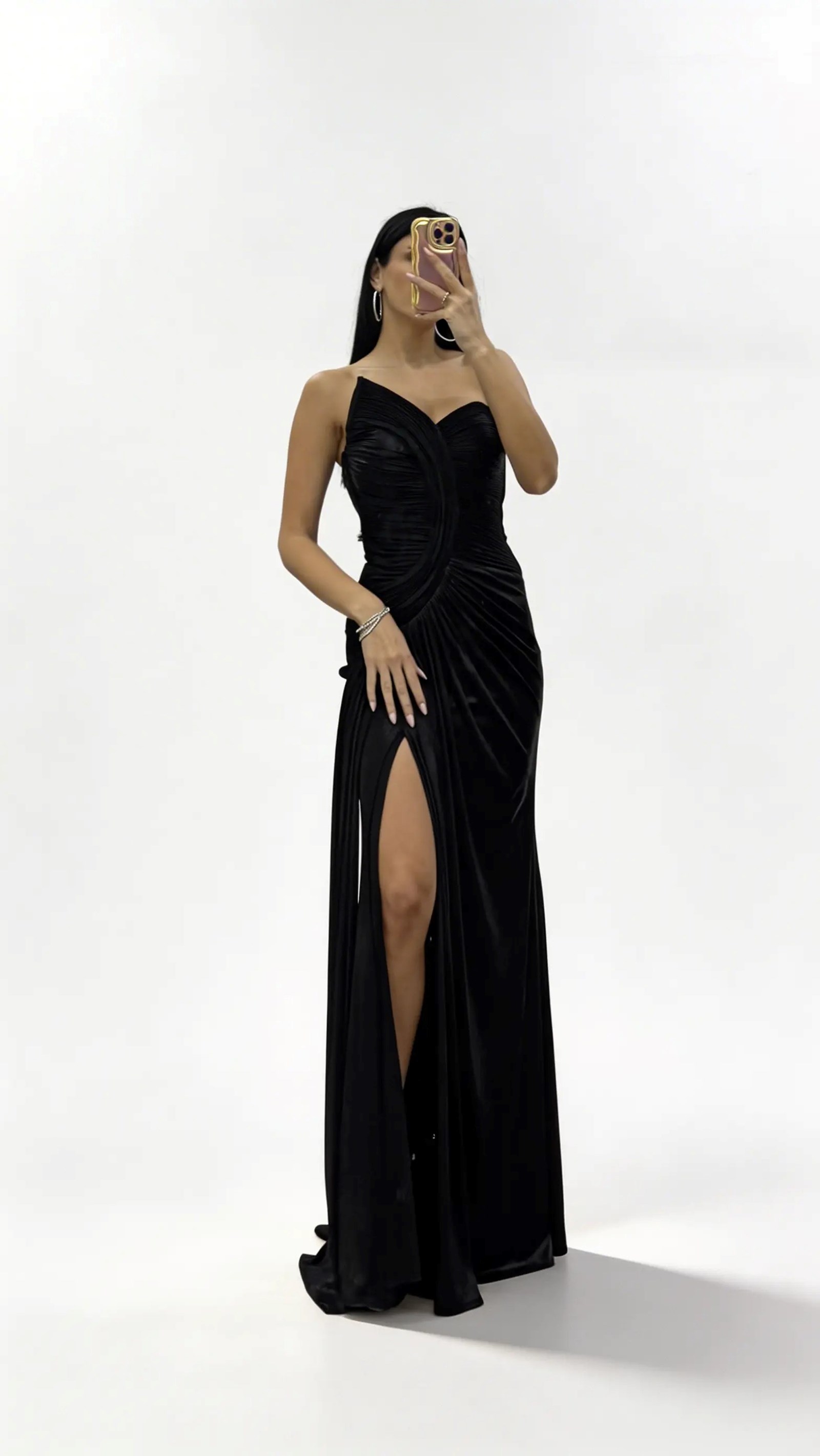 • Siyah Asimetrik Kavis Drapeli Straplez Abiye Elbise