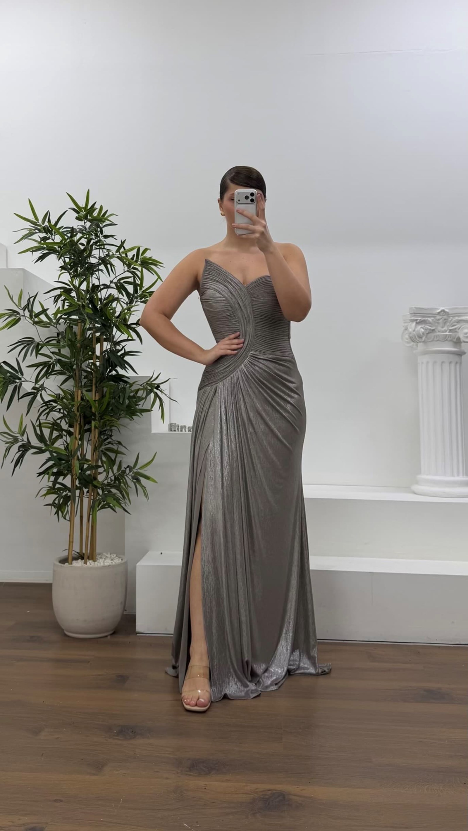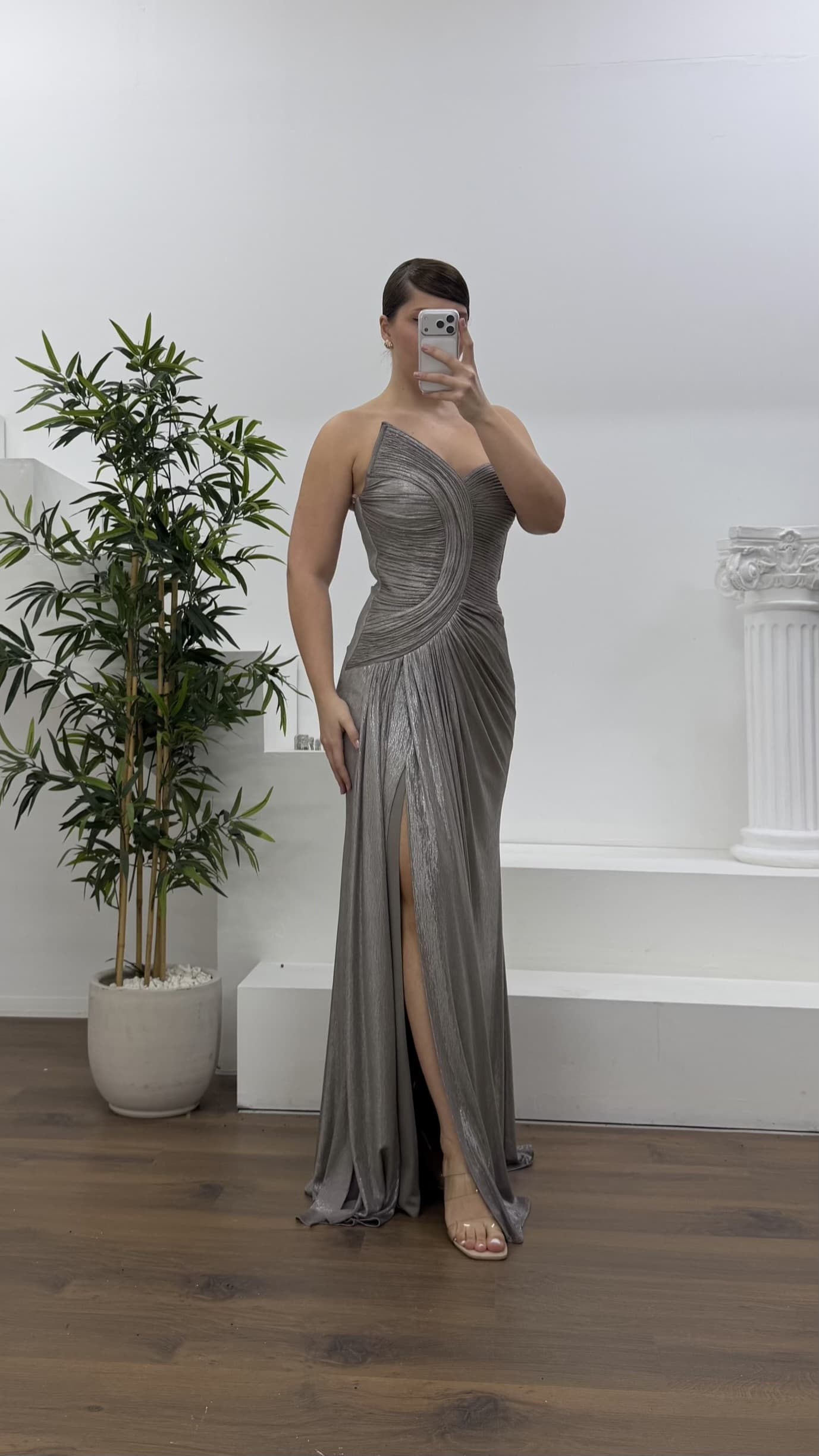 Taş Asimetrik Kavis Drapeli Straplez Büyük Beden Abiye Elbise