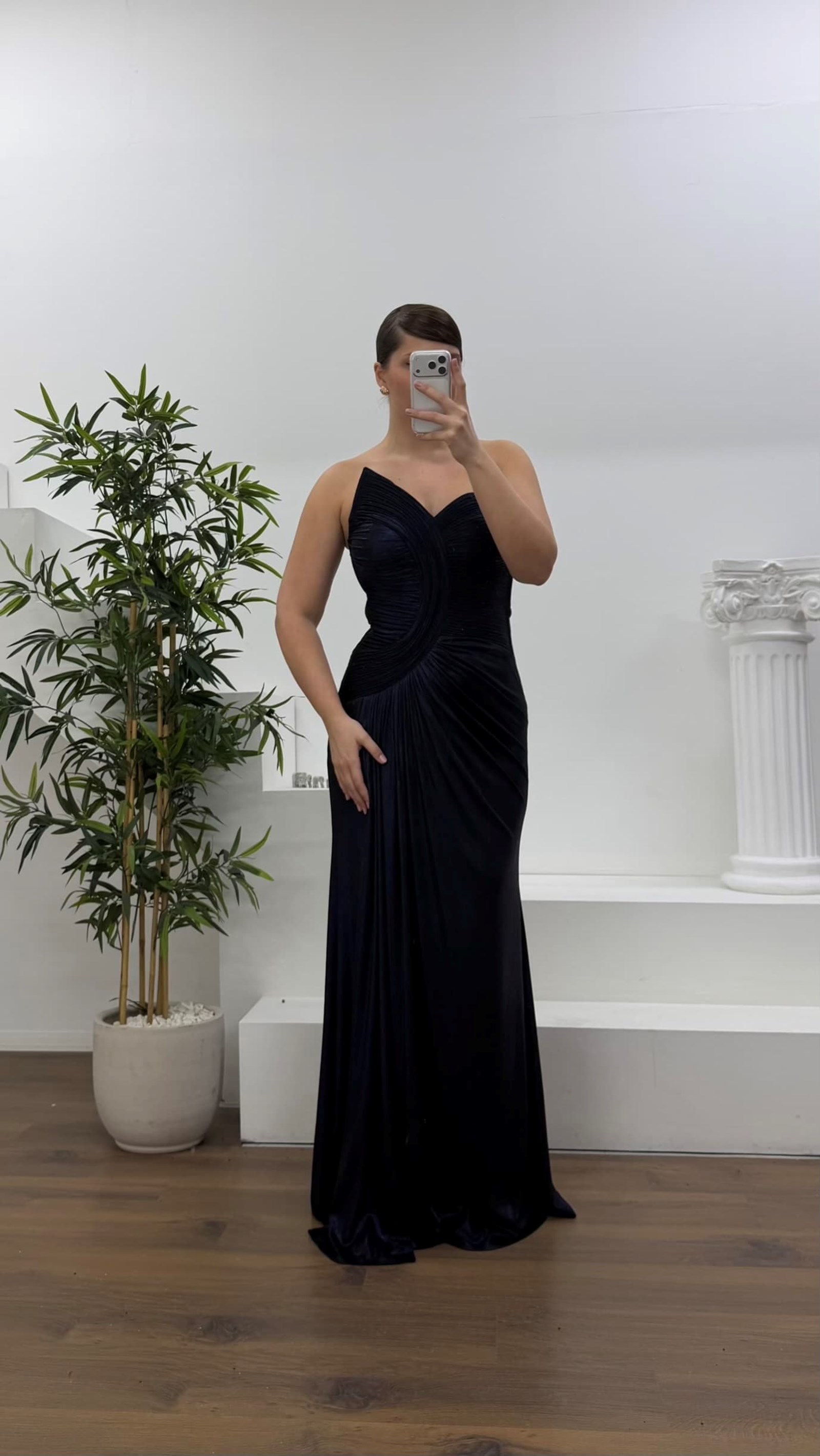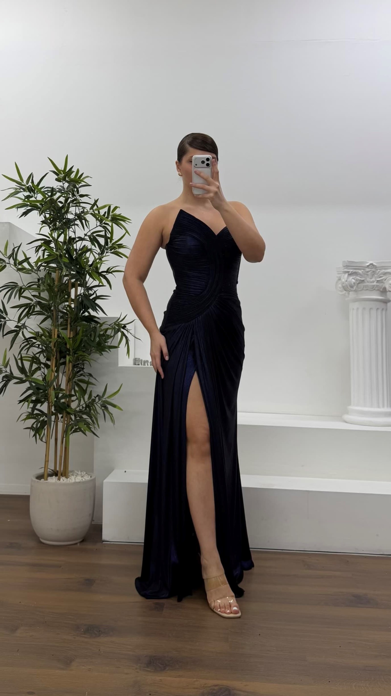 • Lacivert Asimetrik Kavis Drapeli Straplez Büyük Beden Abiye Elbise