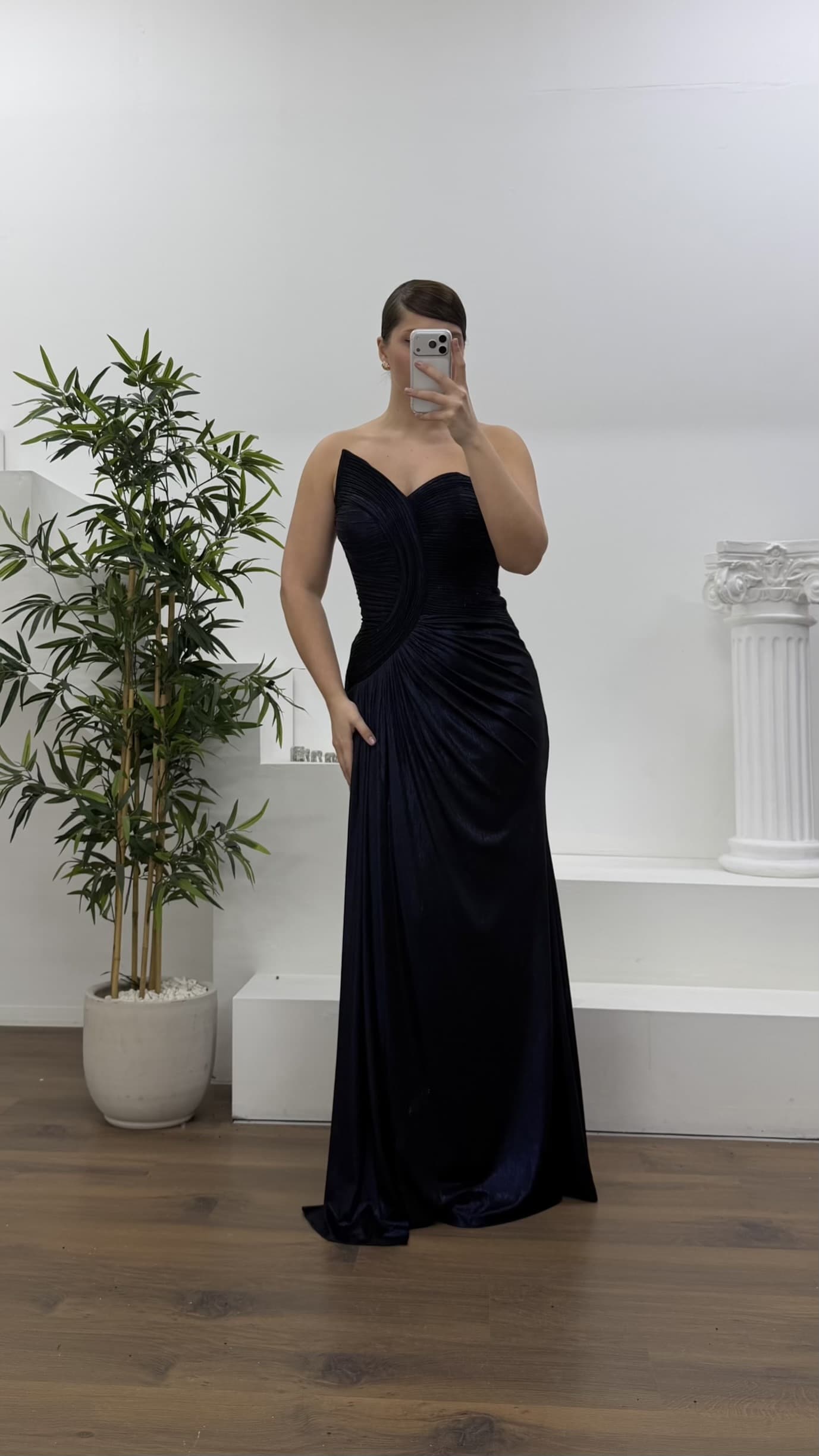Lacivert Asimetrik Kavis Drapeli Straplez Büyük Beden Abiye Elbise