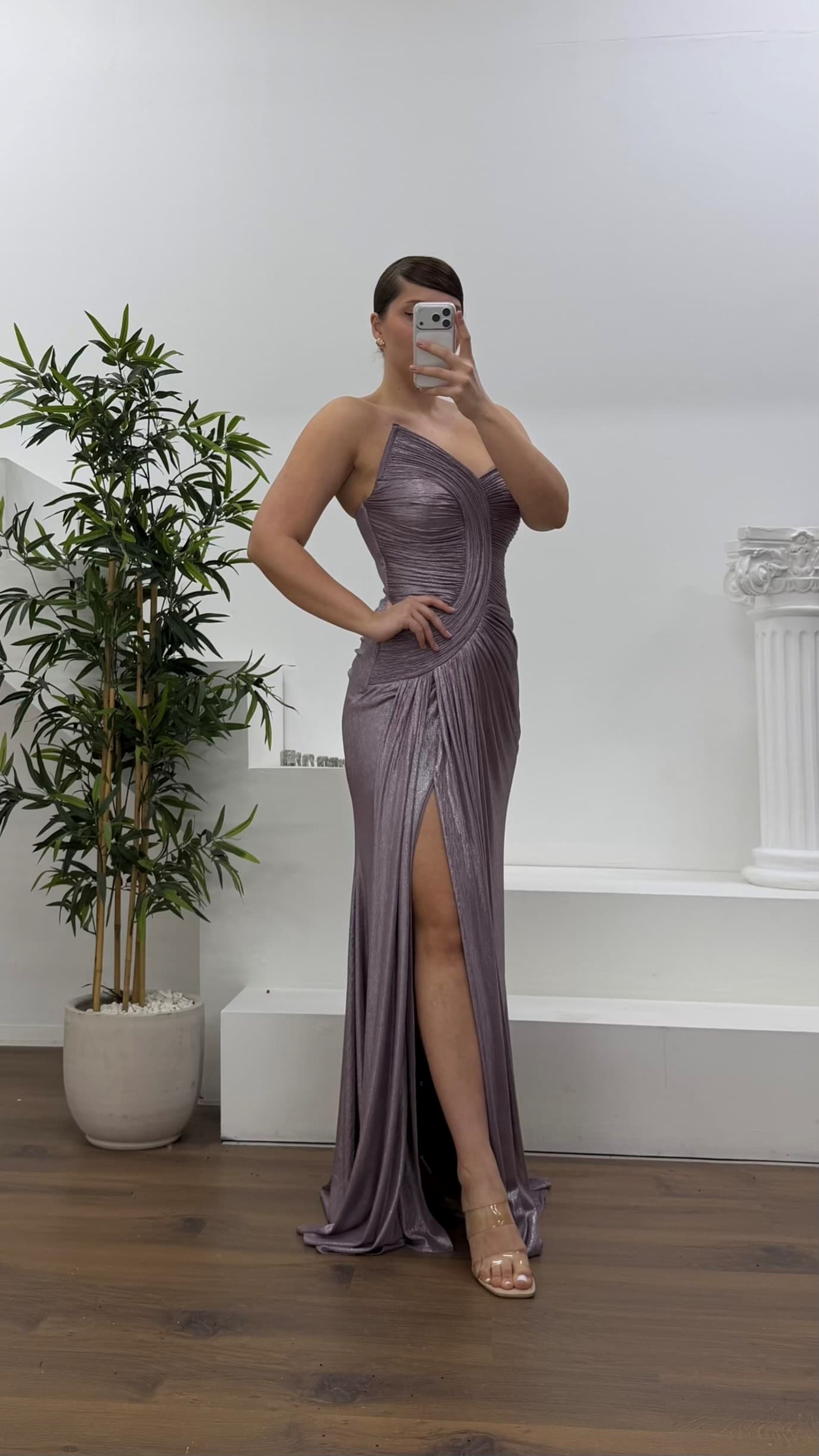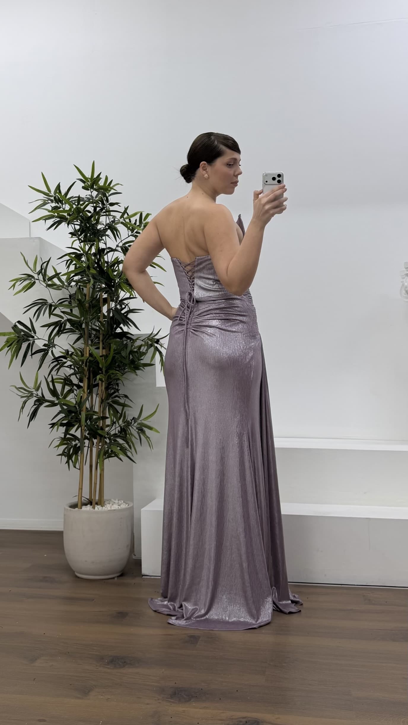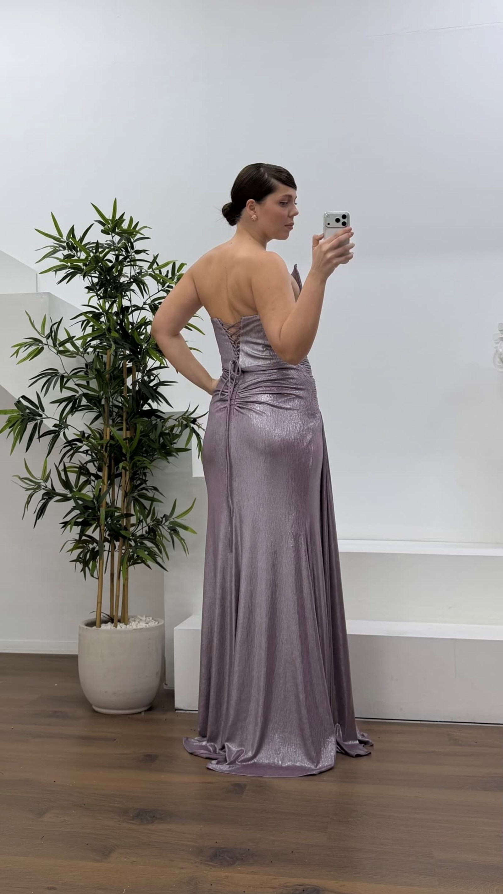 Lila Asimetrik Kavis Drapeli Straplez Büyük Beden Abiye Elbise