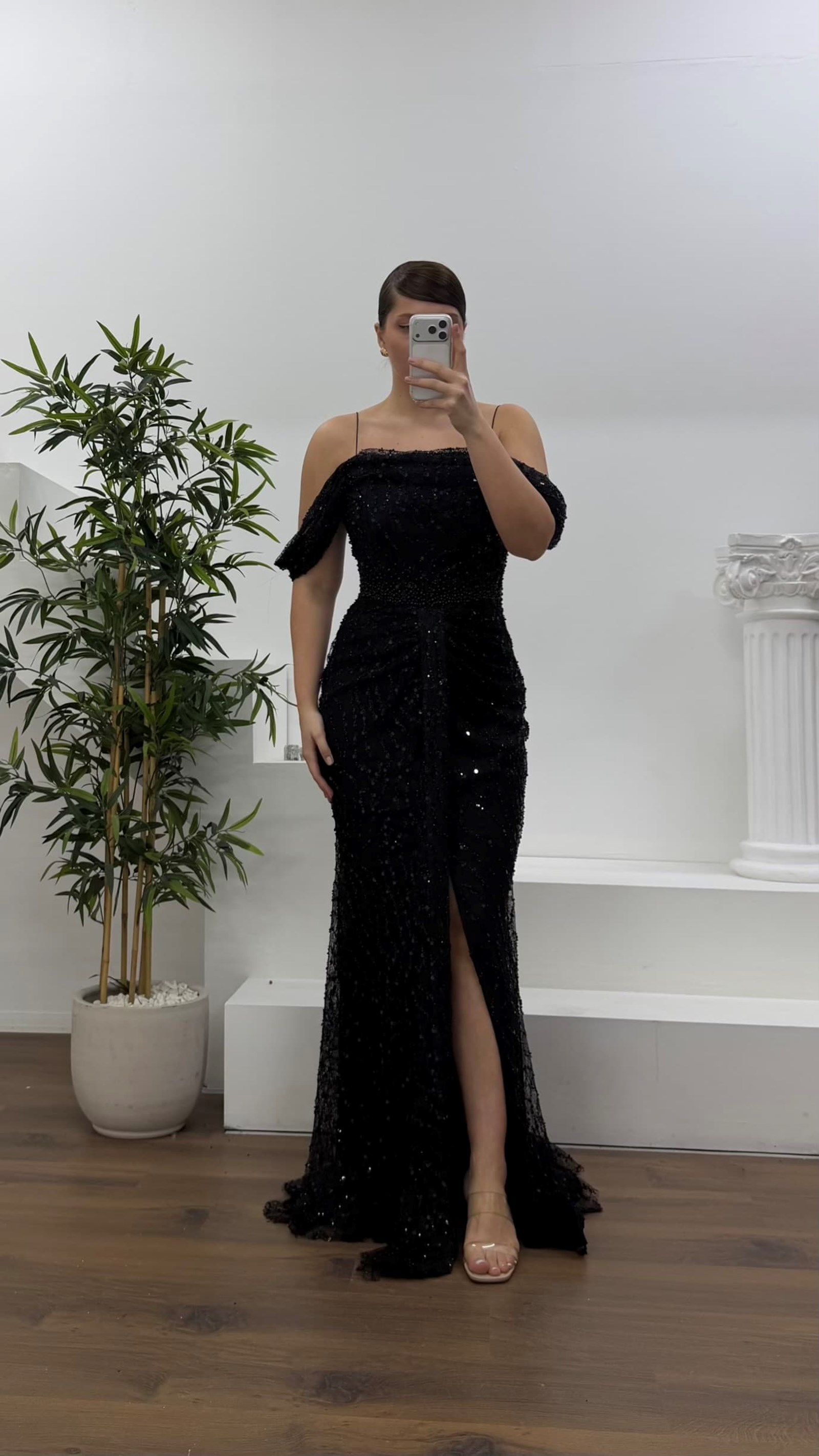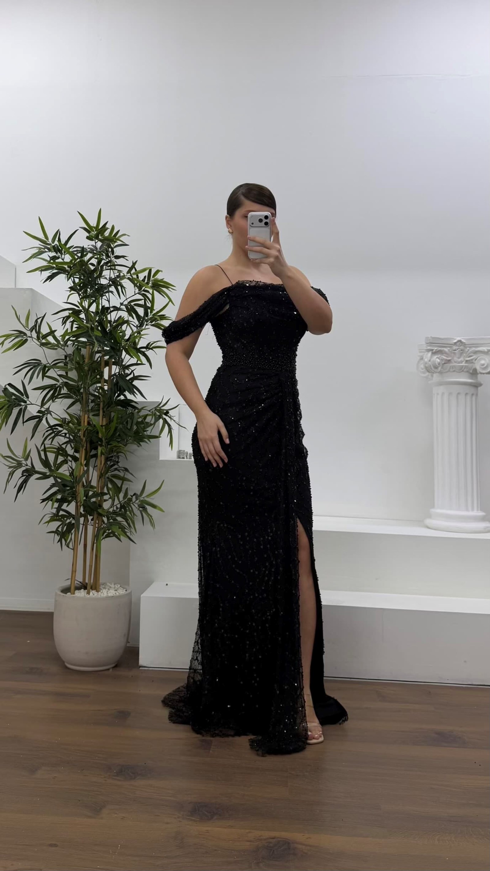 • Siyah Drapeli Göğüs Yandan Dökümlü Kol Pul Payet Büyük Beden Abiye Elbise