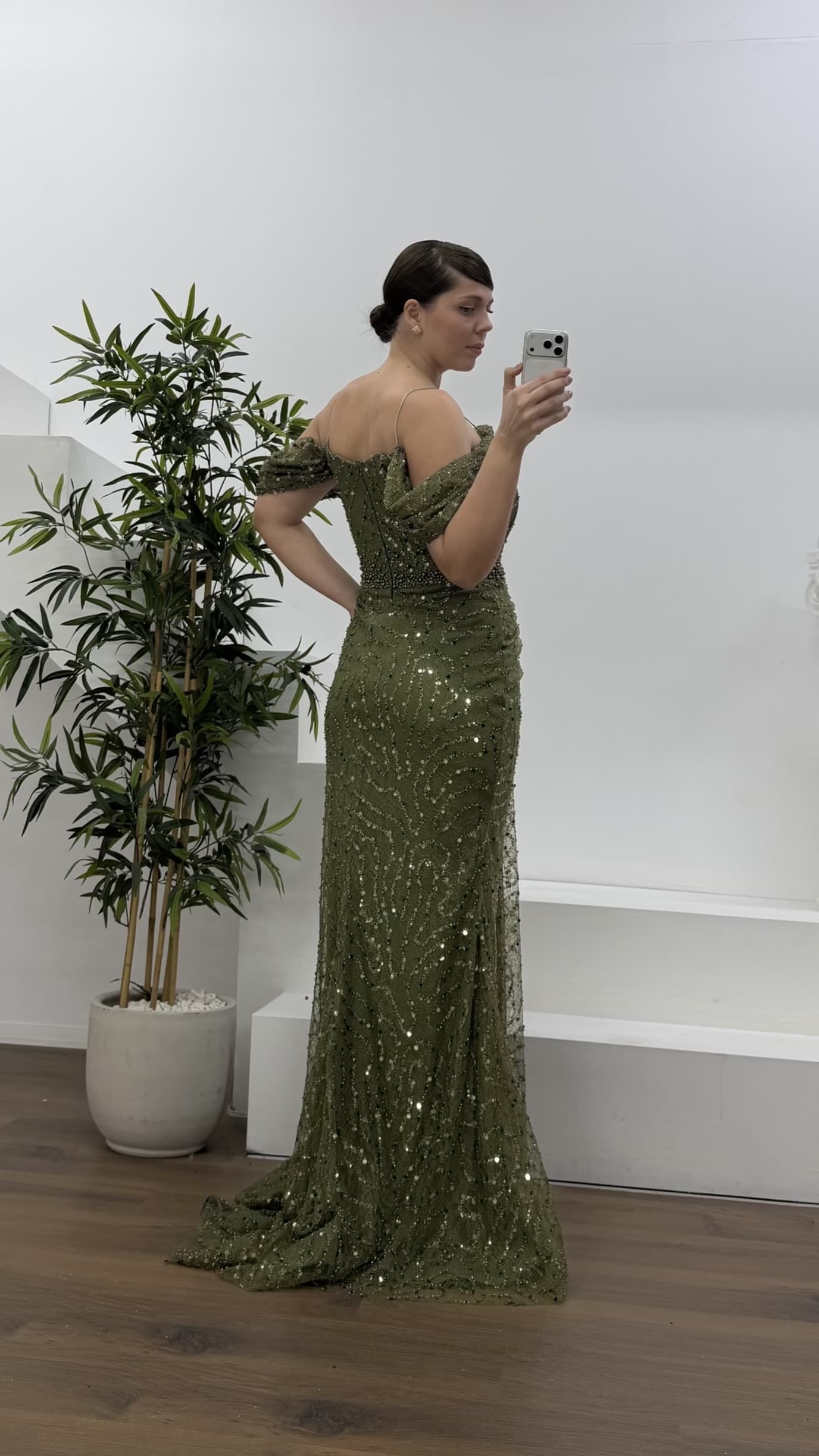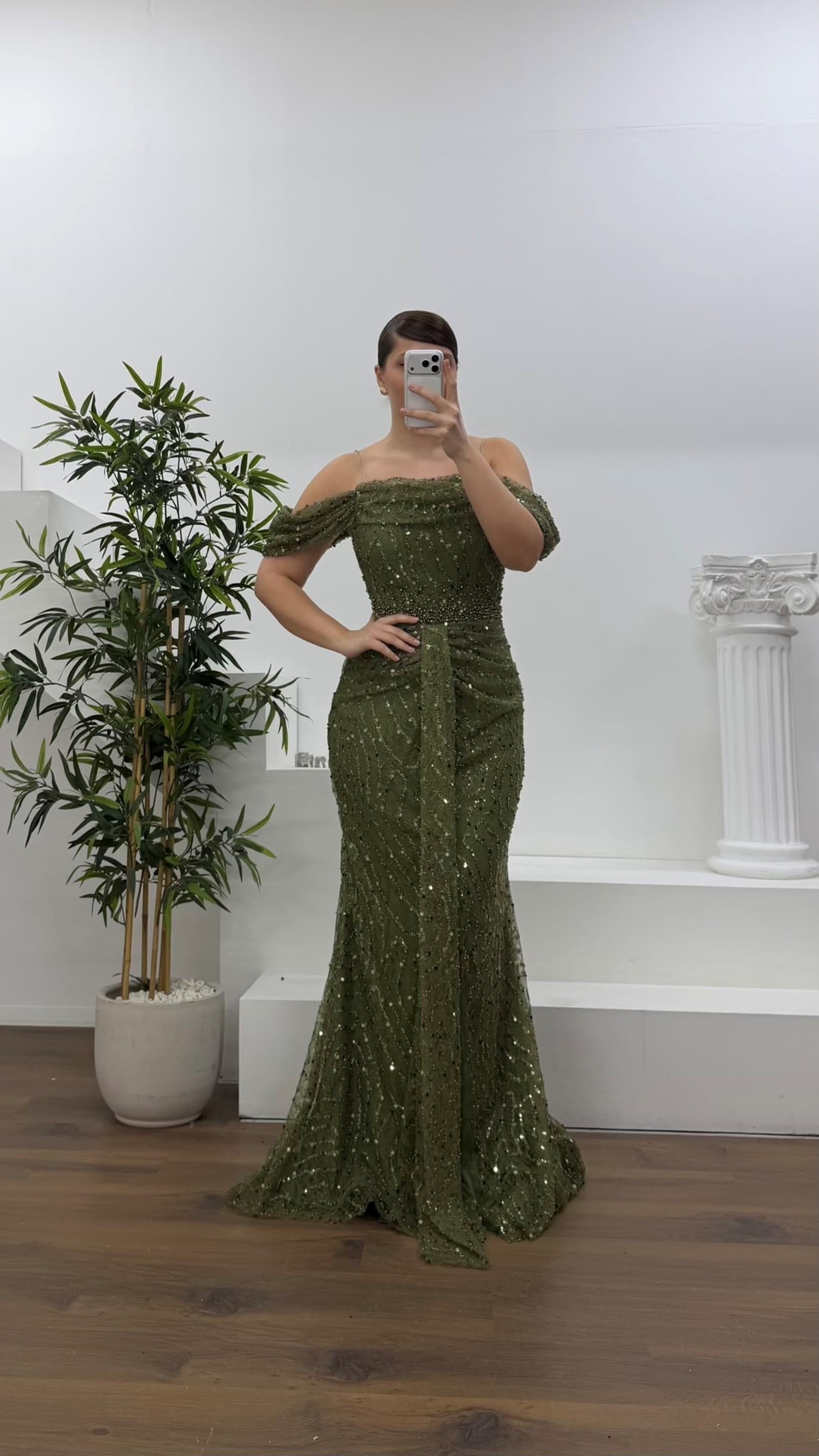 • Haki Drapeli Göğüs Yandan Dökümlü Kol Pul Payet Büyük Beden Abiye Elbise