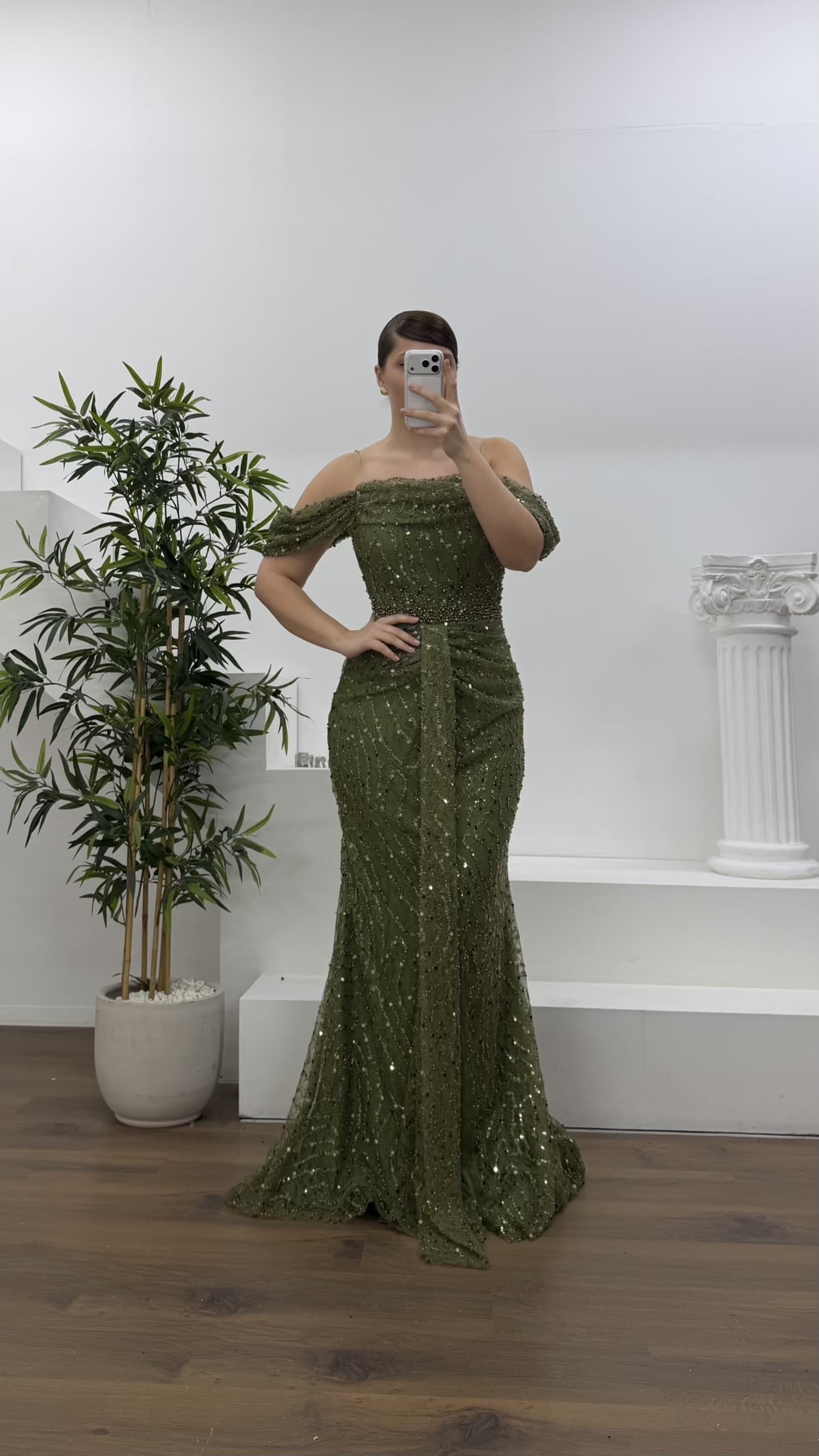 Haki Drapeli Göğüs Yandan Dökümlü Kol Pul Payet Büyük Beden Abiye Elbise