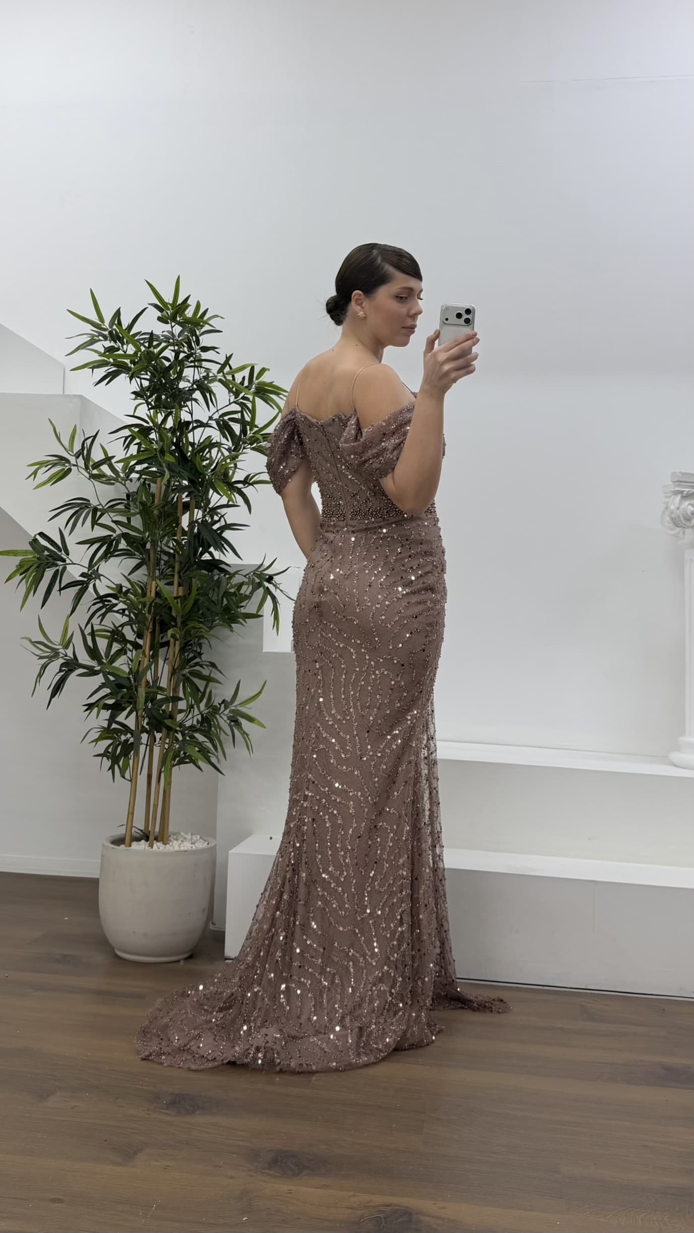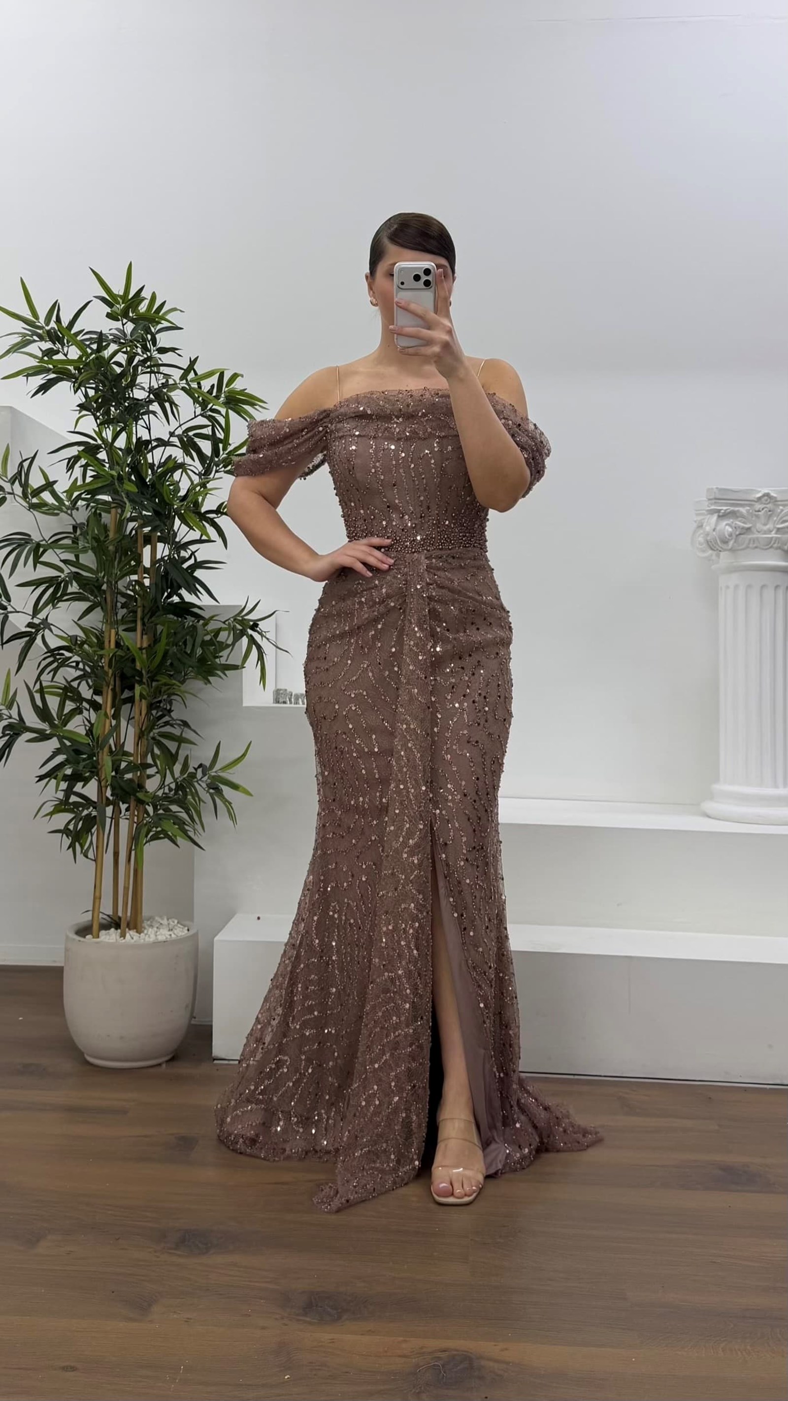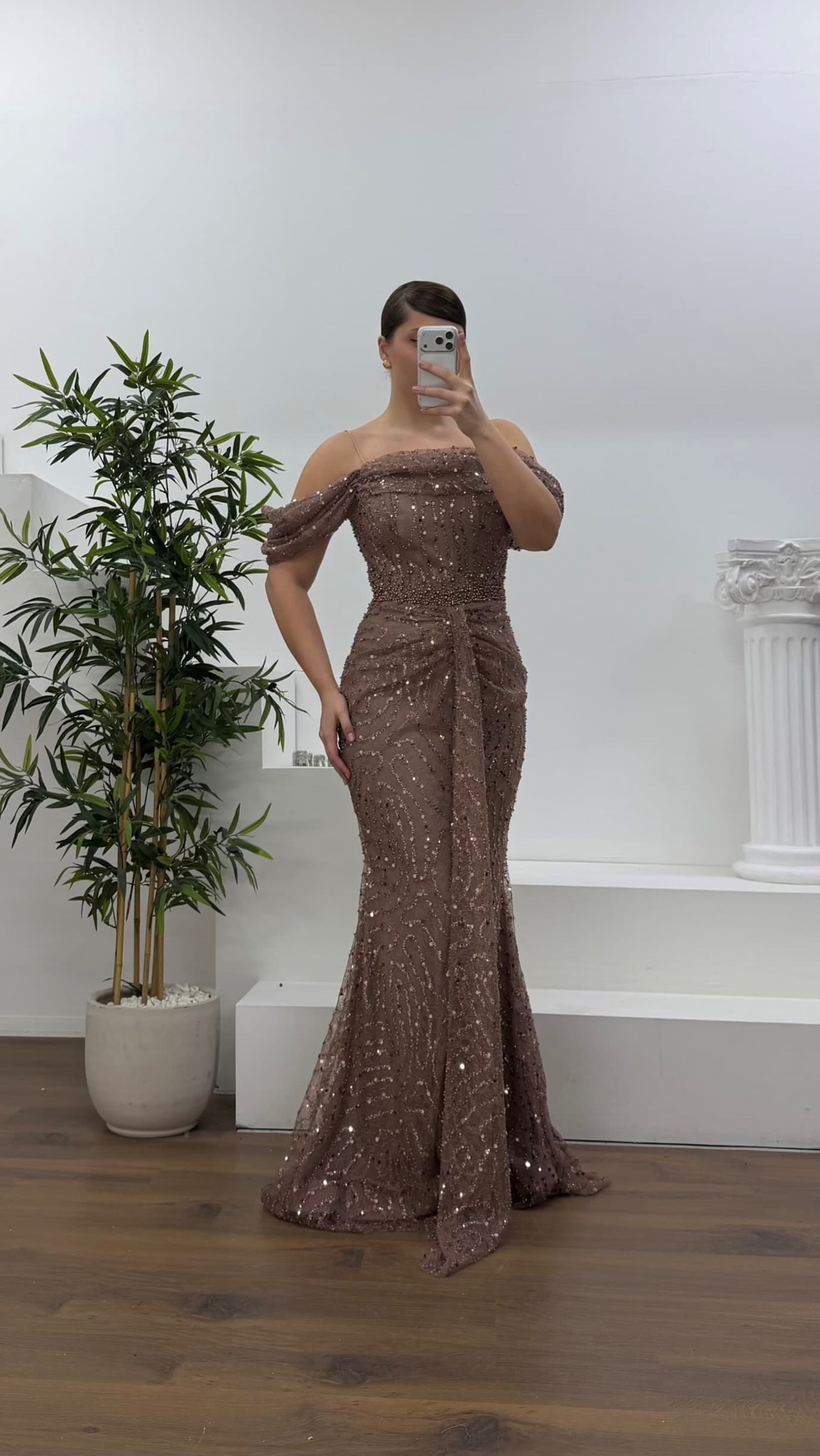 • Kahverengi Drapeli Göğüs Yandan Dökümlü Kol Pul Payet Büyük Beden Abiye Elbise