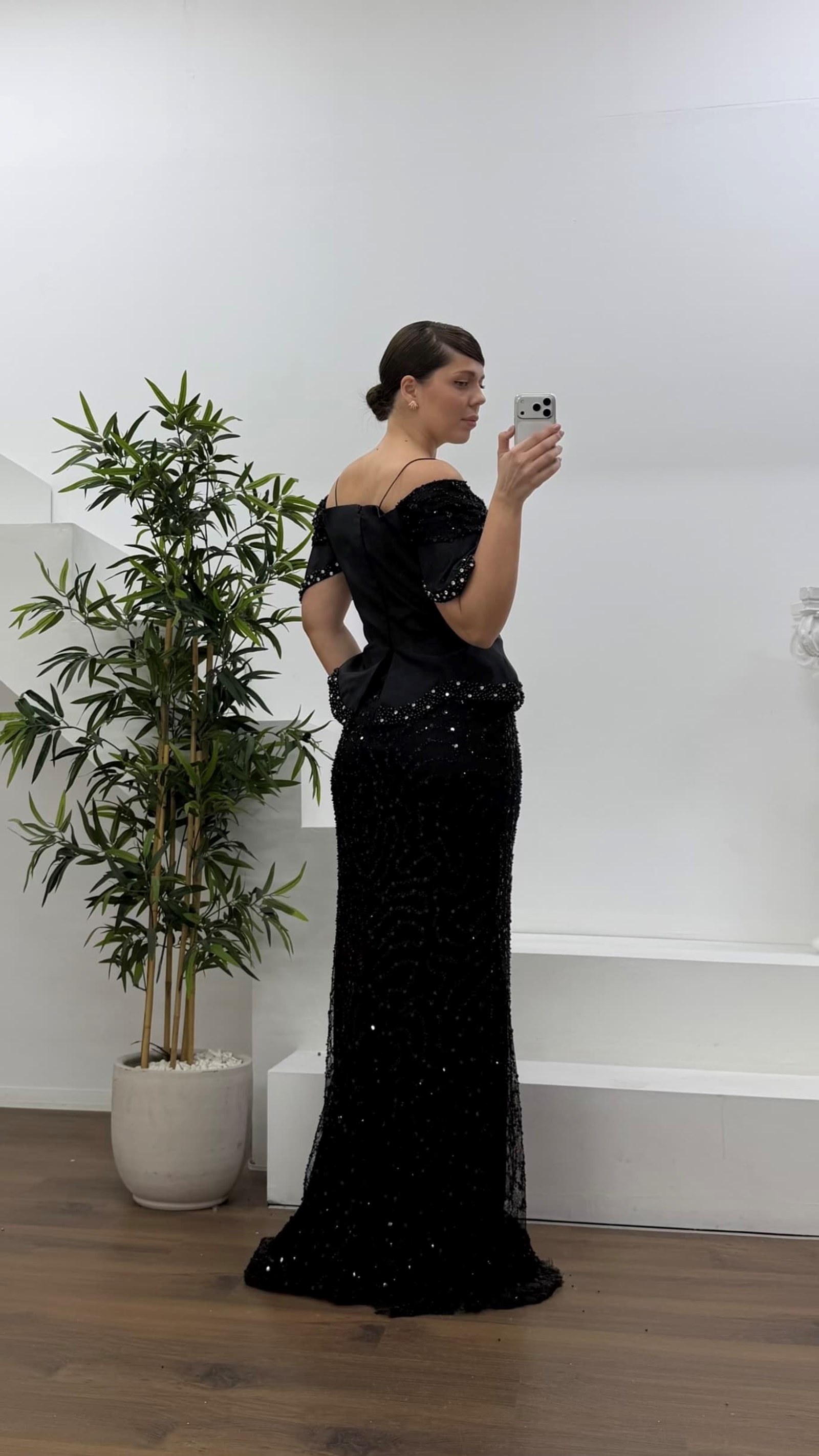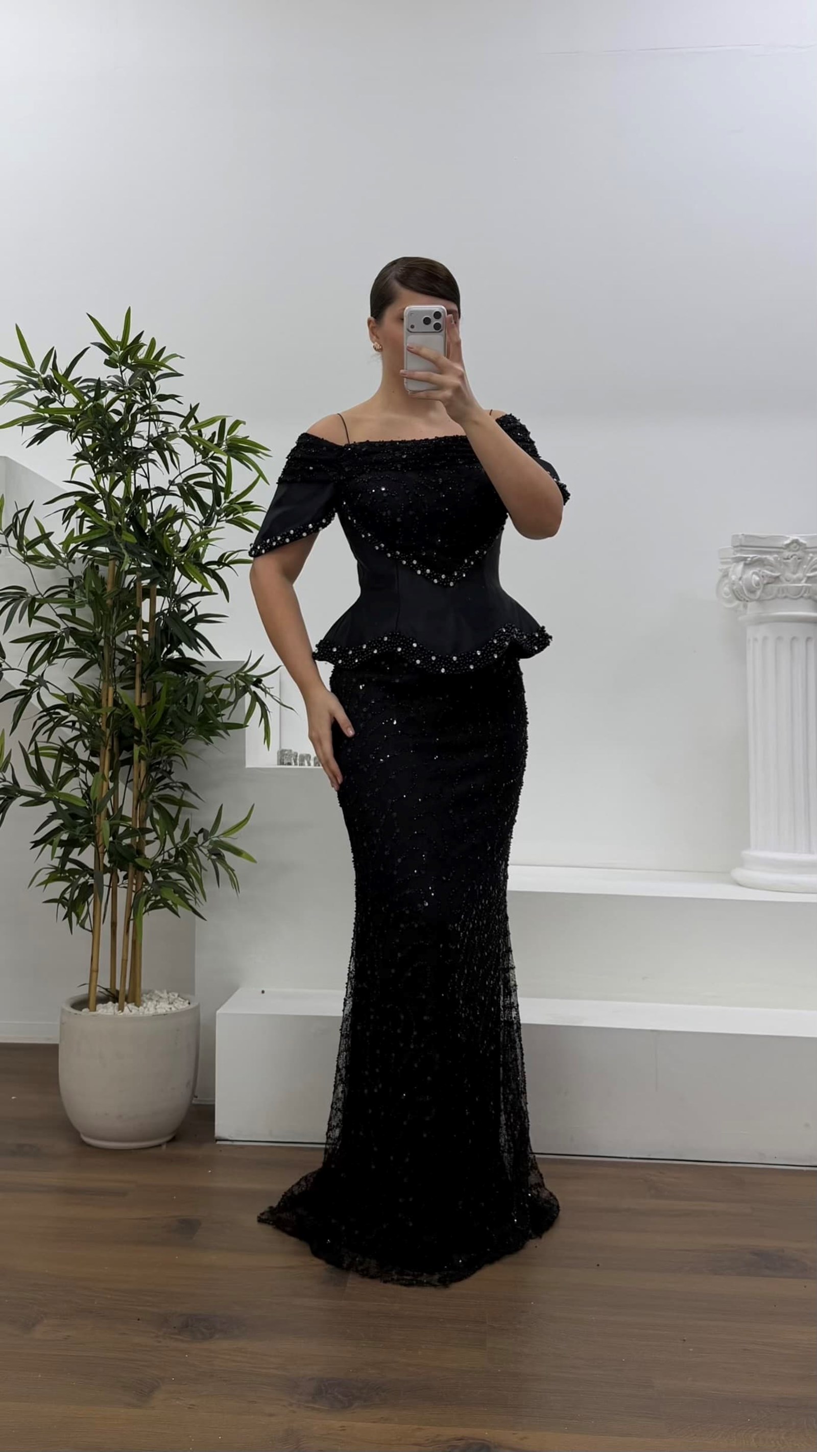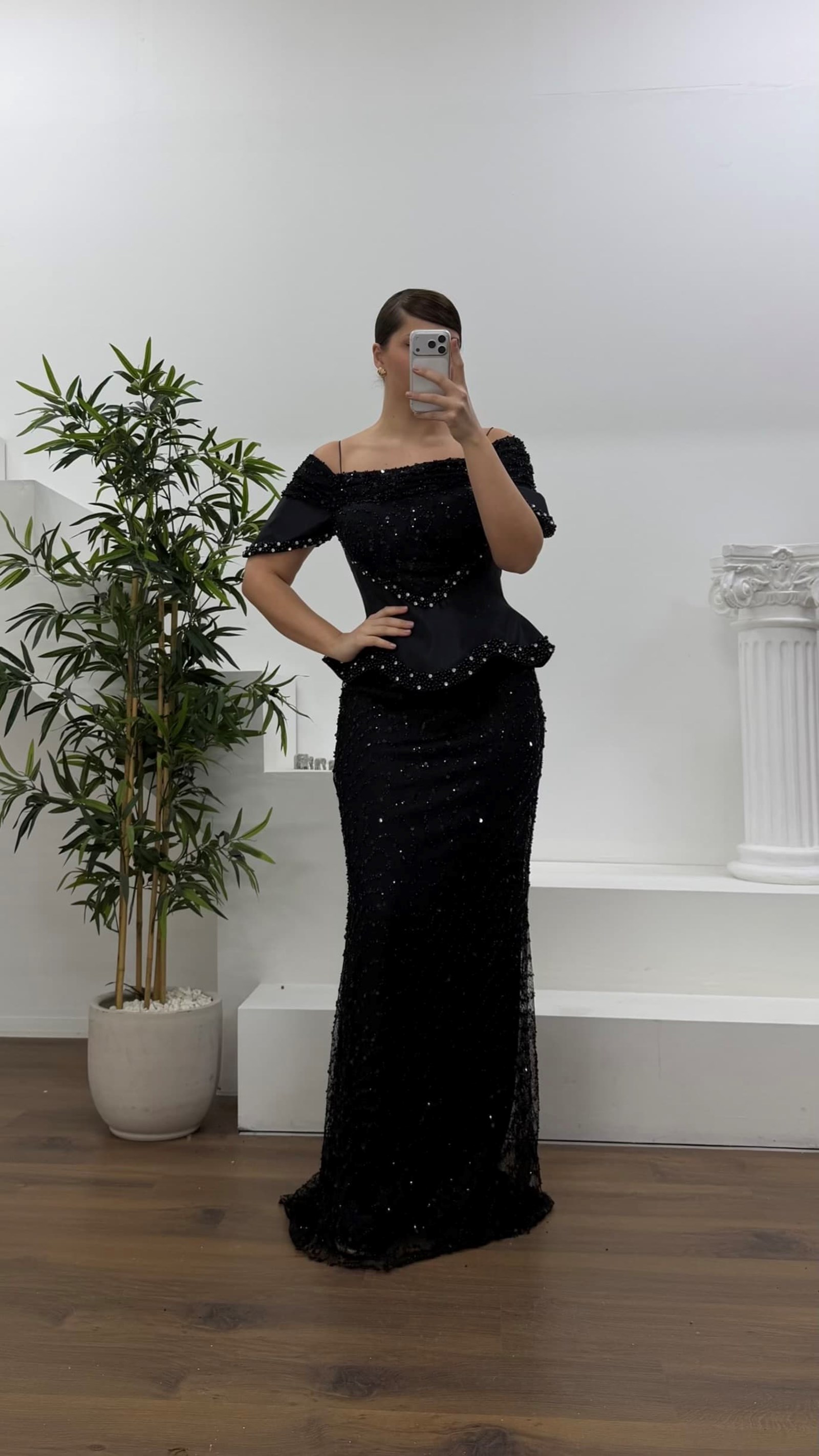 • Siyah Düşük Omuz Şerit Katmanlı Korse Form Payetli Büyük Beden Abiye Elbise
