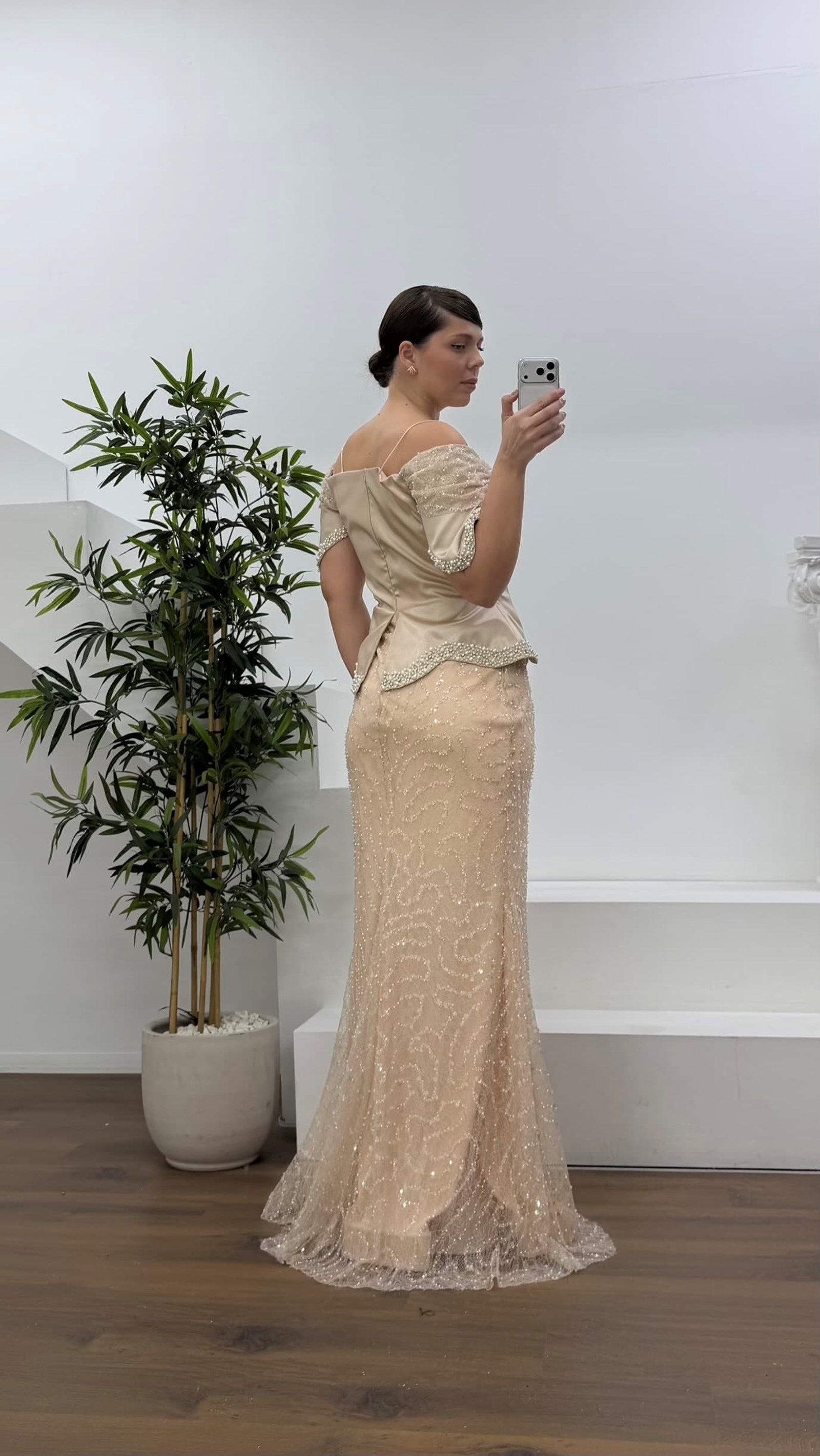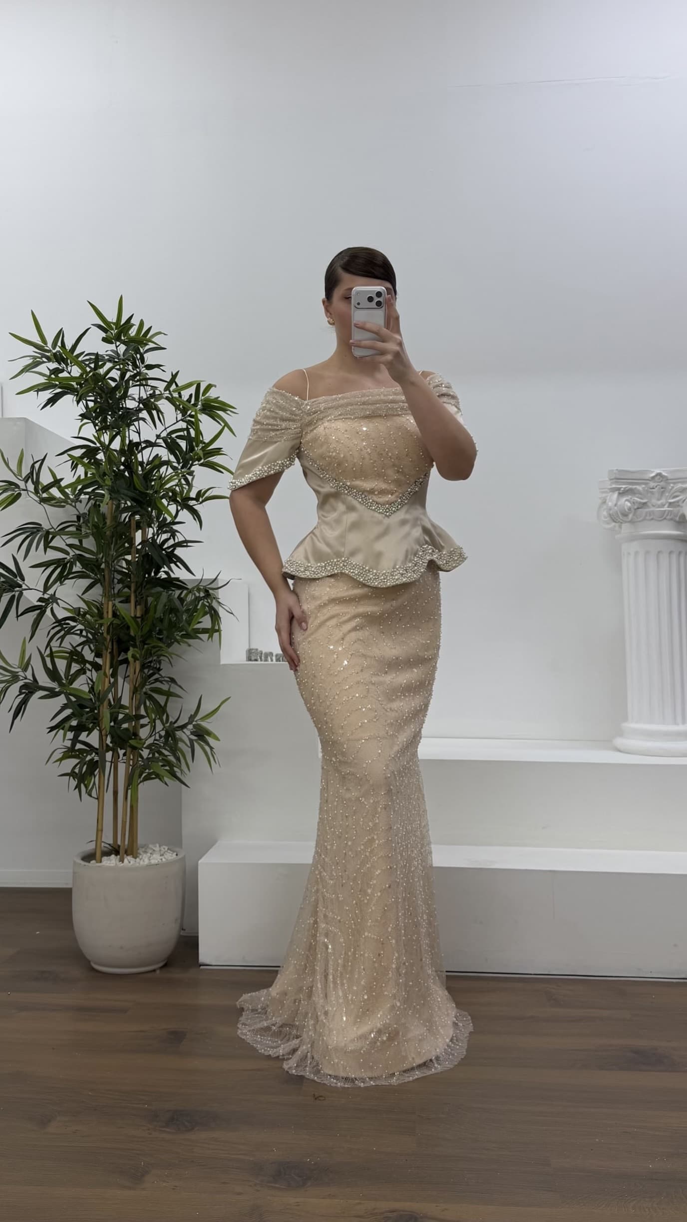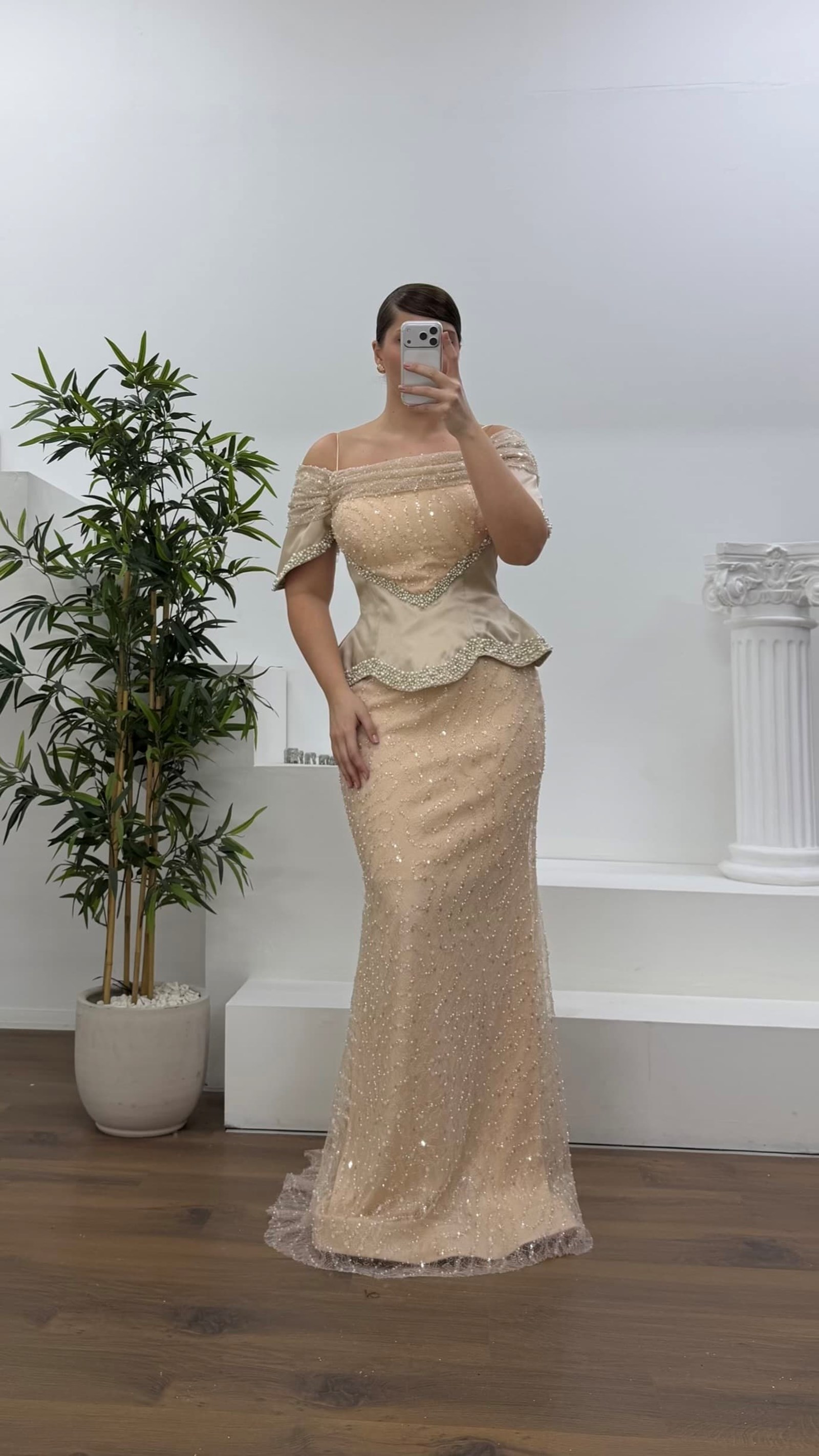 • Gold Düşük Omuz Şerit Katmanlı Korse Form Payetli Büyük Beden Abiye Elbise