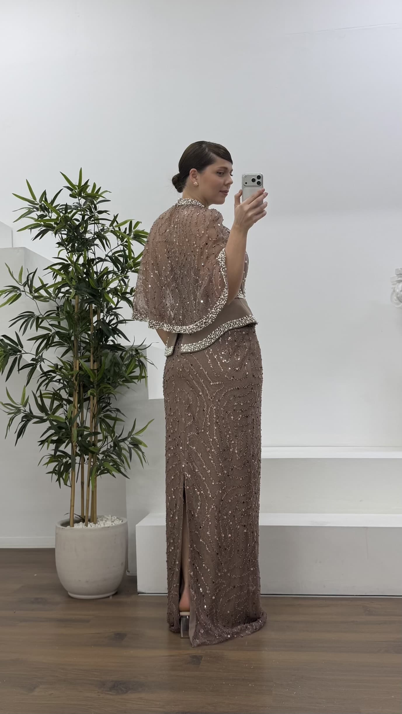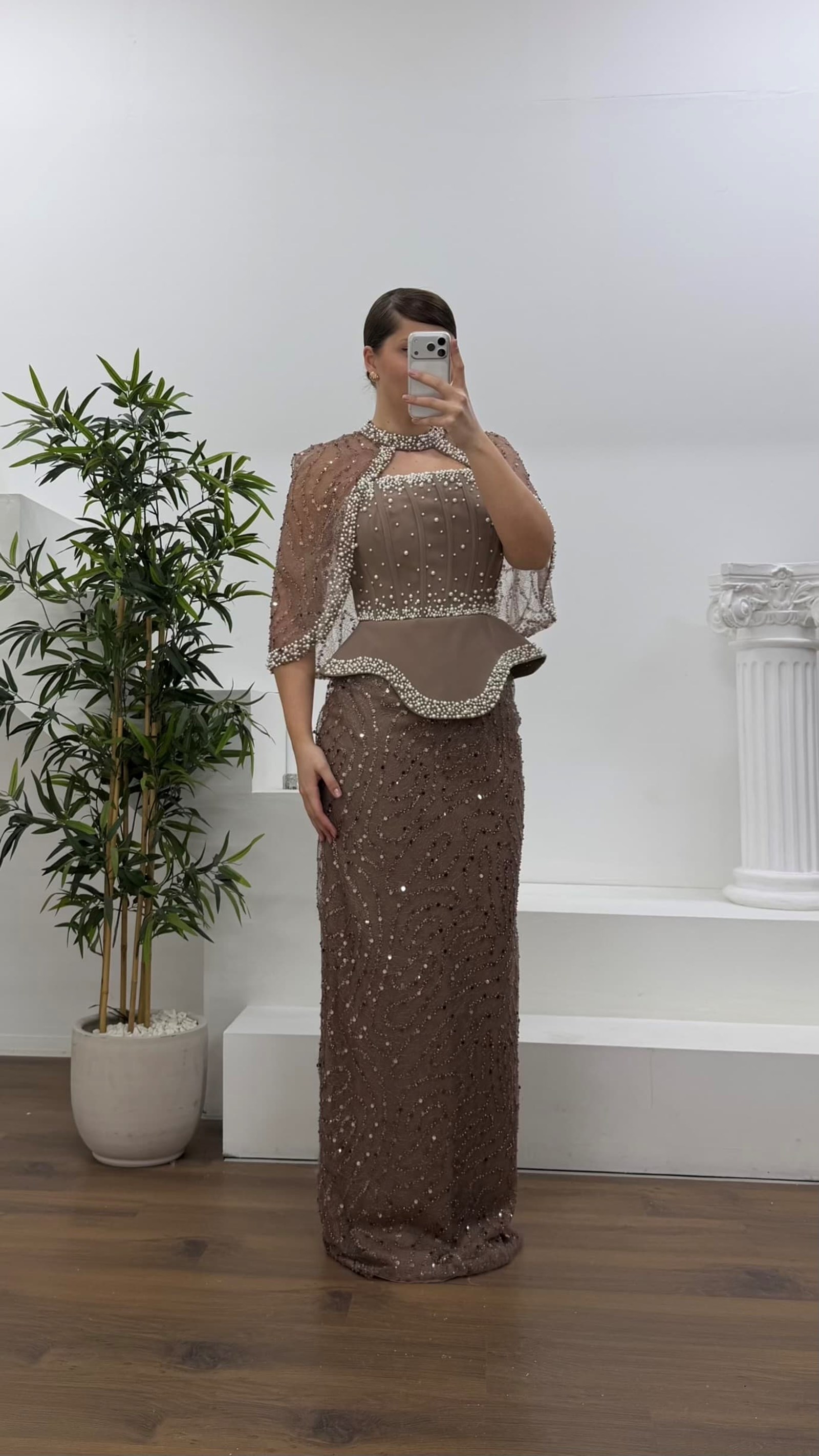 Kahverengi Straplez Pelerinli Pul Payet Büyük Beden Abiye Elbise
