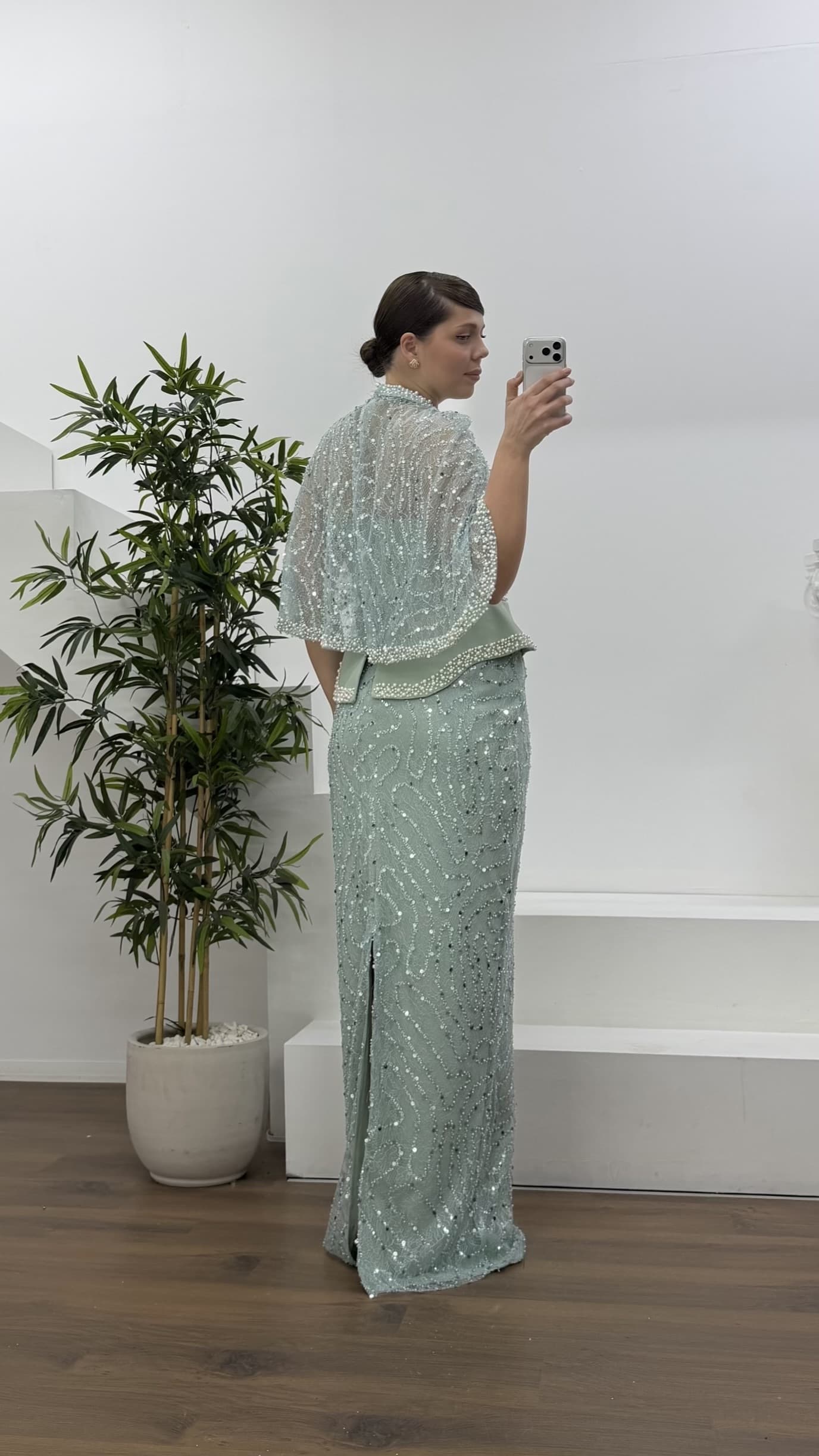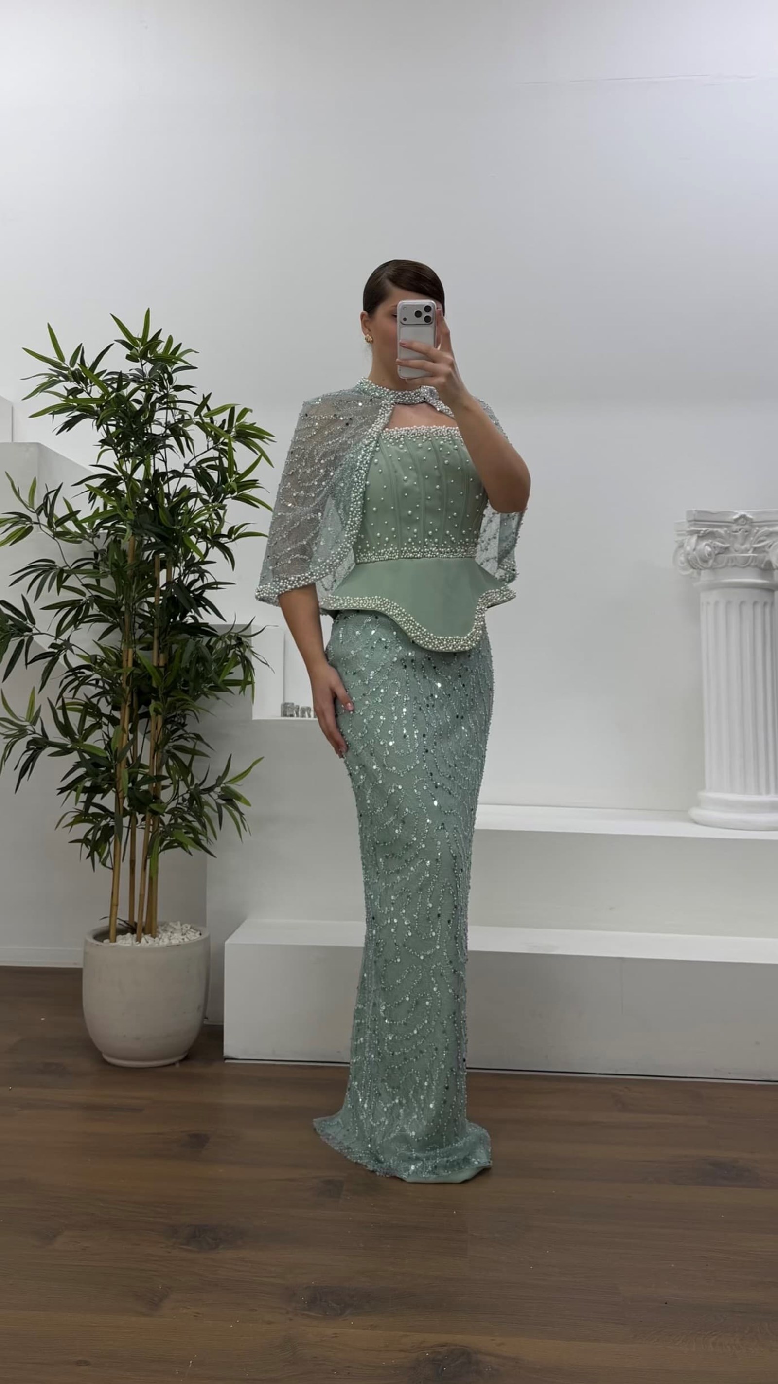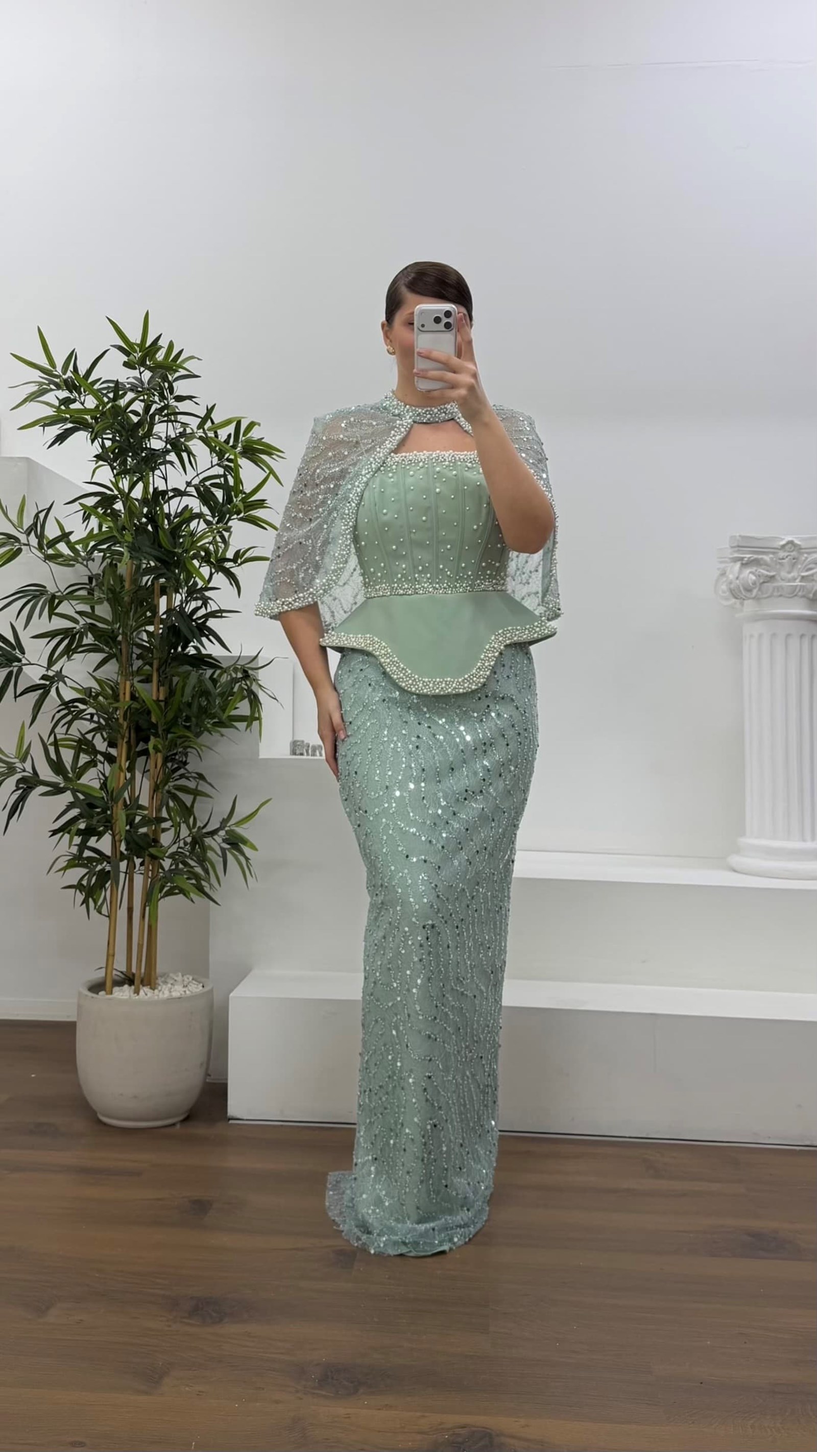 • Mint Straplez  Pelerinli Pul Payet Büyük Beden Abiye Elbise