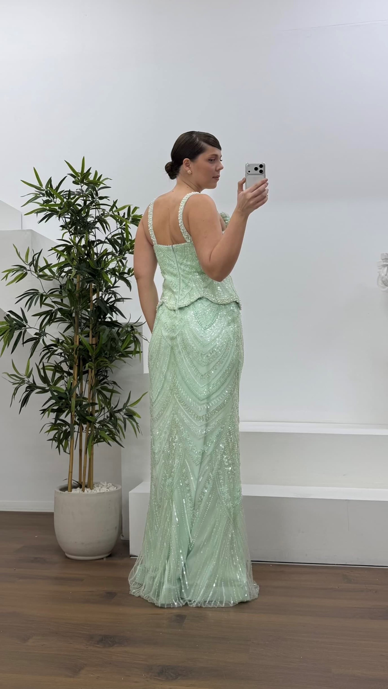 • Mint Dalga Form Peplum Detaylı Kalın Askılı Büyük Beden Abiye Elbise