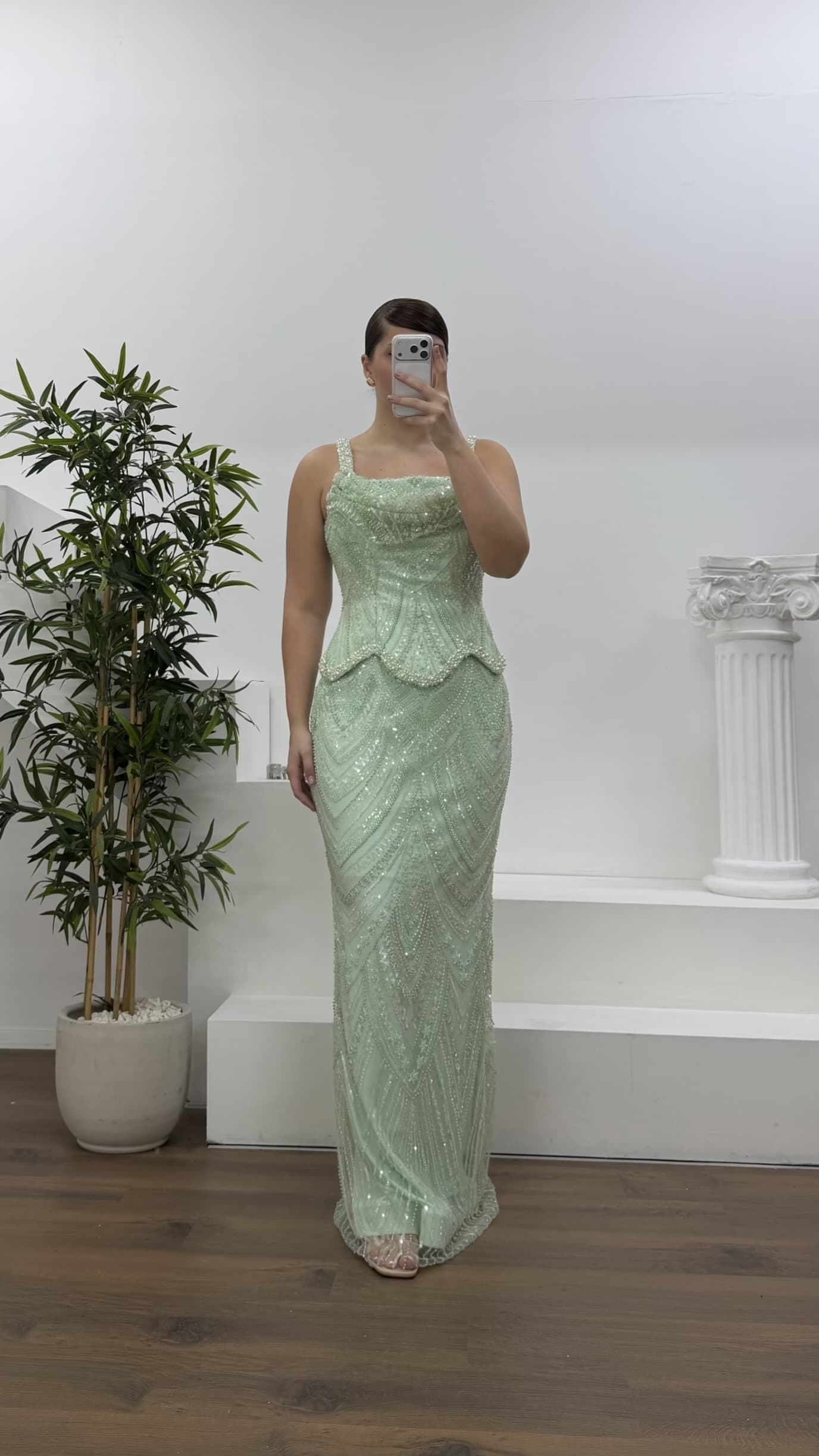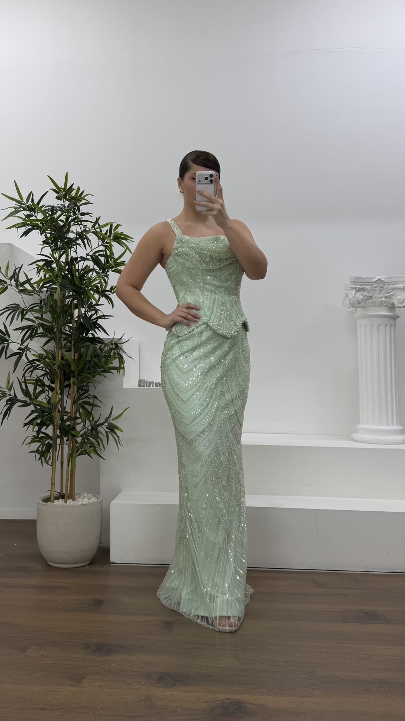 Mint Dalga Form Peplum Detaylı Kalın Askılı Büyük Beden Abiye Elbise