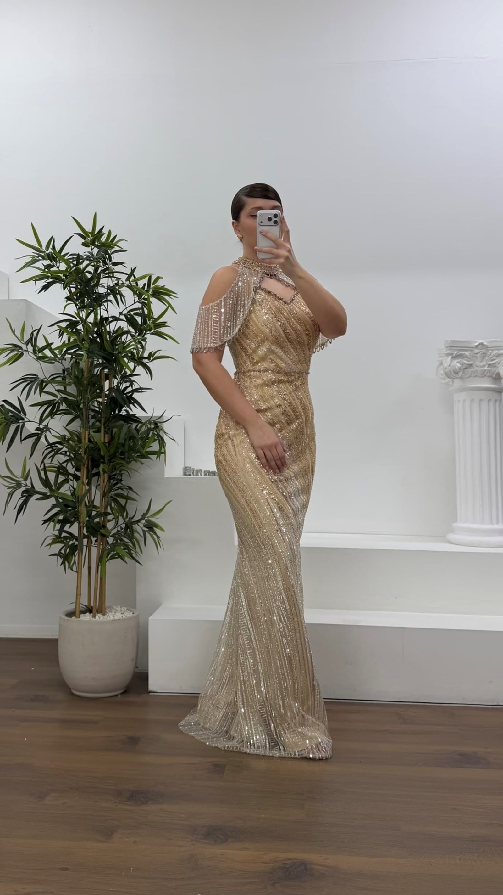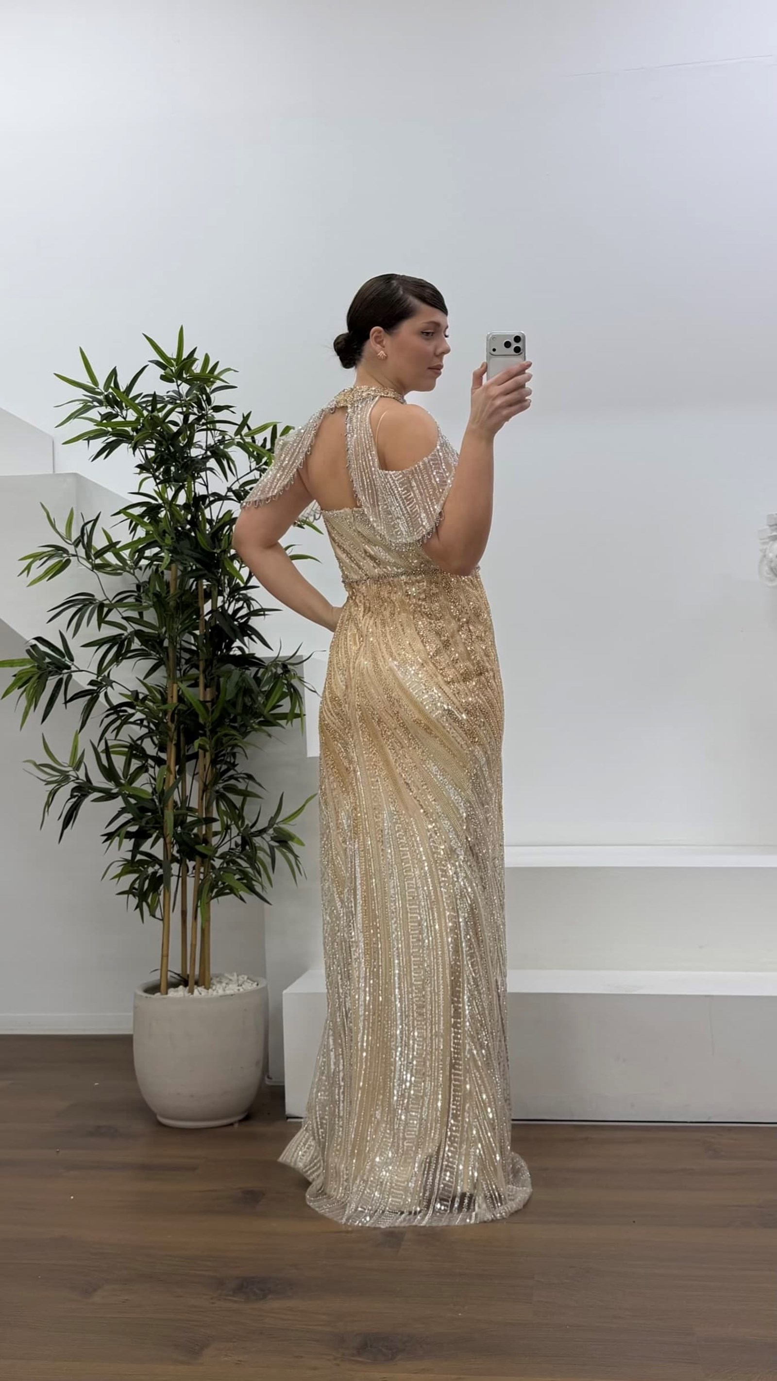 • Gold Halter Yaka Şal Detaylı Pul Payet Büyük Beden Abiye Elbise