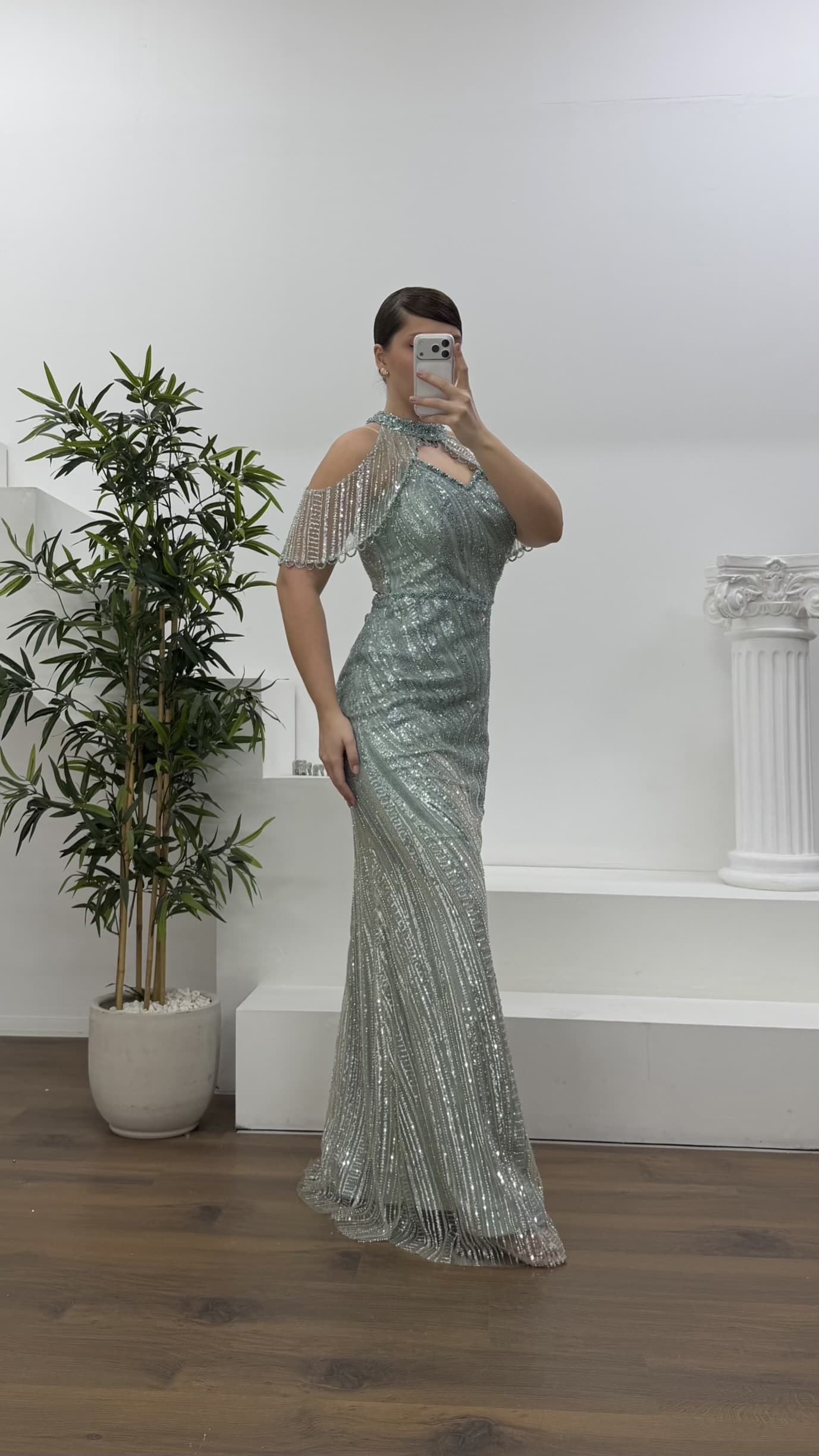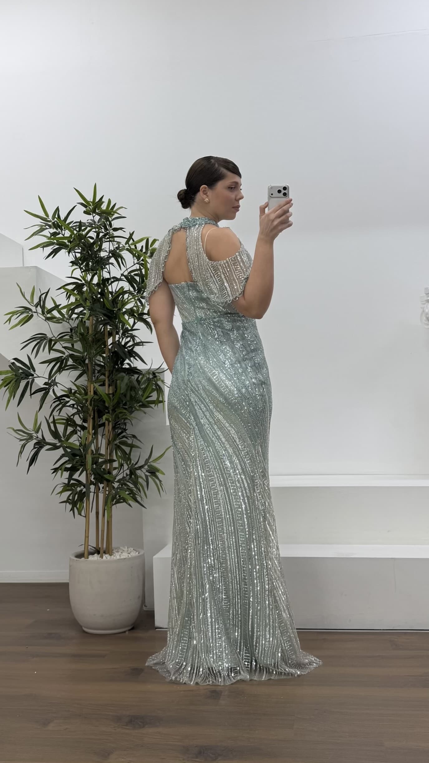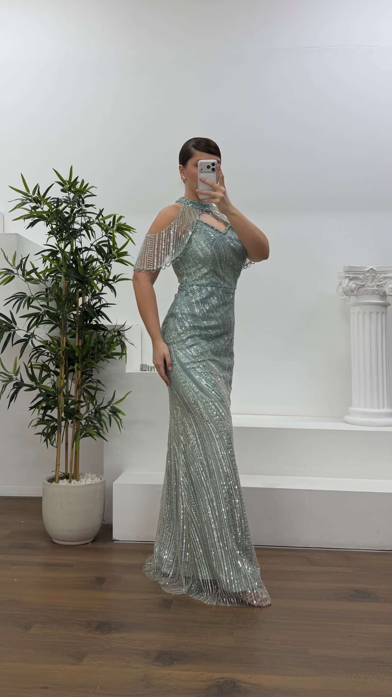 • Mint Halter Yaka Şal Detaylı Pul Payet Büyük Beden Abiye Elbise