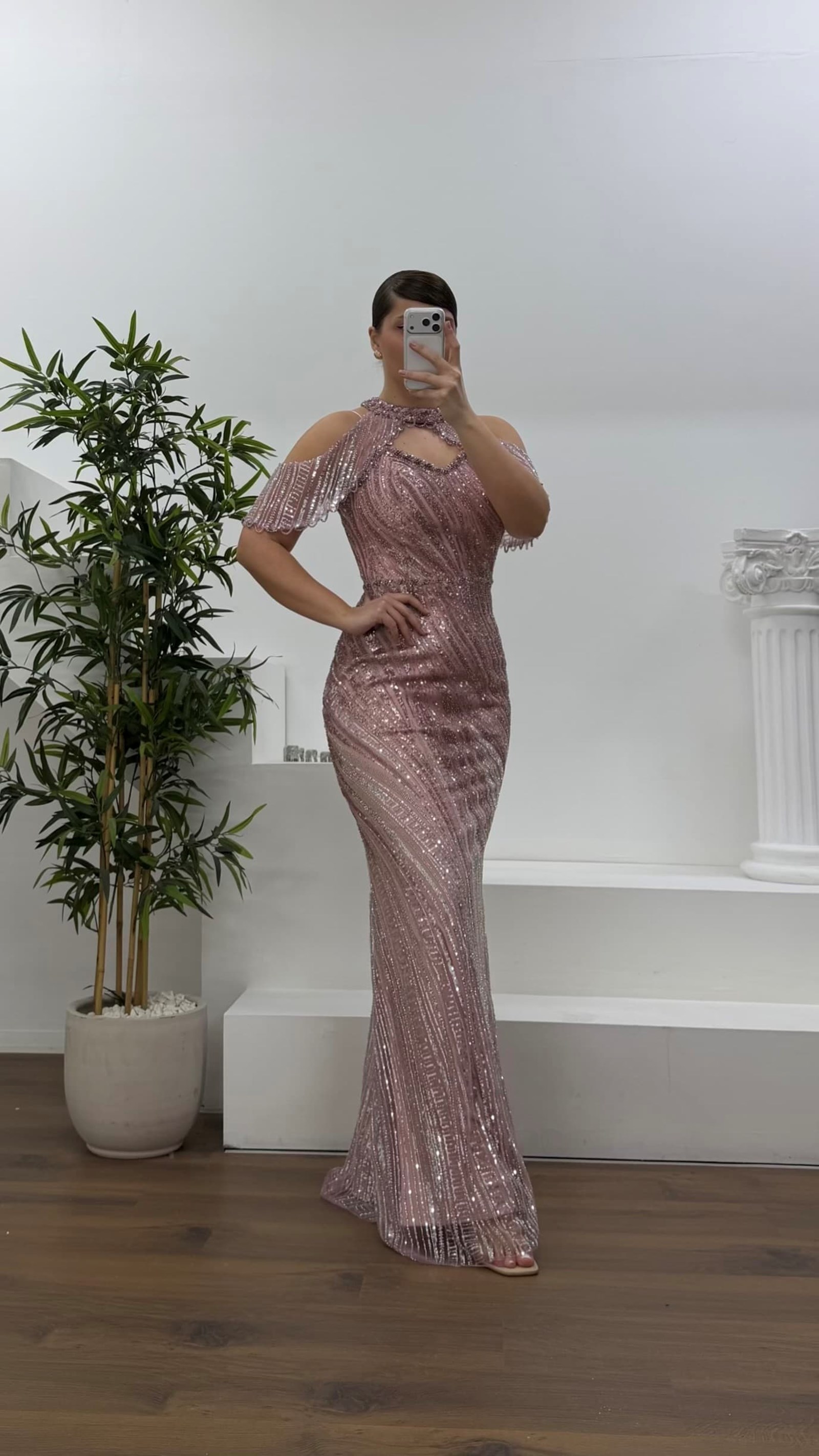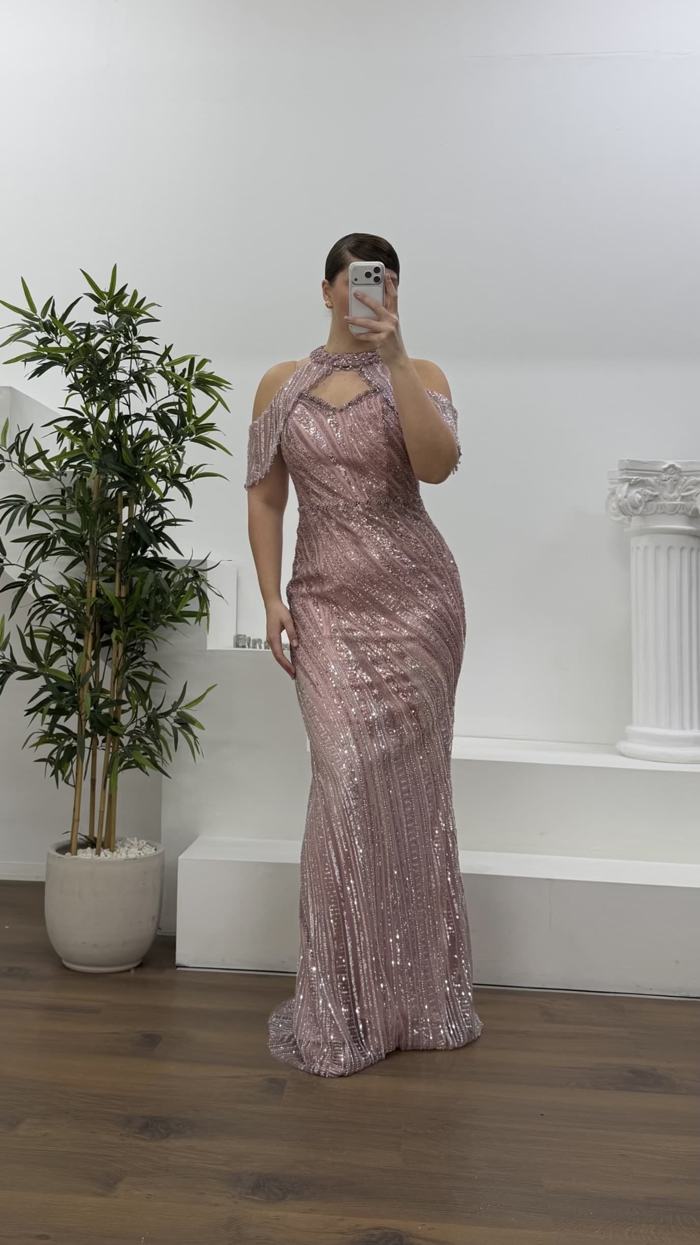 Pudra Halter Yaka Şal Detaylı Pul Payet Büyük Beden Abiye Elbise