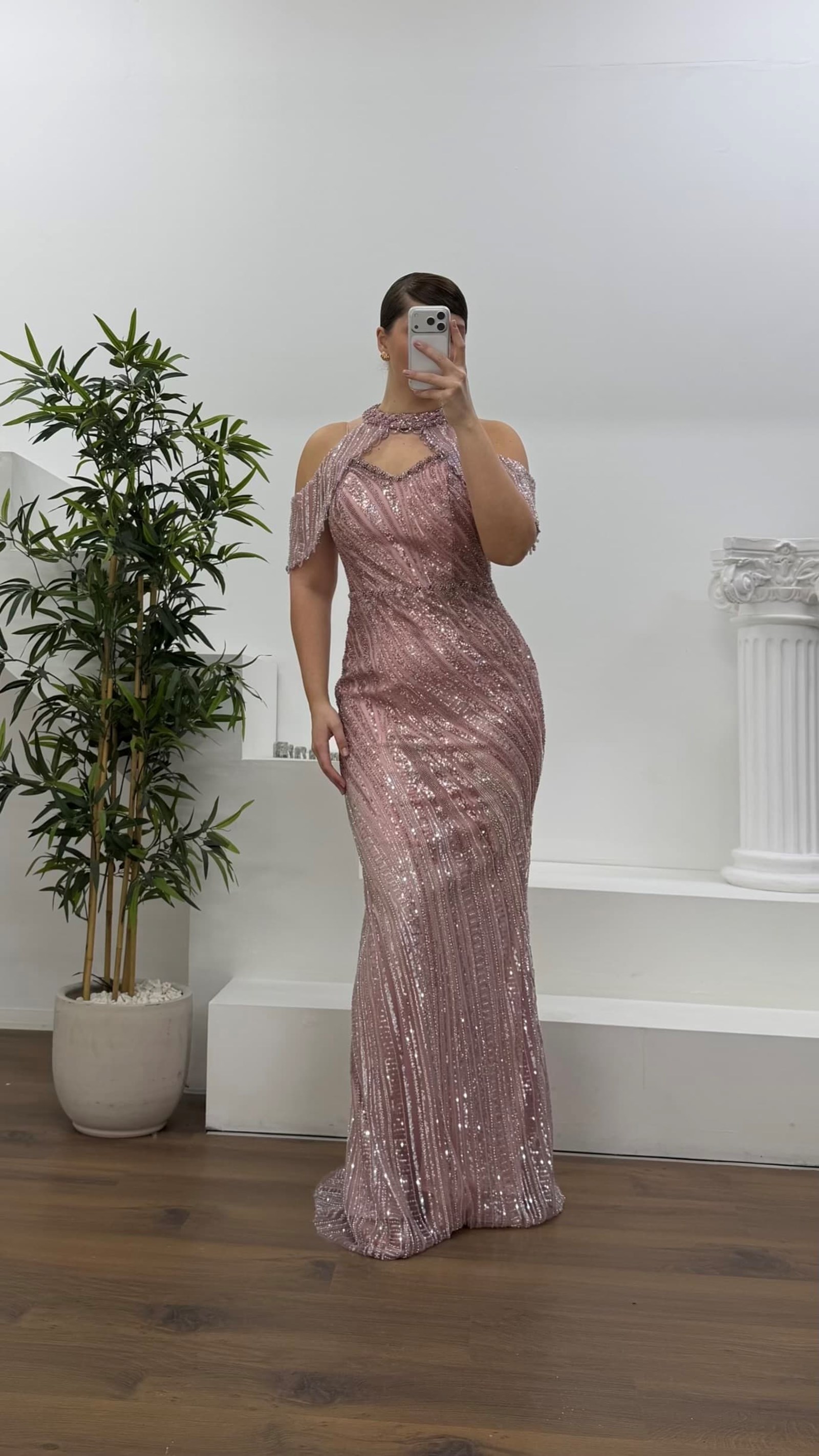 • Pudra Halter Yaka Şal Detaylı Pul Payet Büyük Beden Abiye Elbise