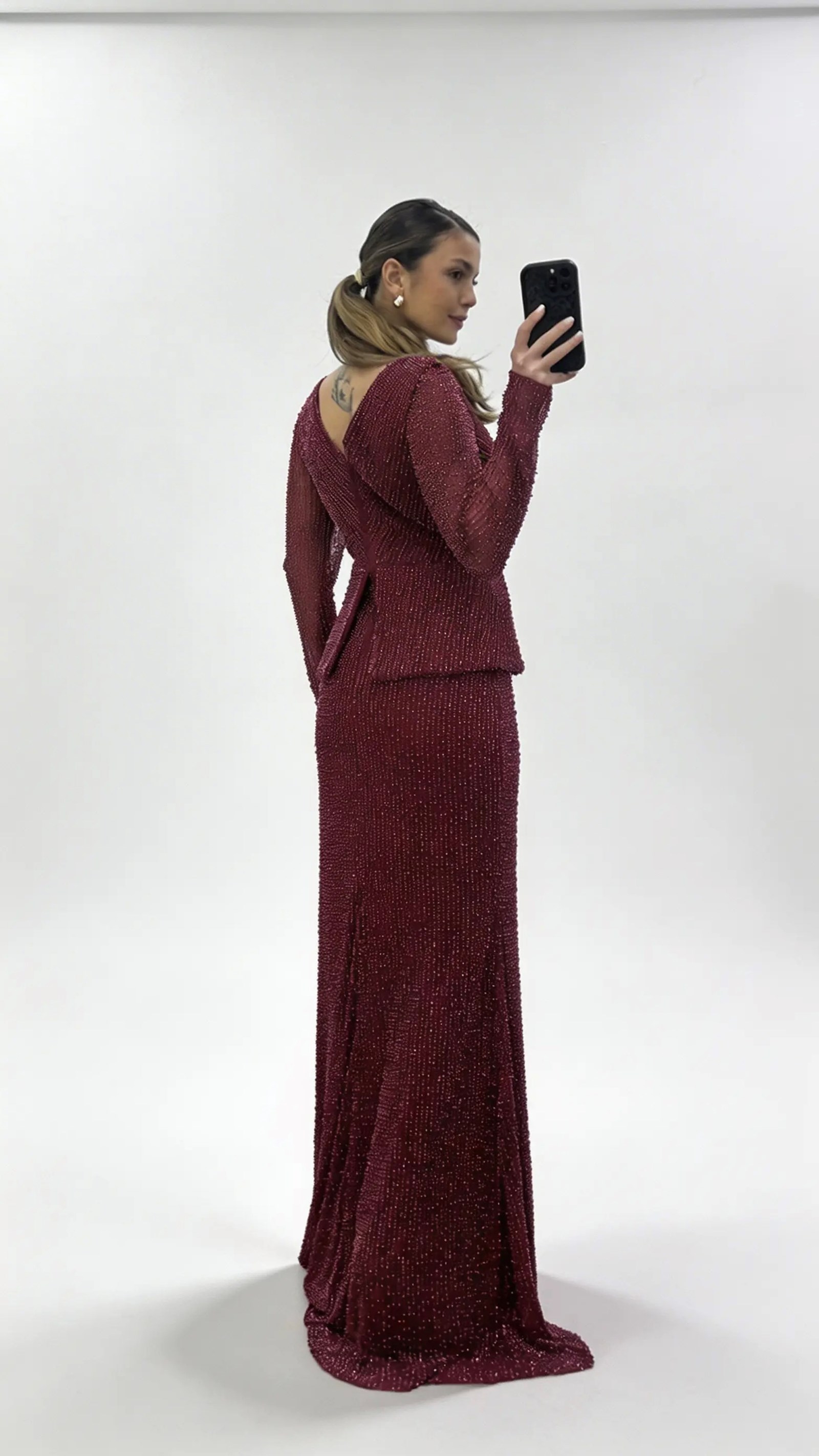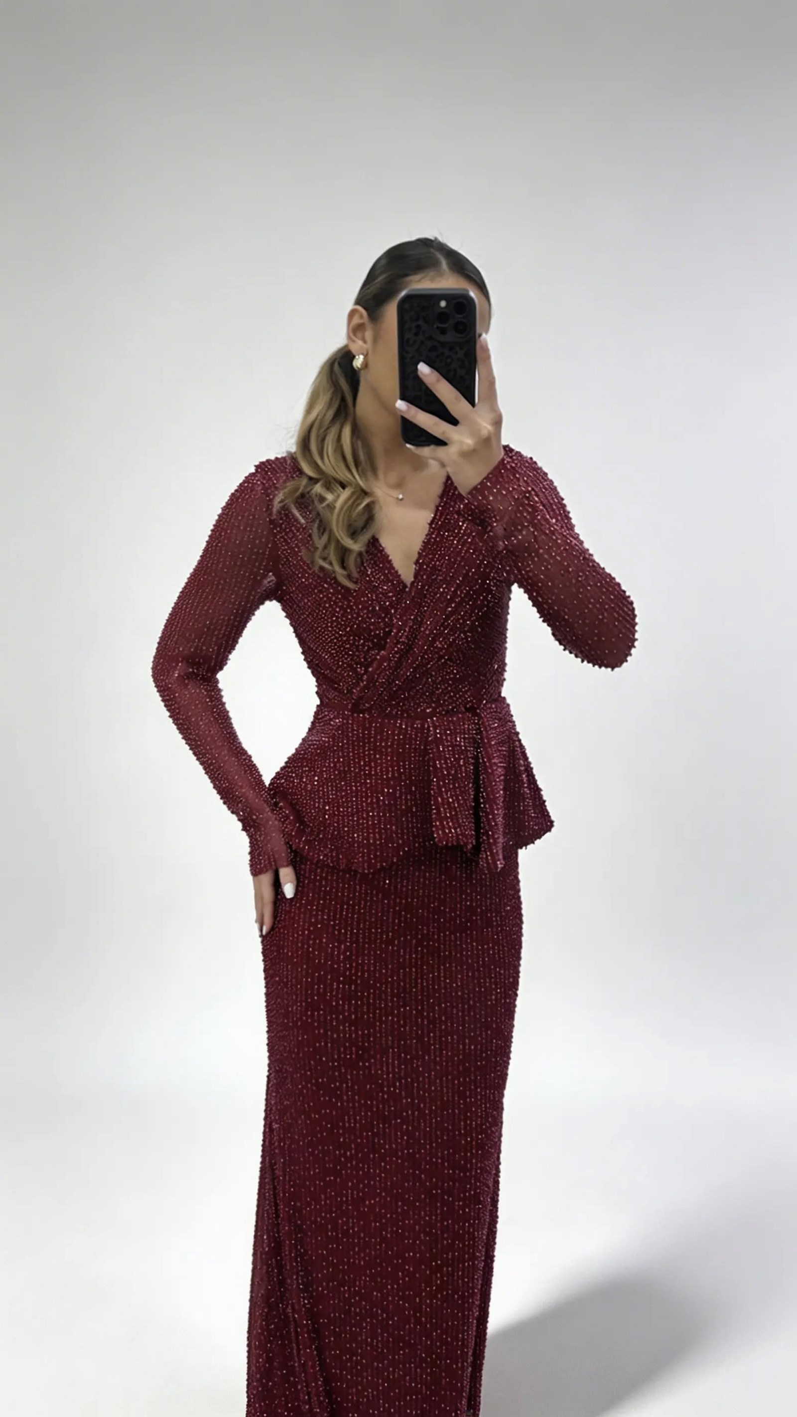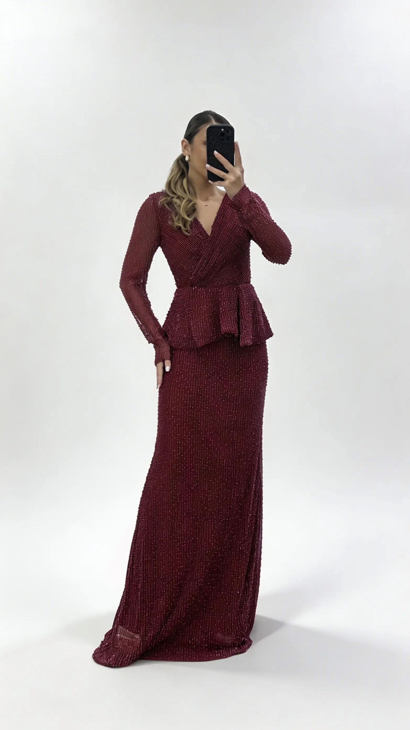 Bordo V Yaka Peplum Taş İşlemeli Uzun Kollu Abiye Elbise