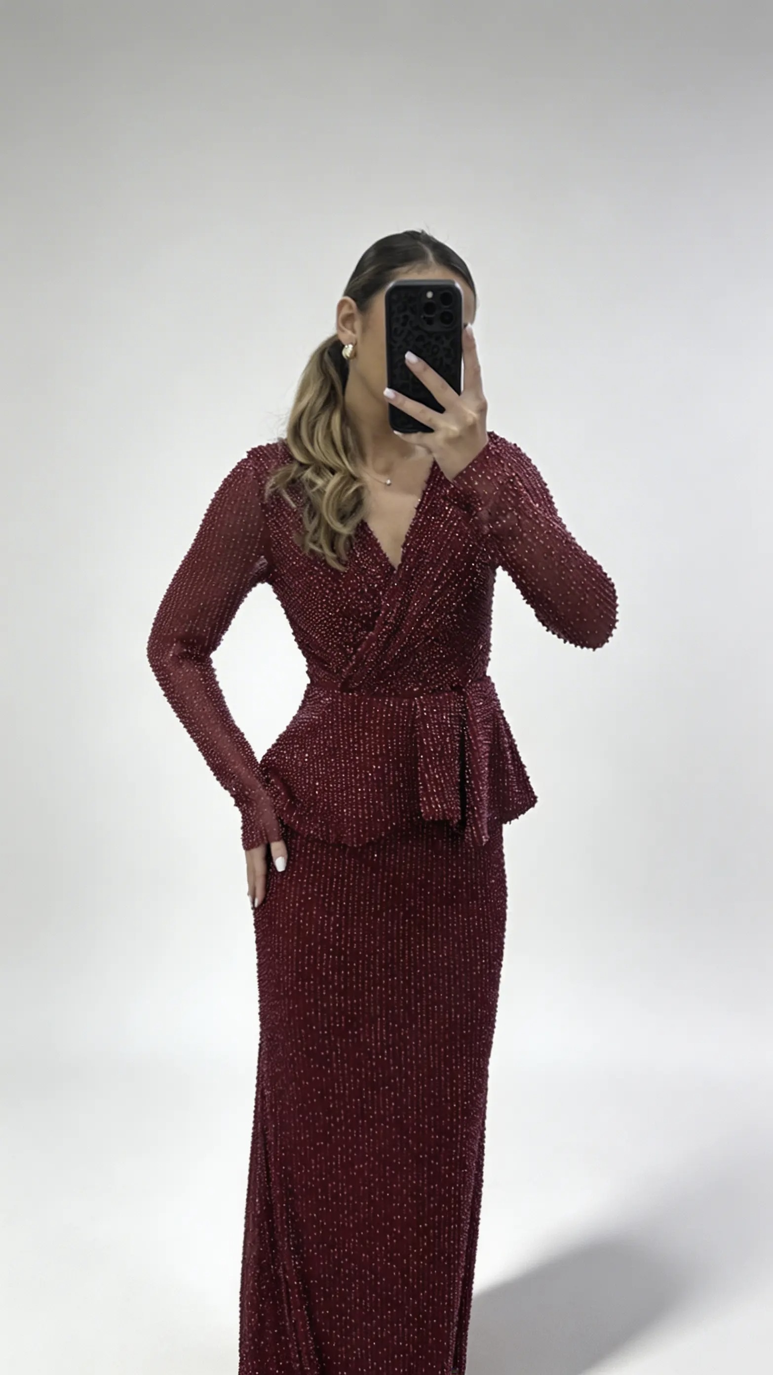 • Bordo V Yaka Peplum Taş İşlemeli Uzun Kollu Abiye Elbise