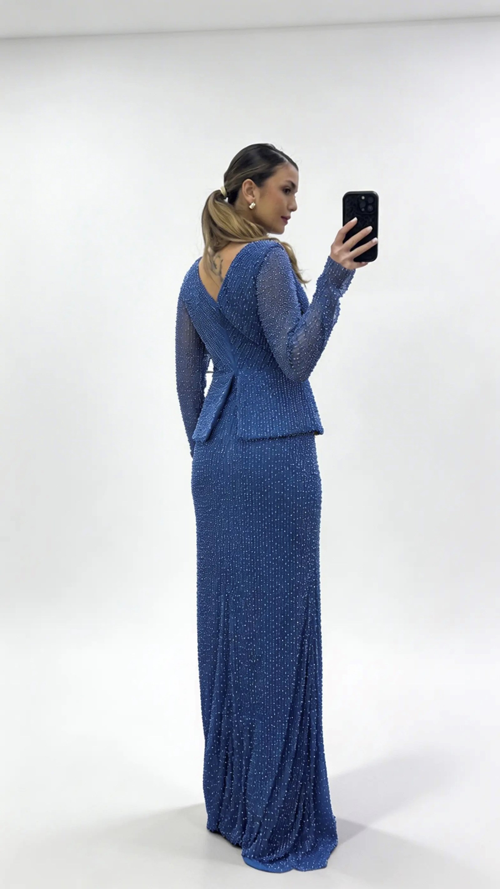 İndigo V Yaka Peplum Taş İşlemeli Uzun Kollu Abiye Elbise