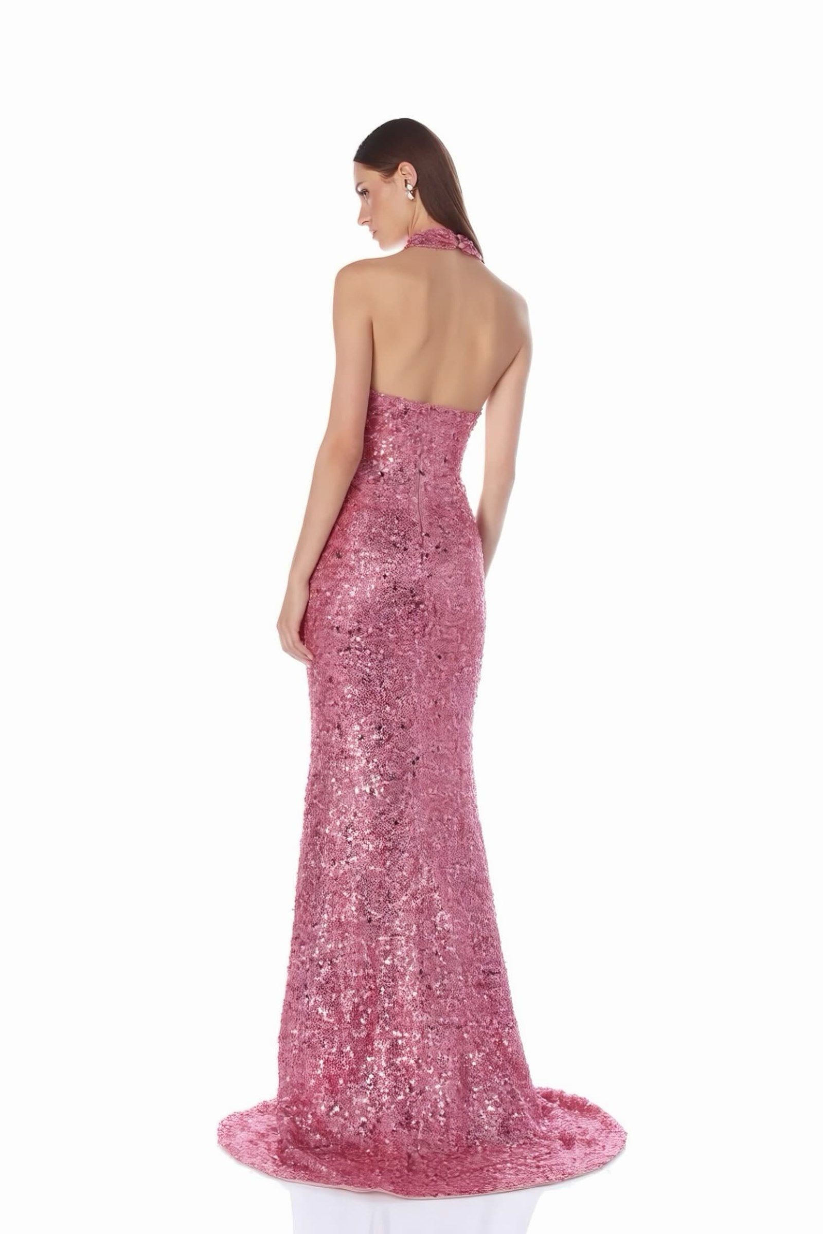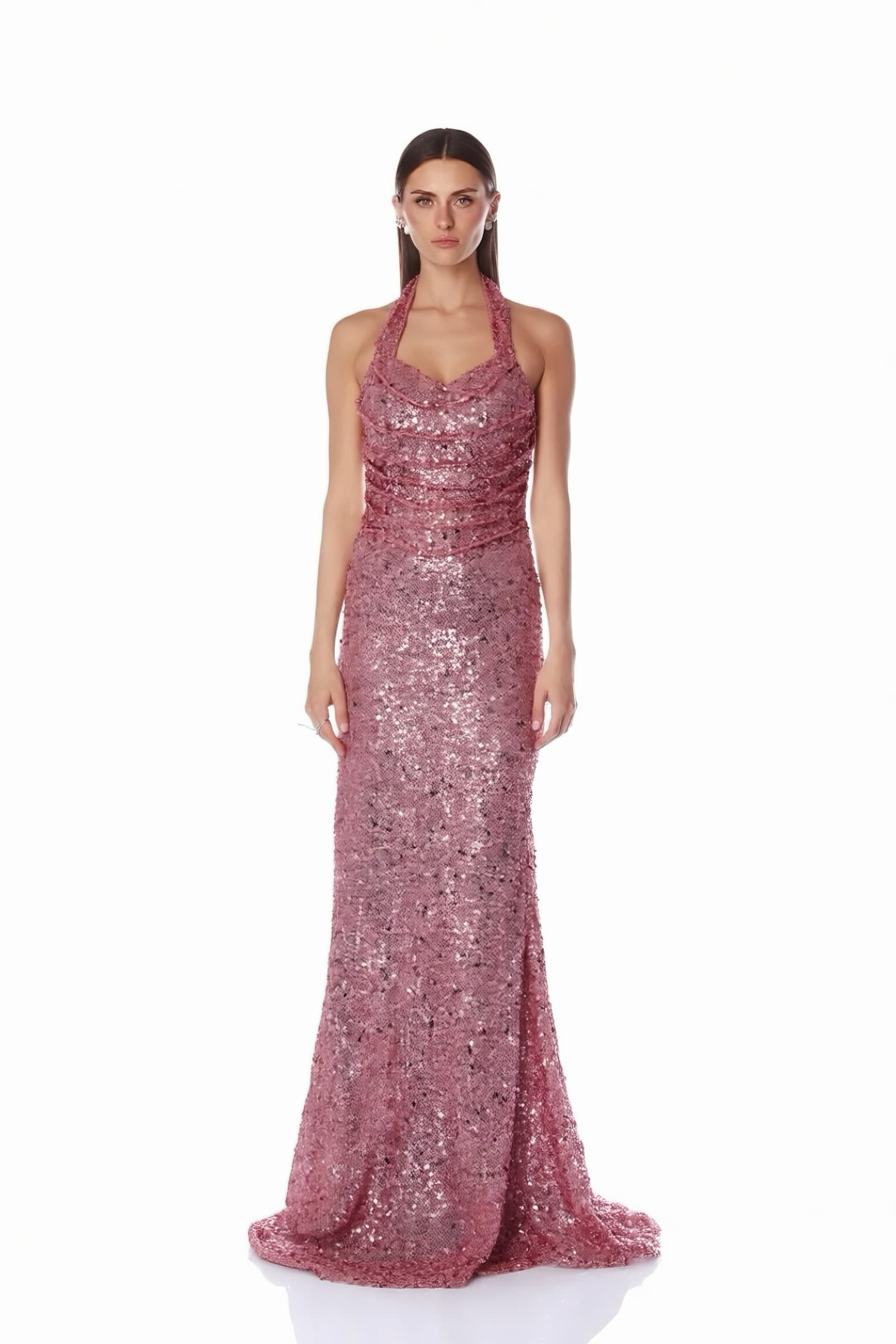 Gül Kurusu Halter Yaka Işıltılı Uzun Abiye Elbise