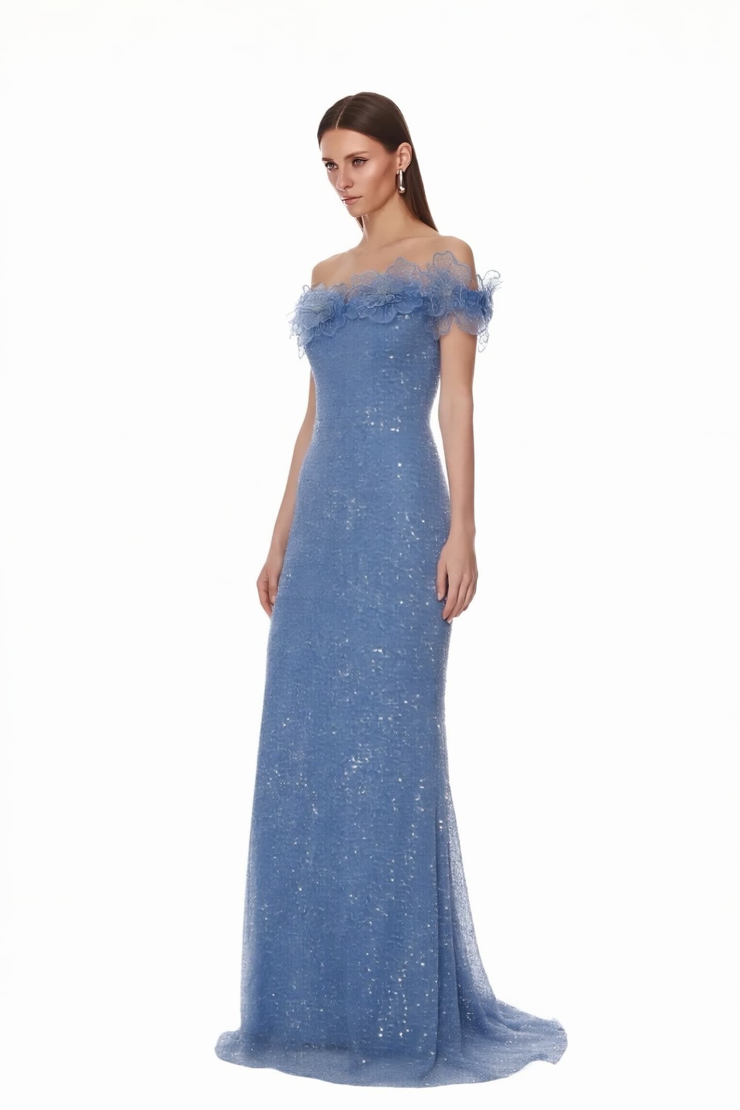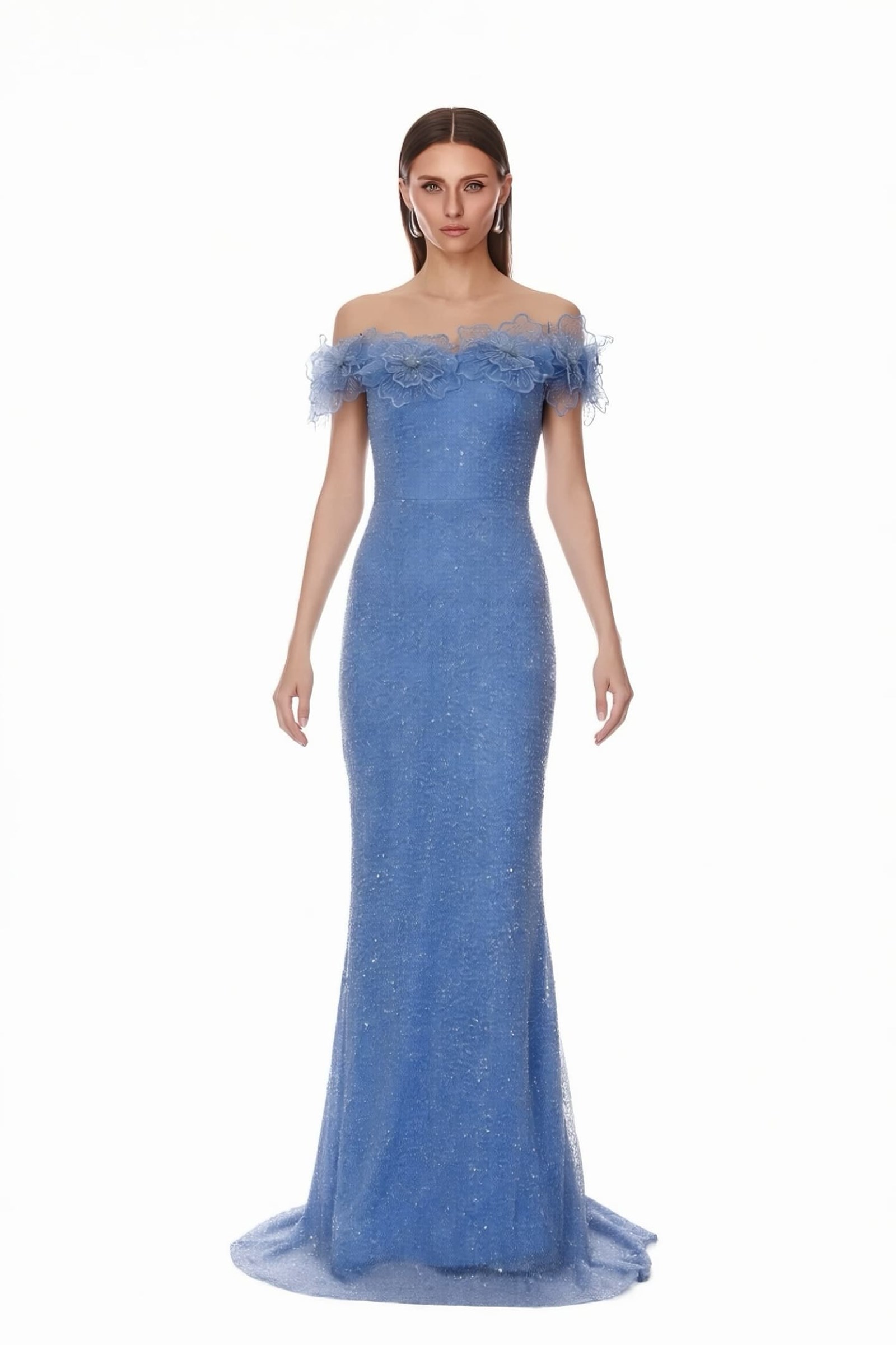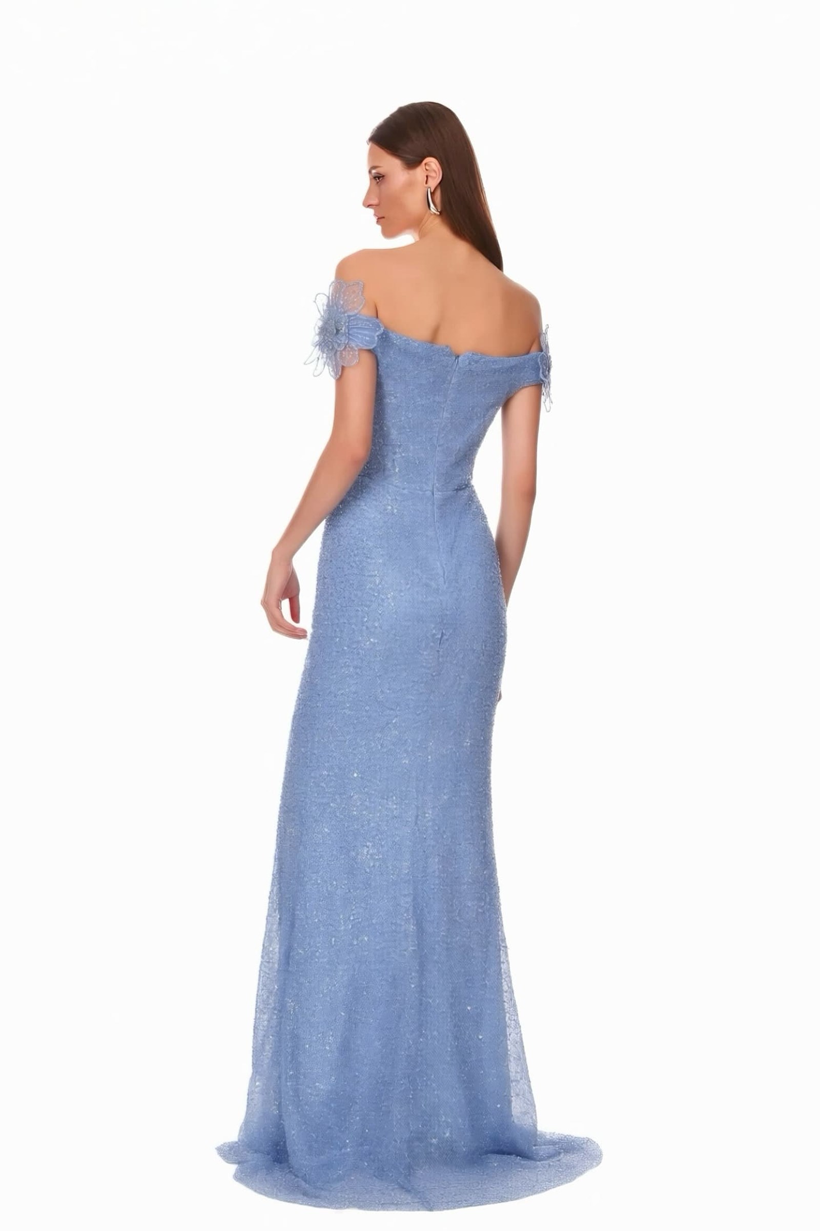 • Mavi Çiçek Nakışlı Payetli Abiye Elbise