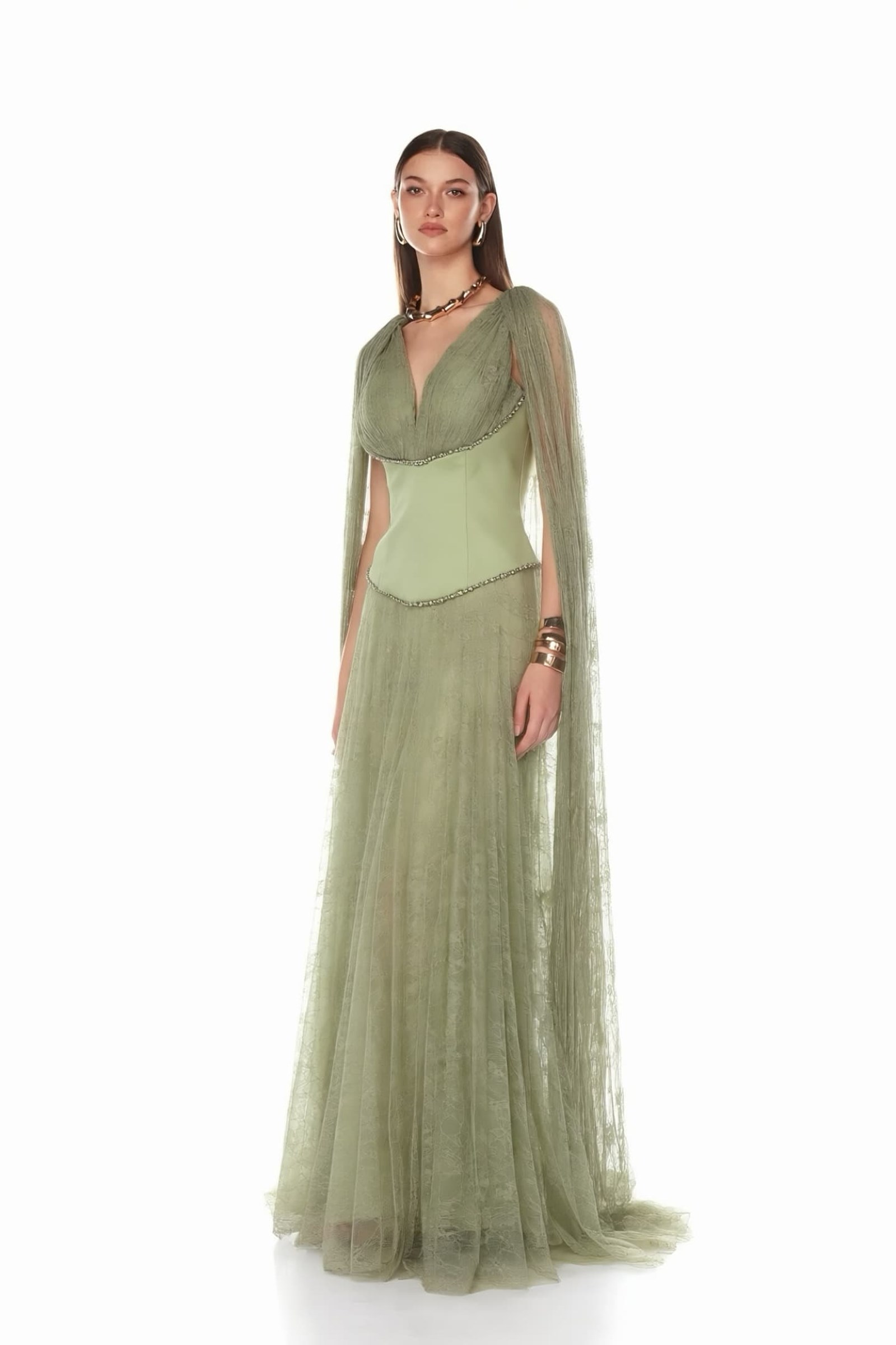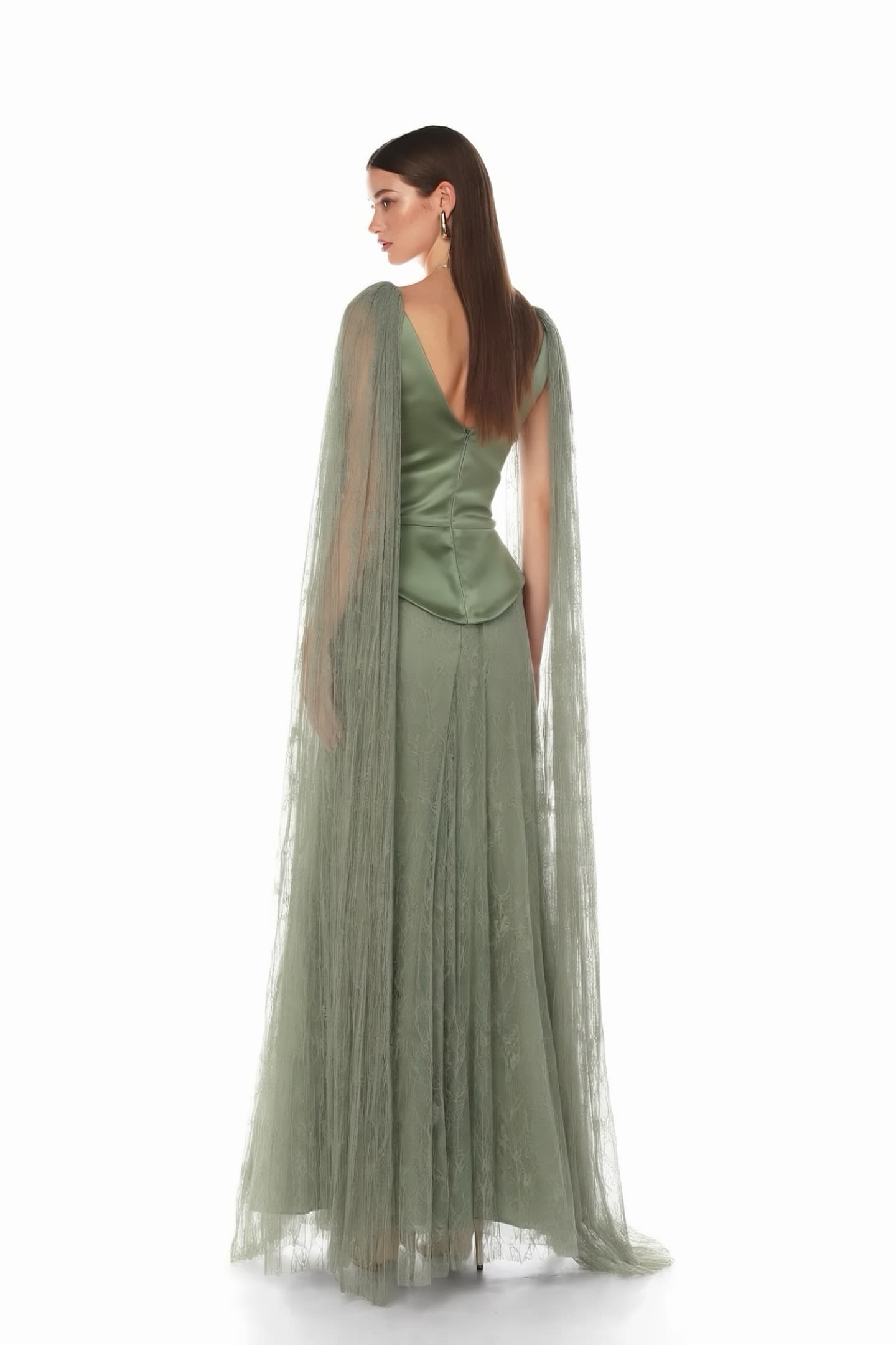 • Kahverengi Dantel Pelerinli Abiye Elbise