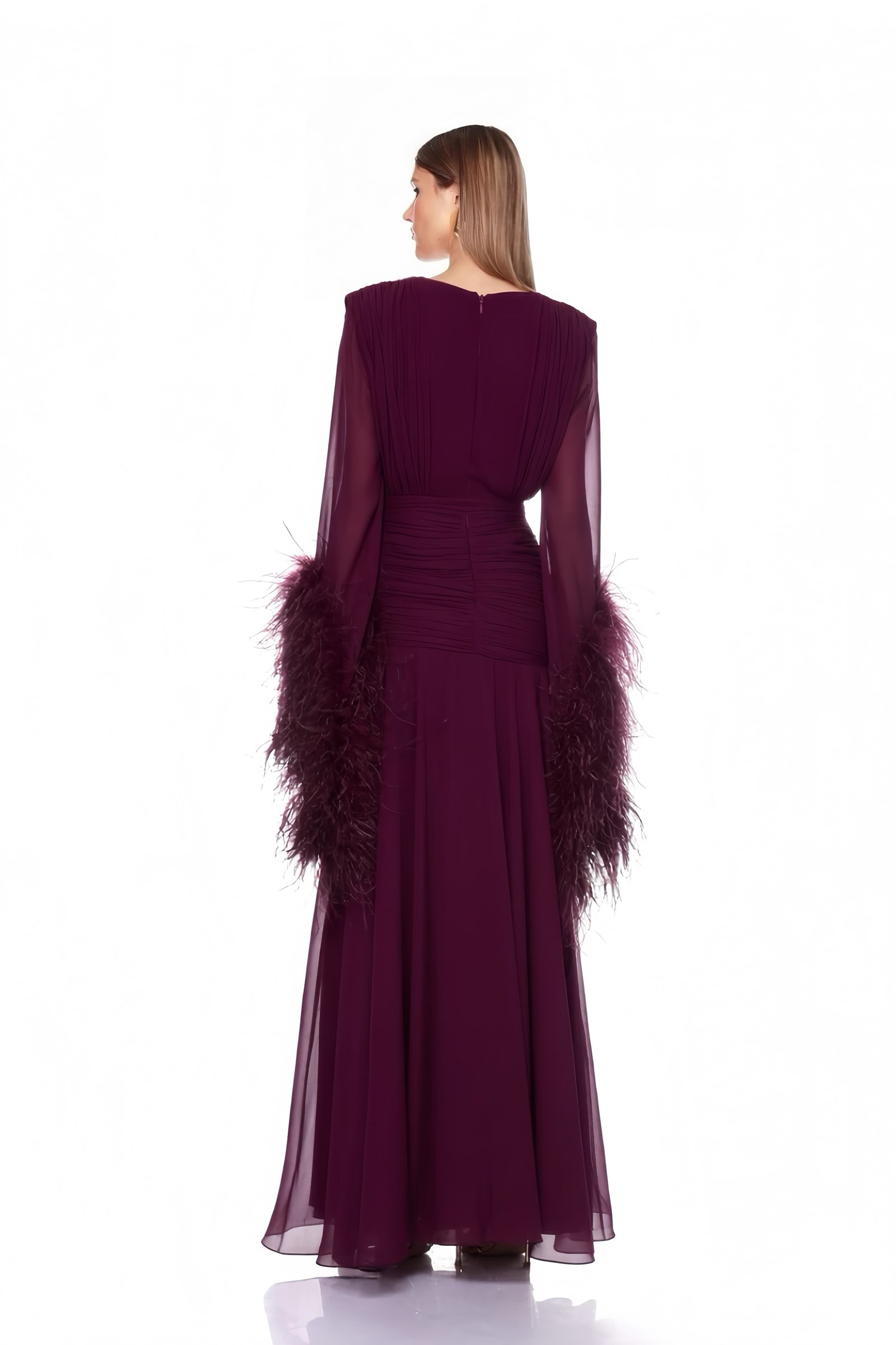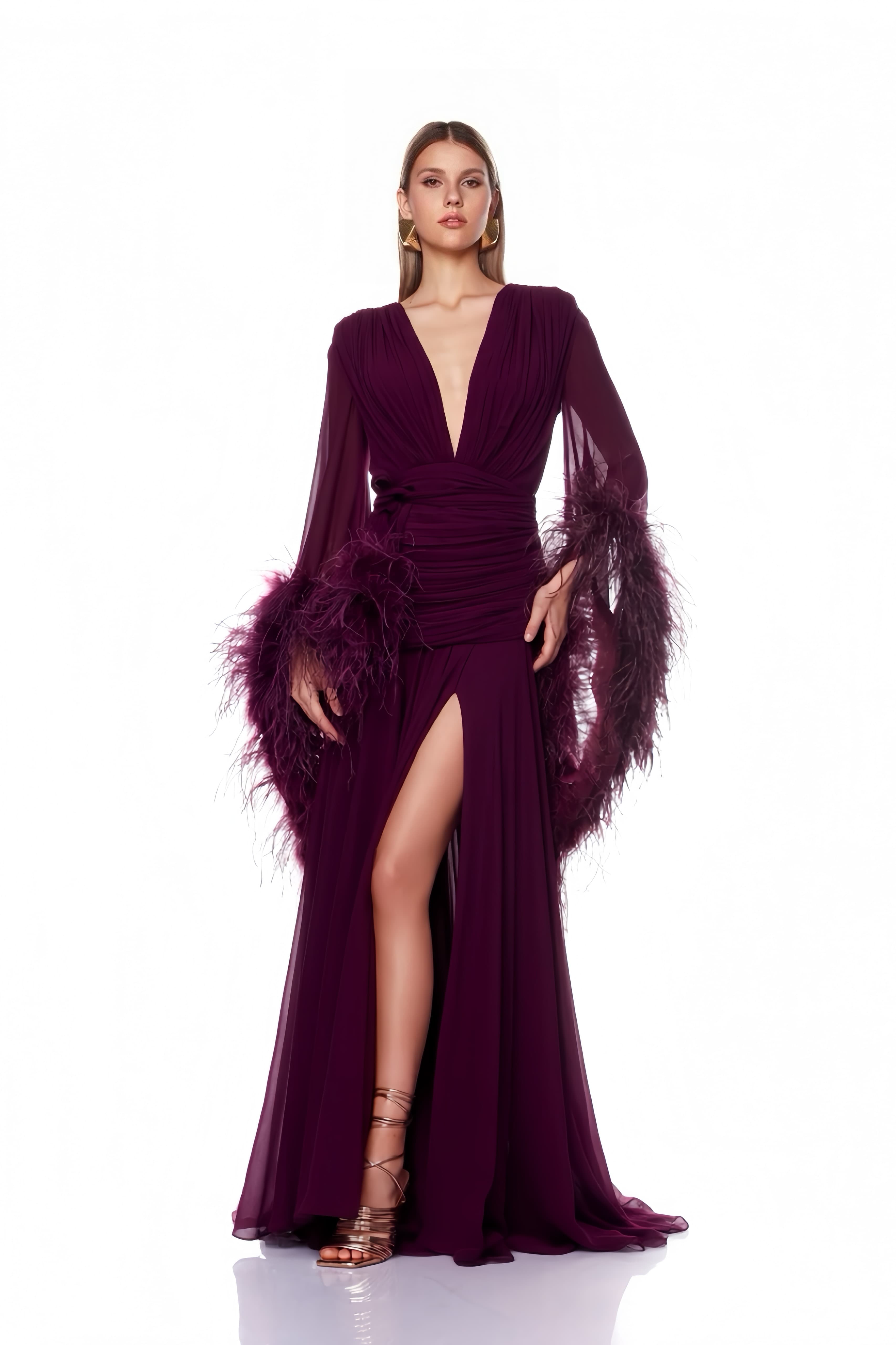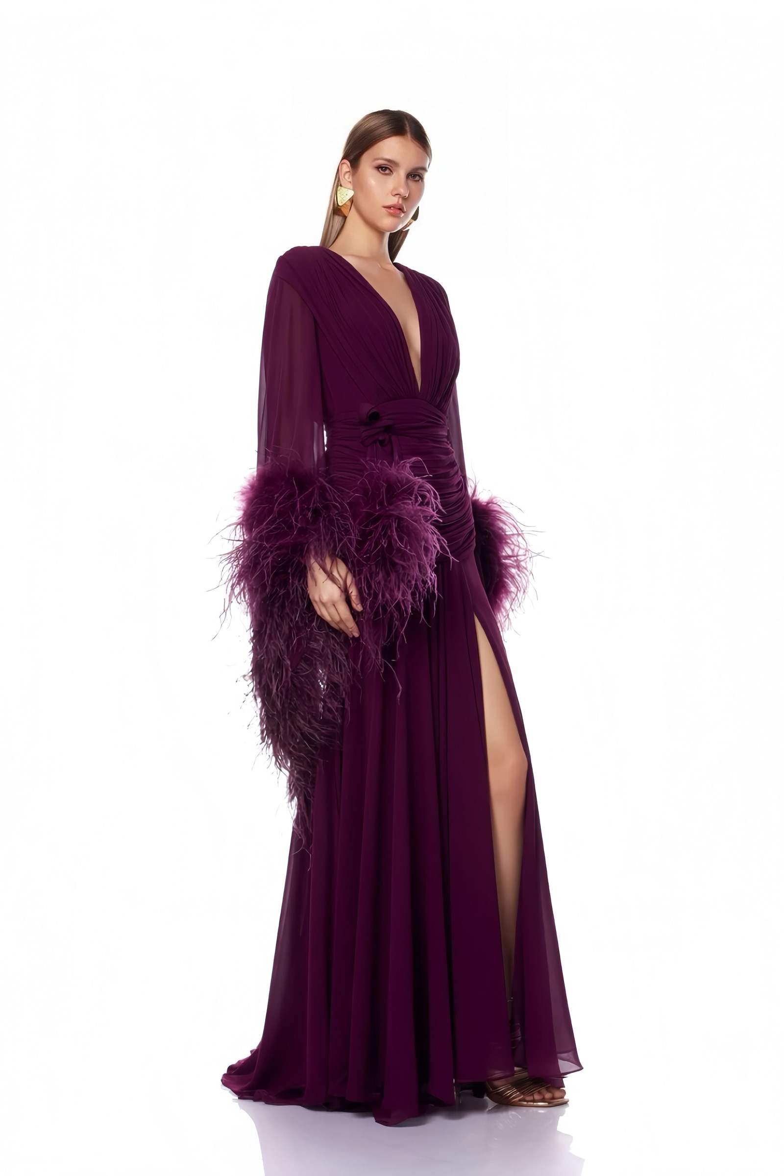 Mürdüm Derin V Yaka Tüylü Abiye Elbise