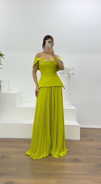 • yeni-gelen-en.png Gold Strapless Evening Dress with Tulle Sleeve Detail