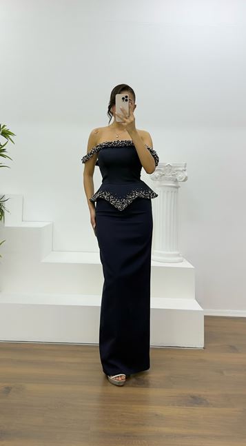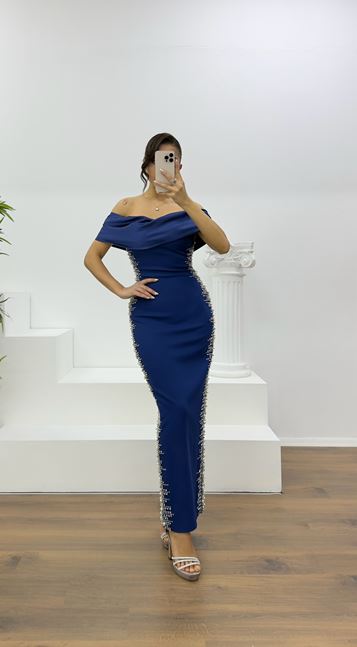 • yeni-gelen-en.png Indigo Strapless Evening Dress with Tulle Sleeve Detail