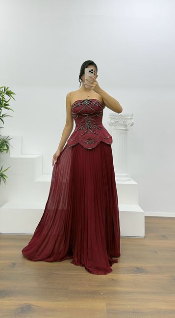 • yeni-gelen-en.png Burgundy Strapless Waist Transparent Lace Evening Dress
