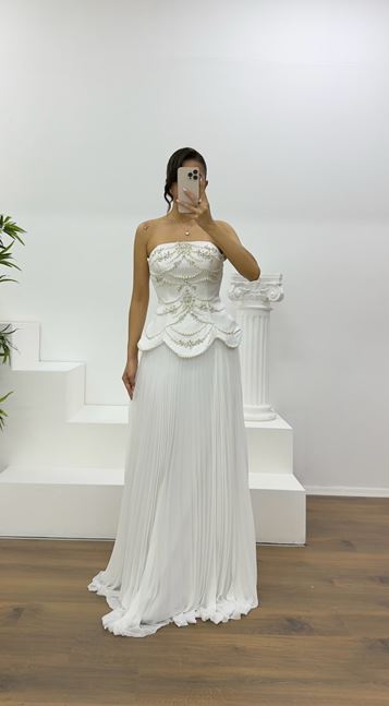 • yeni-gelen-en.png Off-white embroidered evening dress with fringed sleeves.