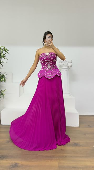 • yeni-gelen-en.png Dark Lilac Strapless Waist Transparent Lace Evening Dress