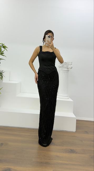 • yeni-gelen-en.png Black Strapless Evening Dress with Tulle Sleeve Detail