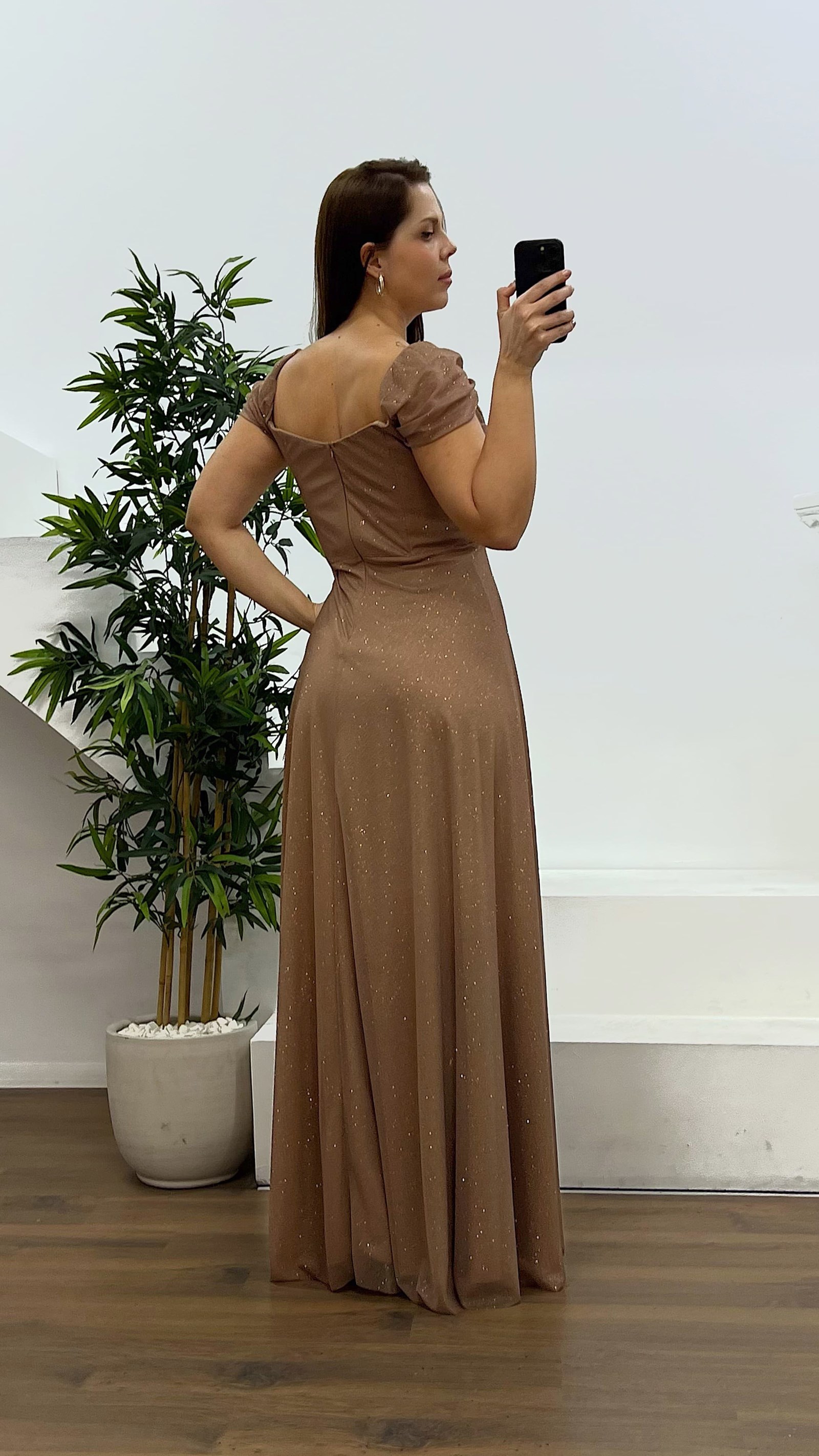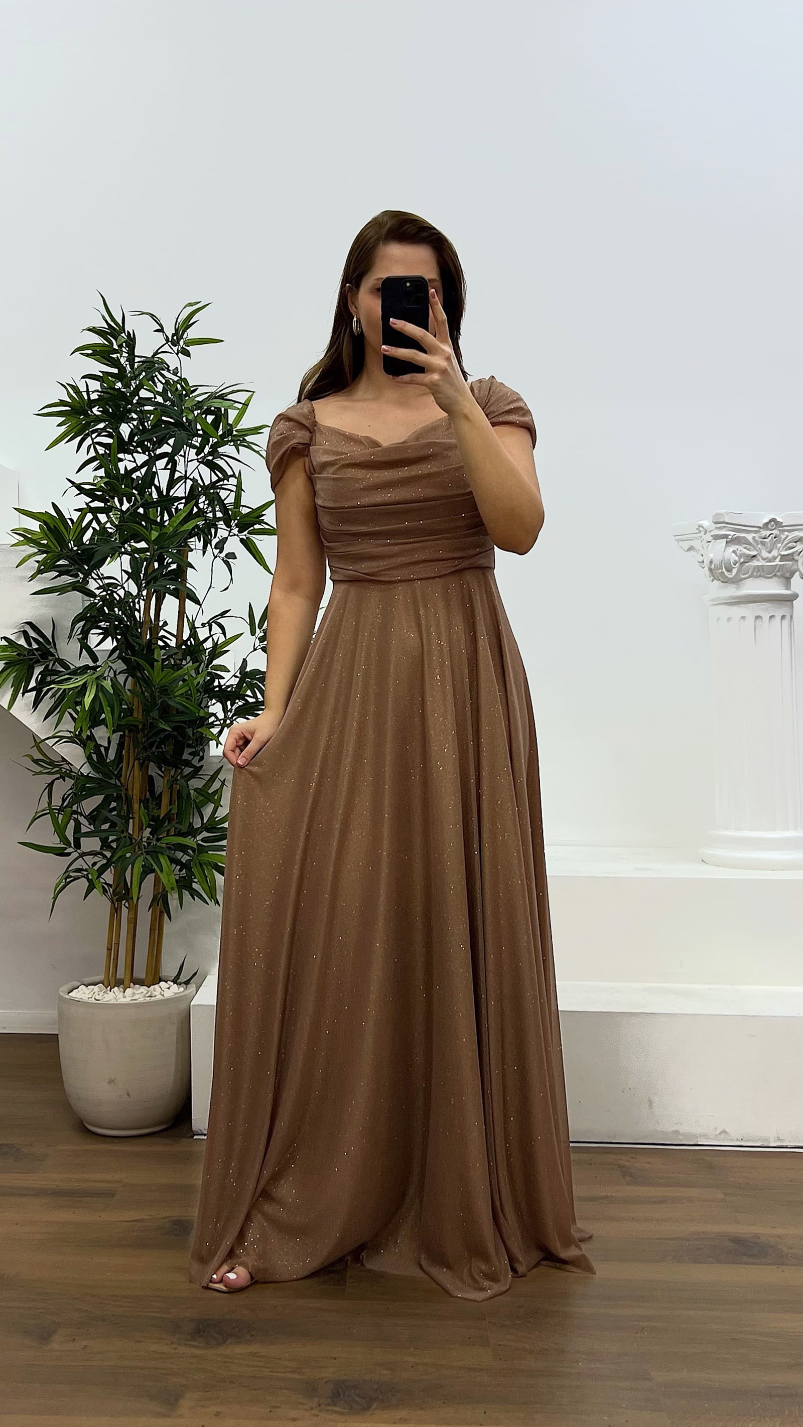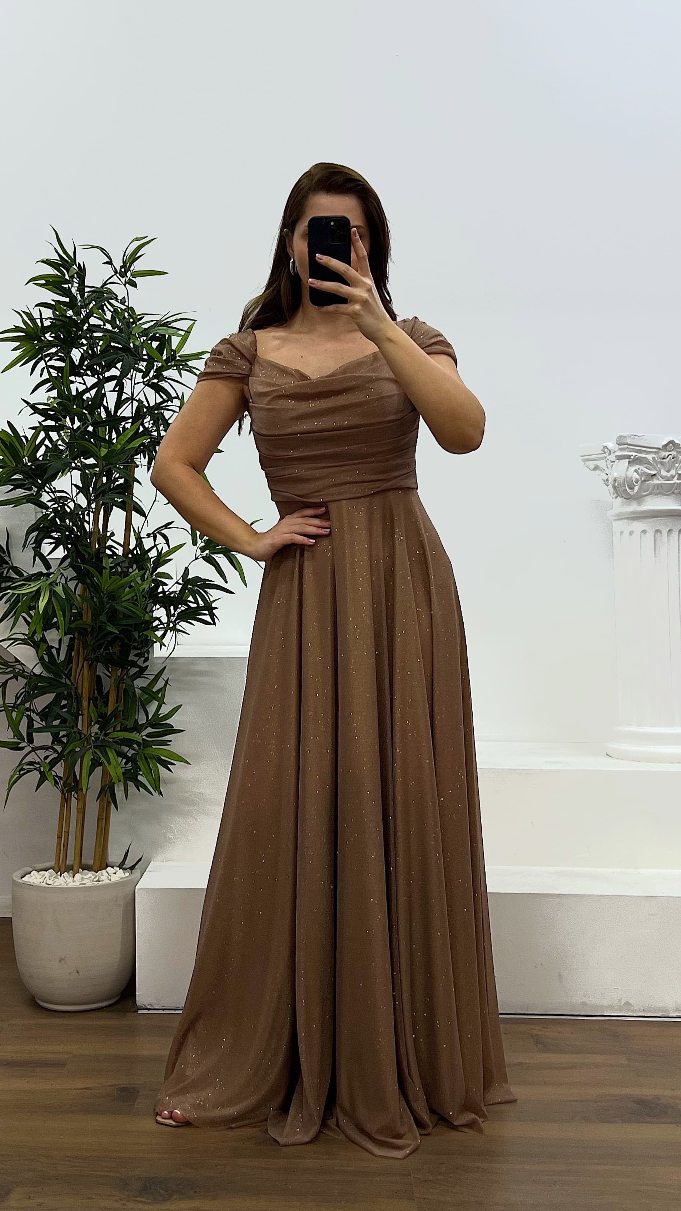 • Bakır Göğsü Drapeli Büyük Beden Abiye Elbise