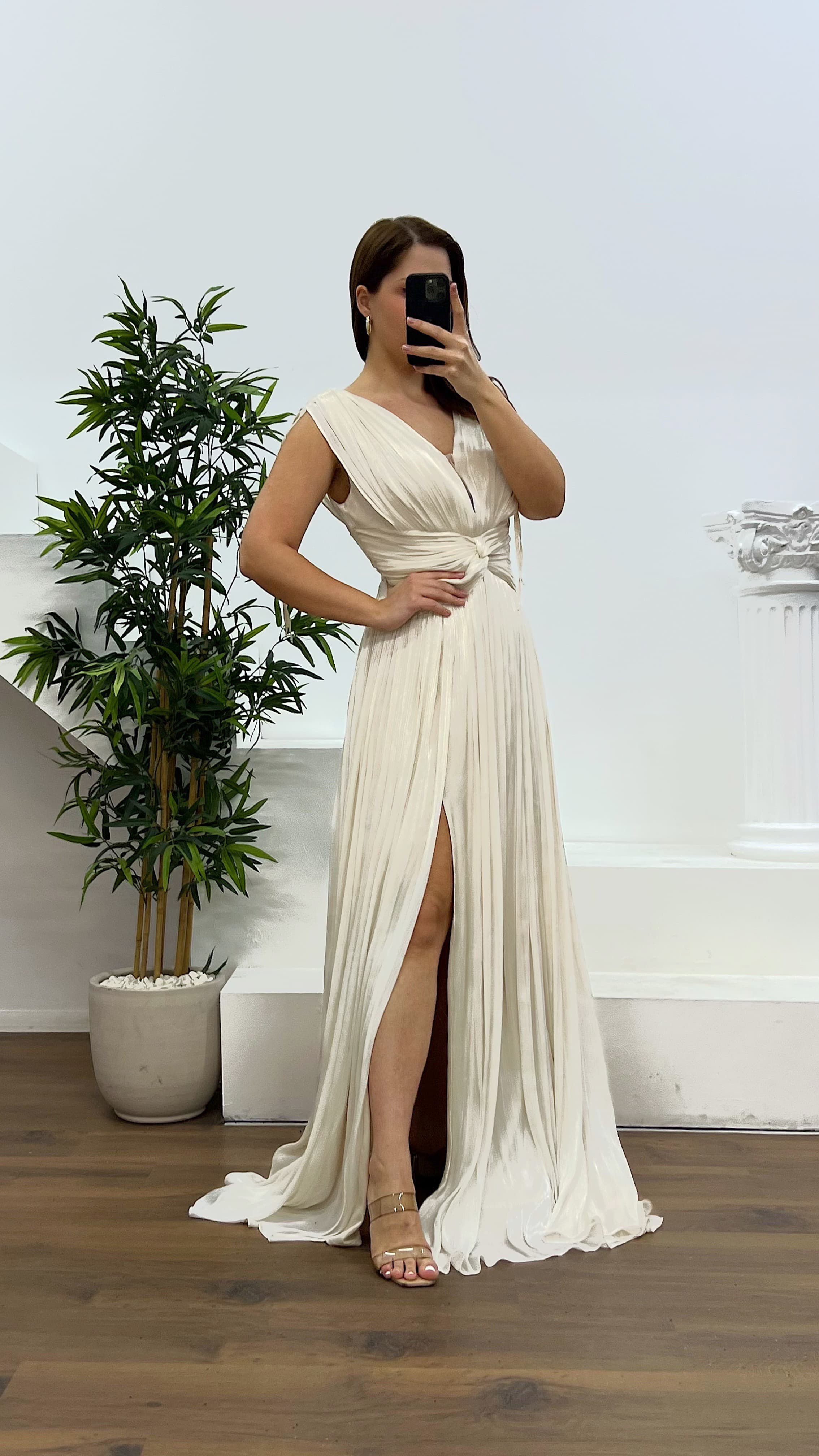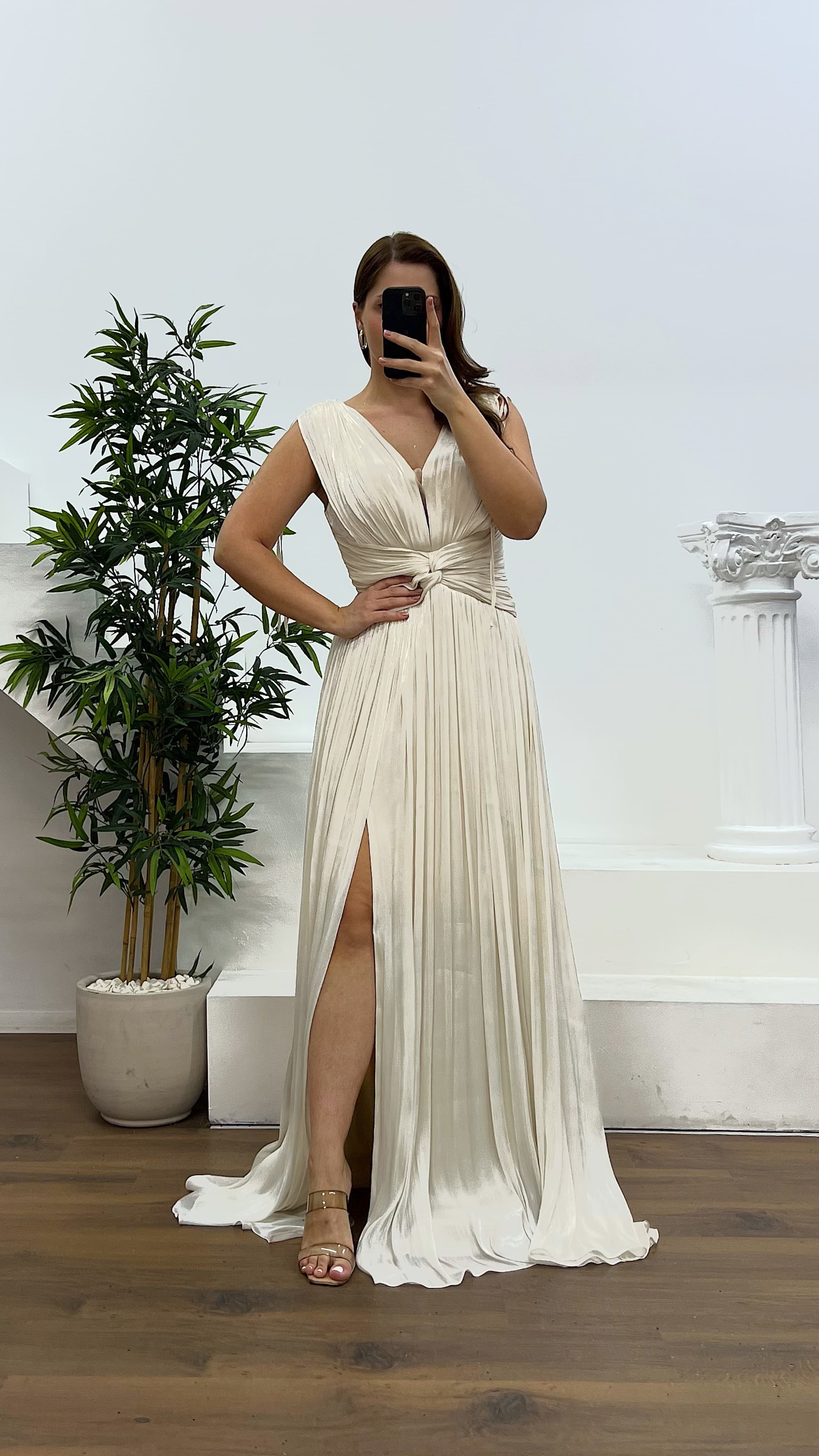 • Soğan Kabuğu V Yaka Piliseli Büyük Beden Abiye Elbise