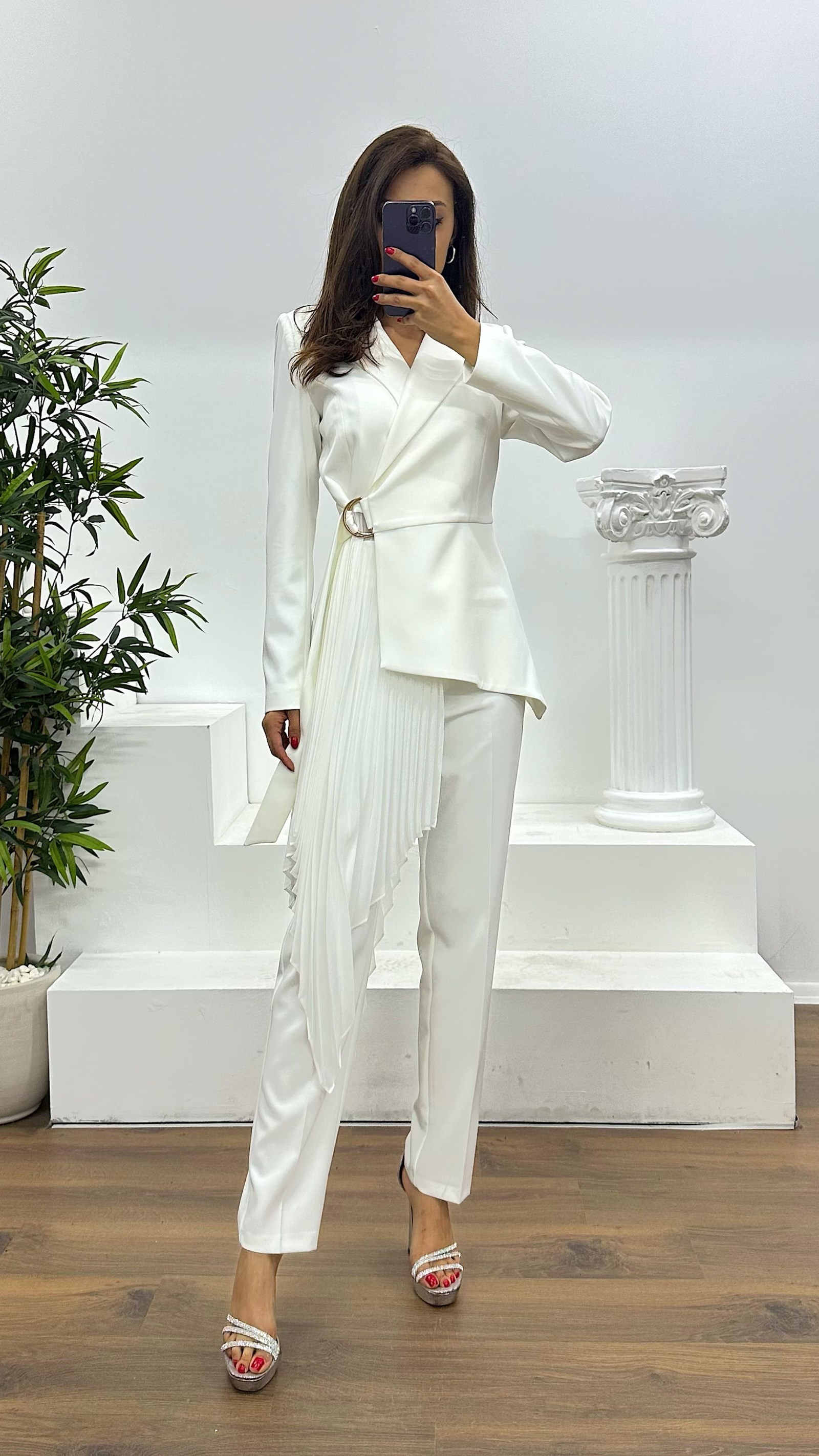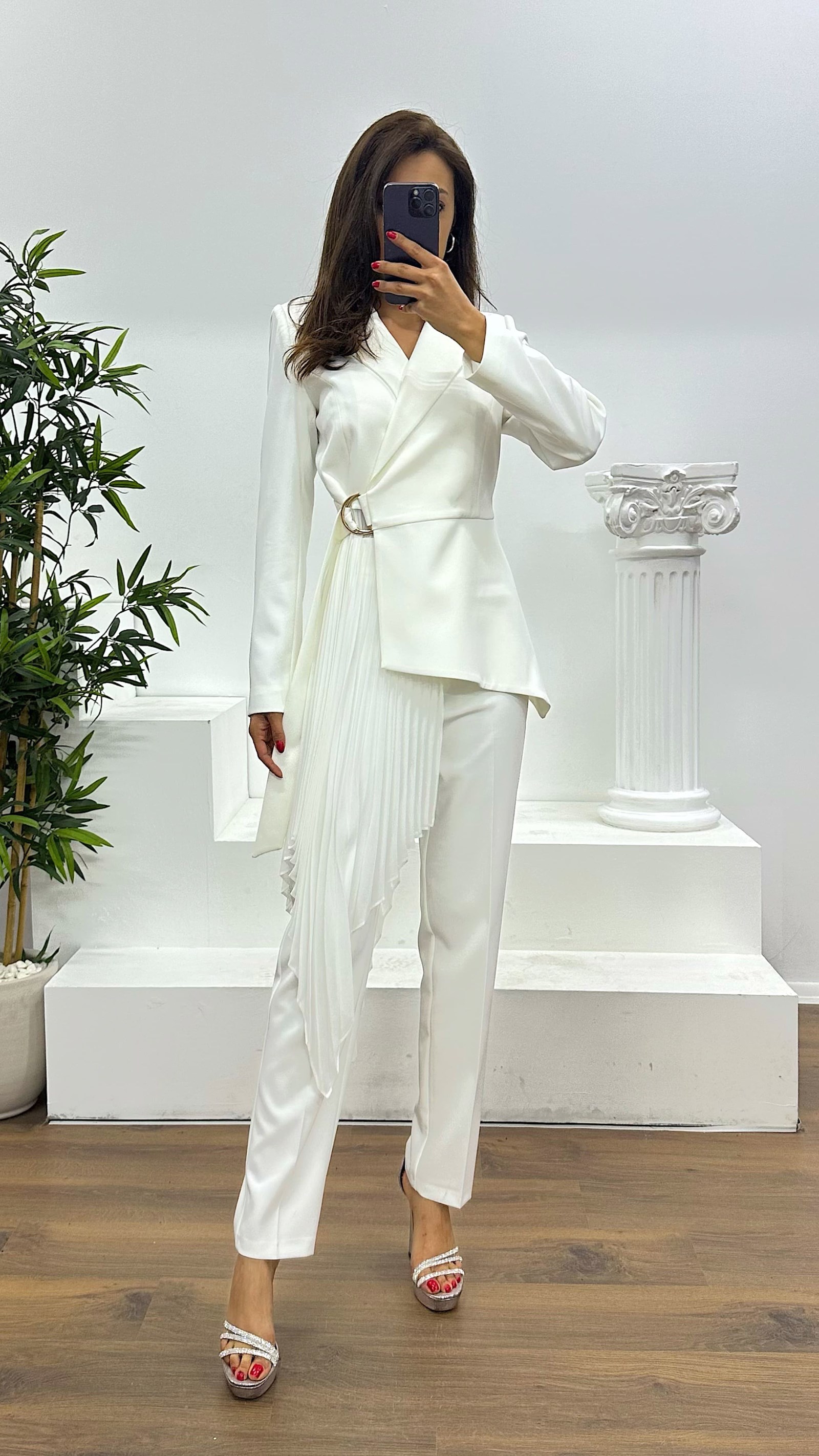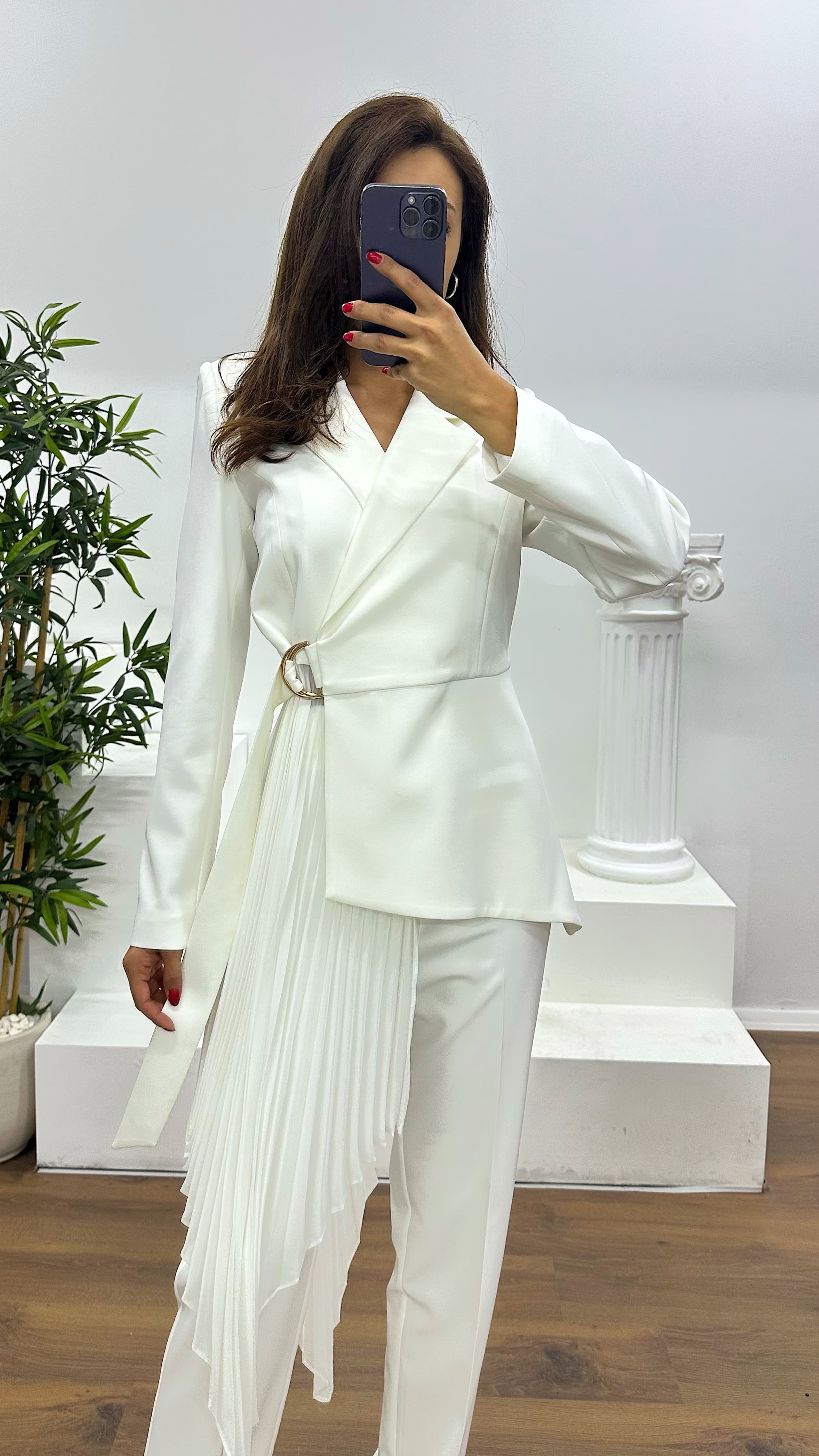 Belted Jacket Set The product is designed as a formal outfit with lining, zipper, and belt, suitable for sizes 36–42. Product length: 100 cm Sleeve length: 60 cm Fabric type: Atlas 100% polyester – Tulle: 3% lycra, 97% polyester