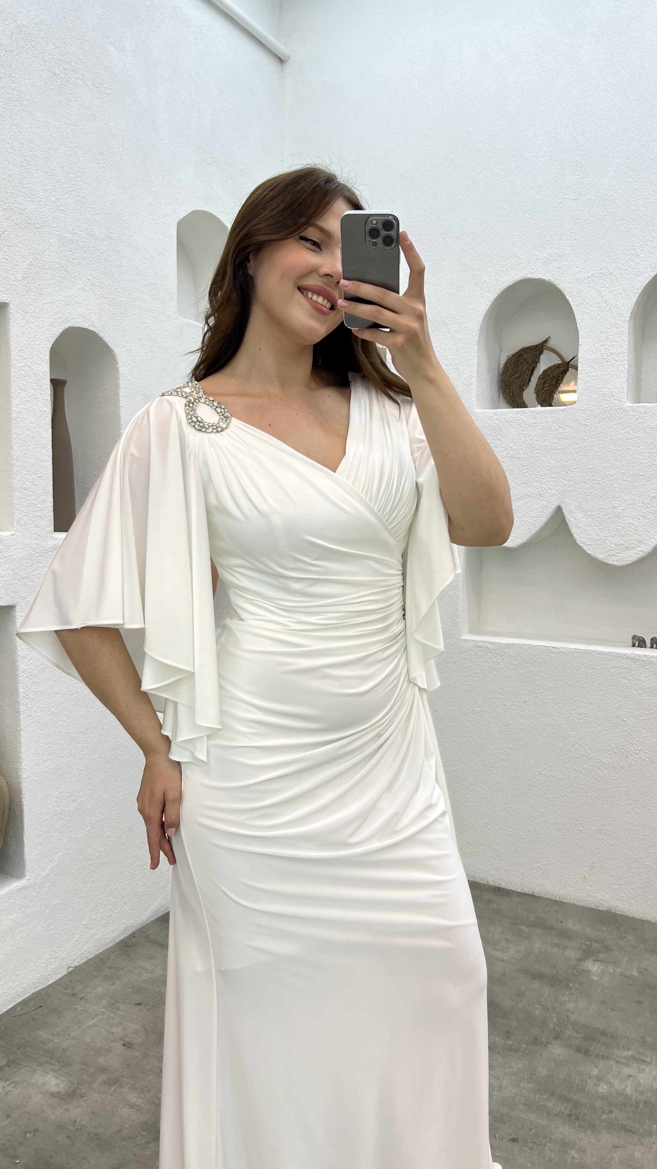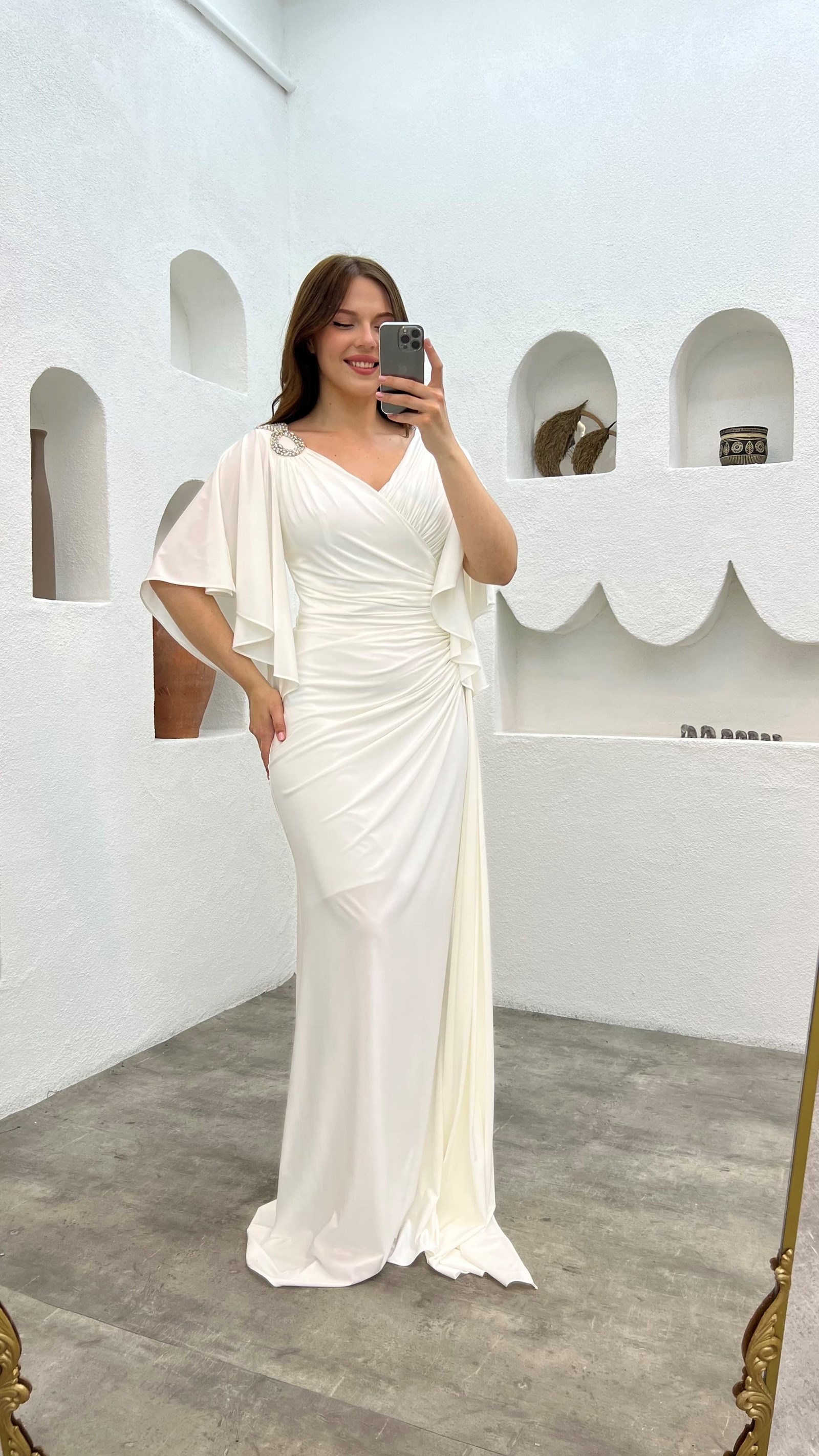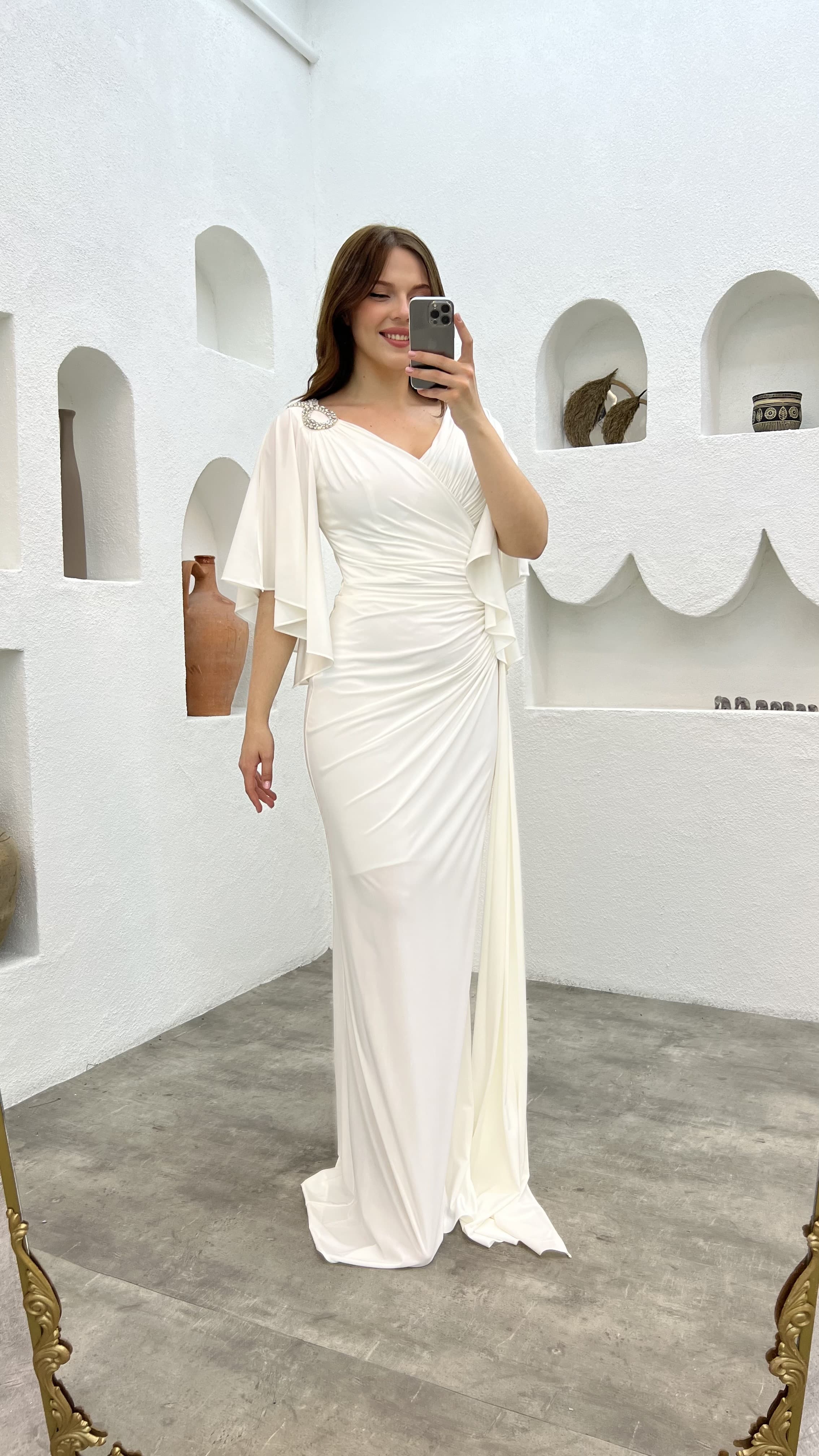 • Beyaz Omzu Ve Beli İşlemeli Volanlı Büyük Beden Abiye Elbise