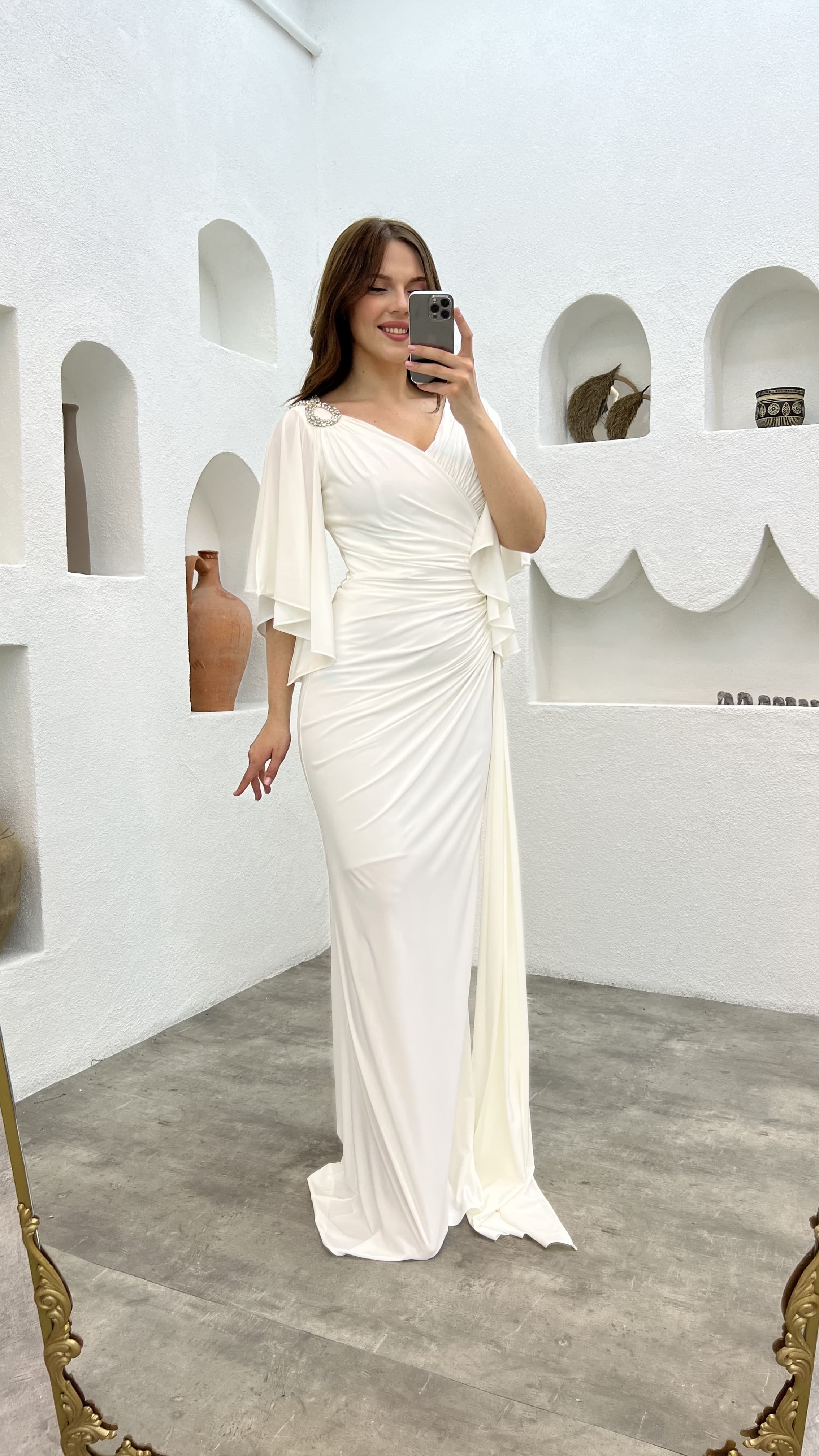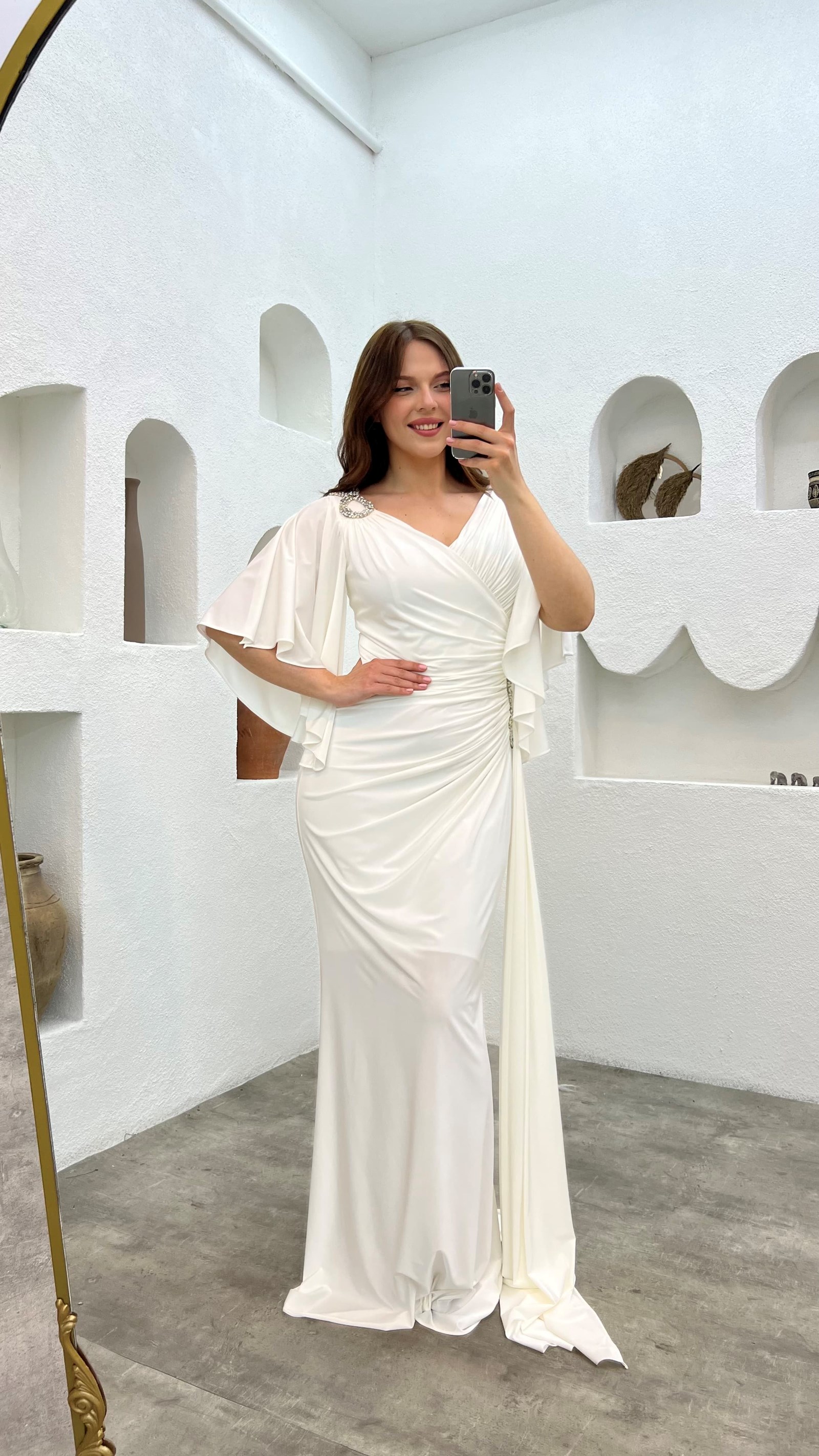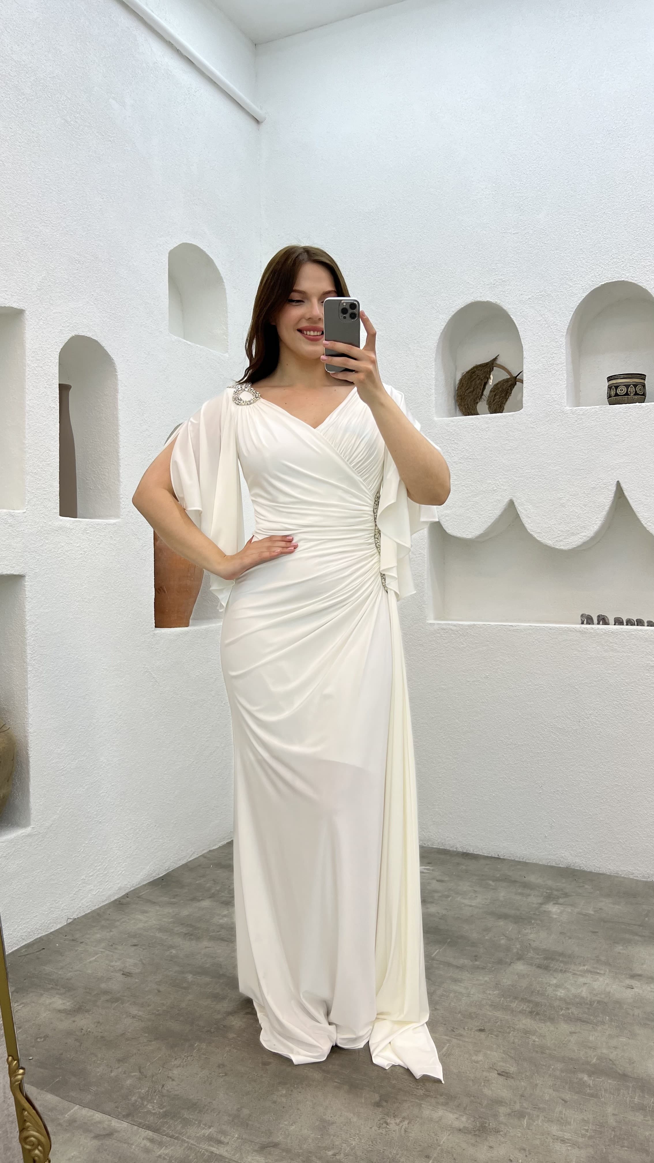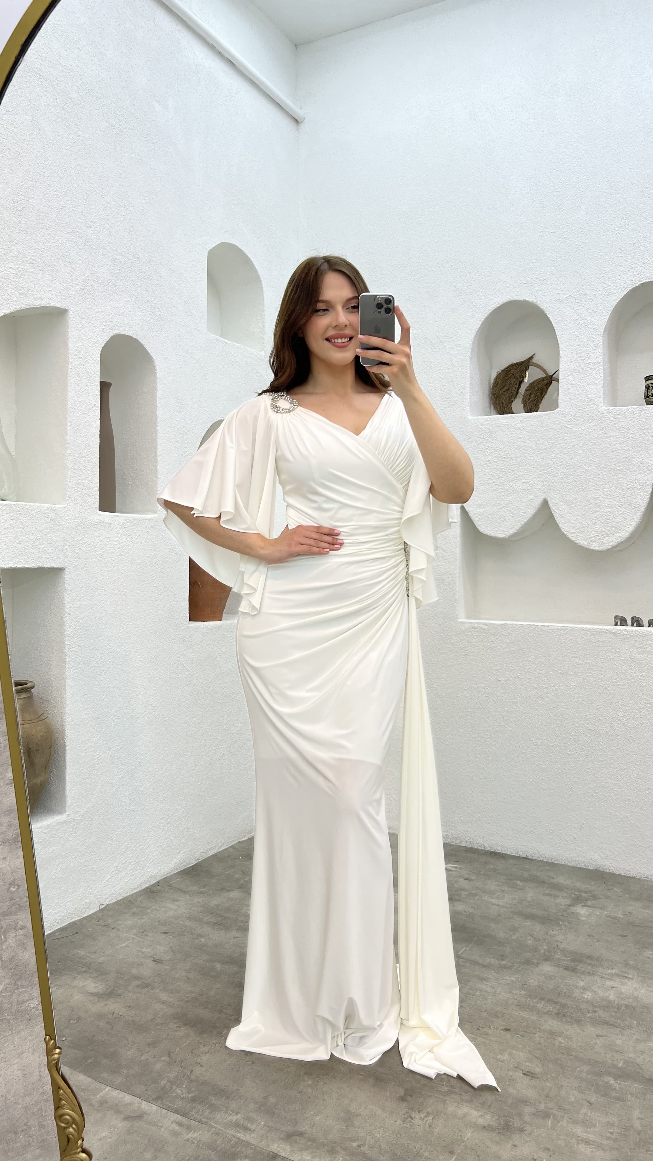 • Beyaz Omzu Ve Beli İşlemeli Volanlı Büyük Beden Abiye Elbise