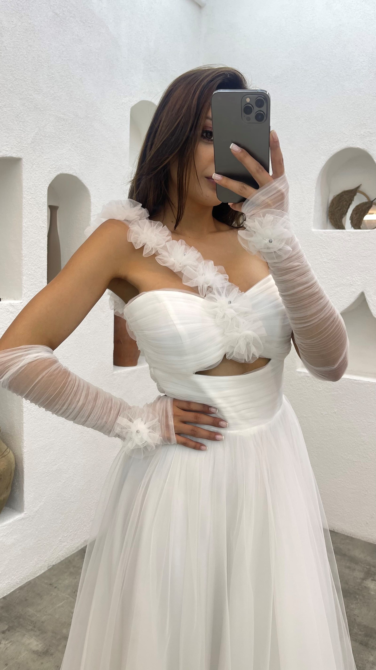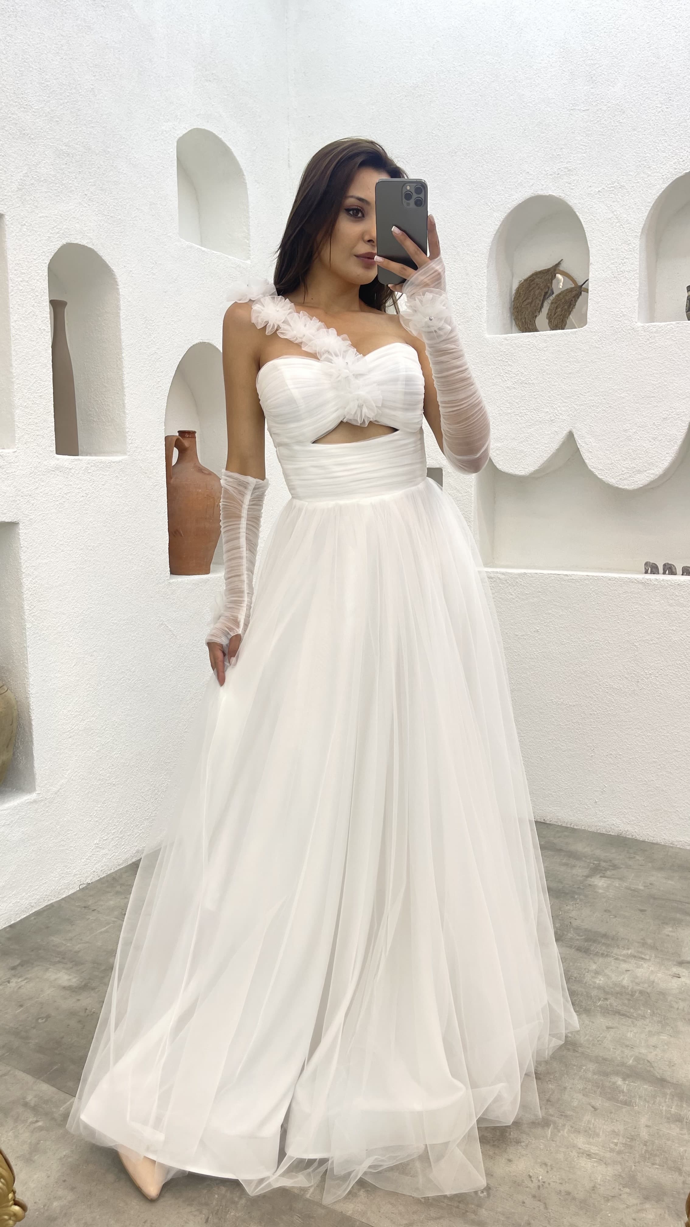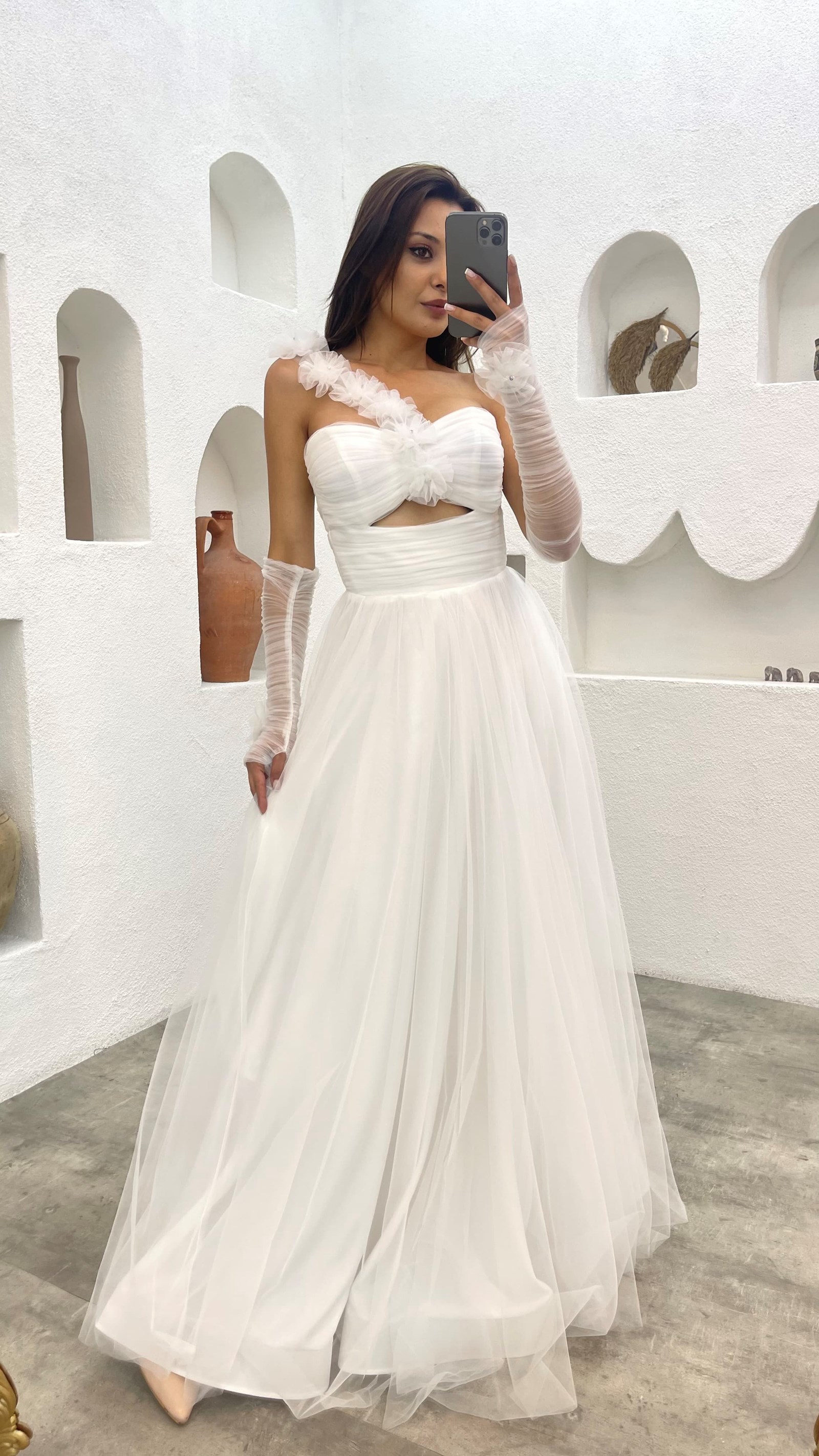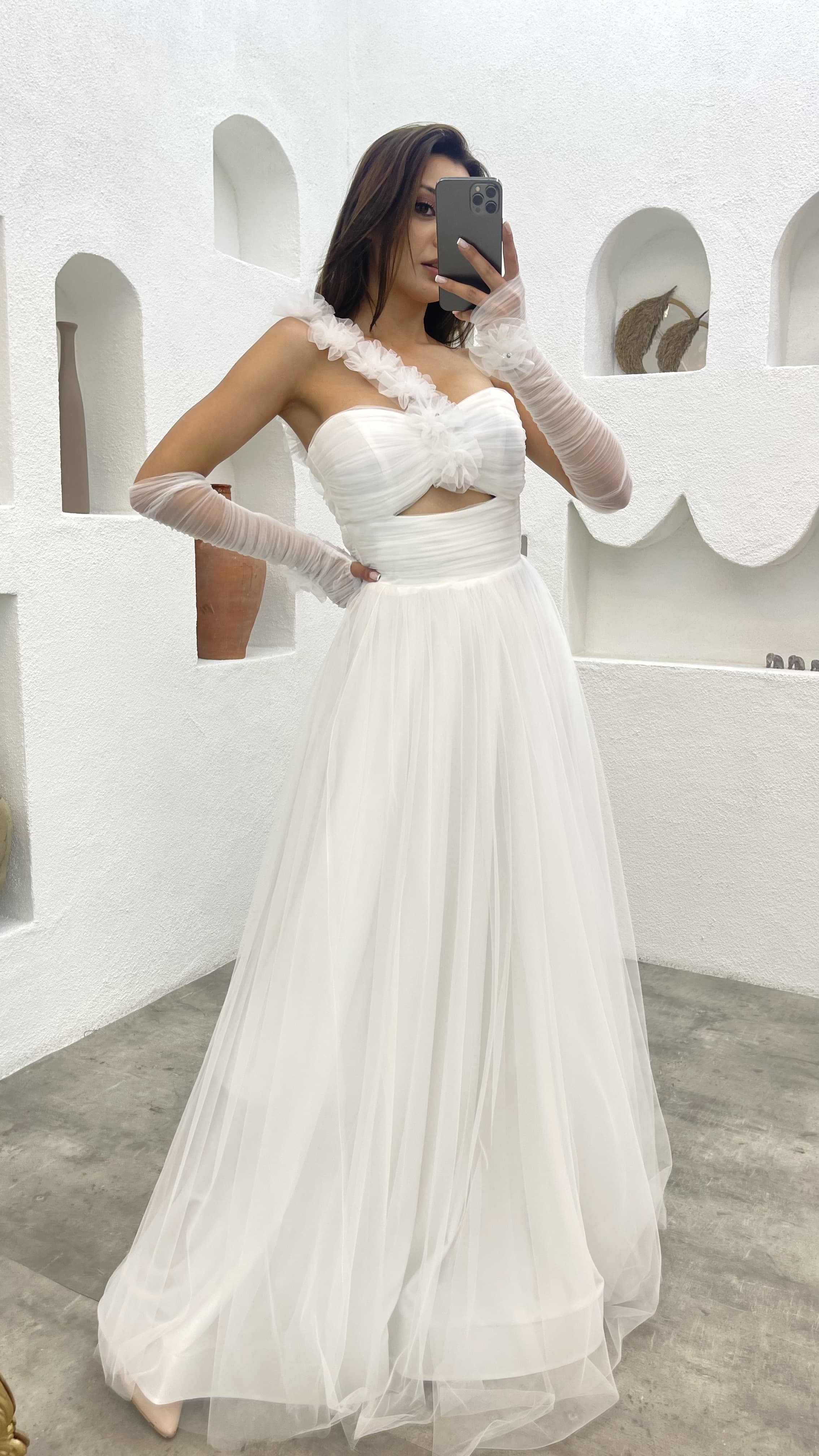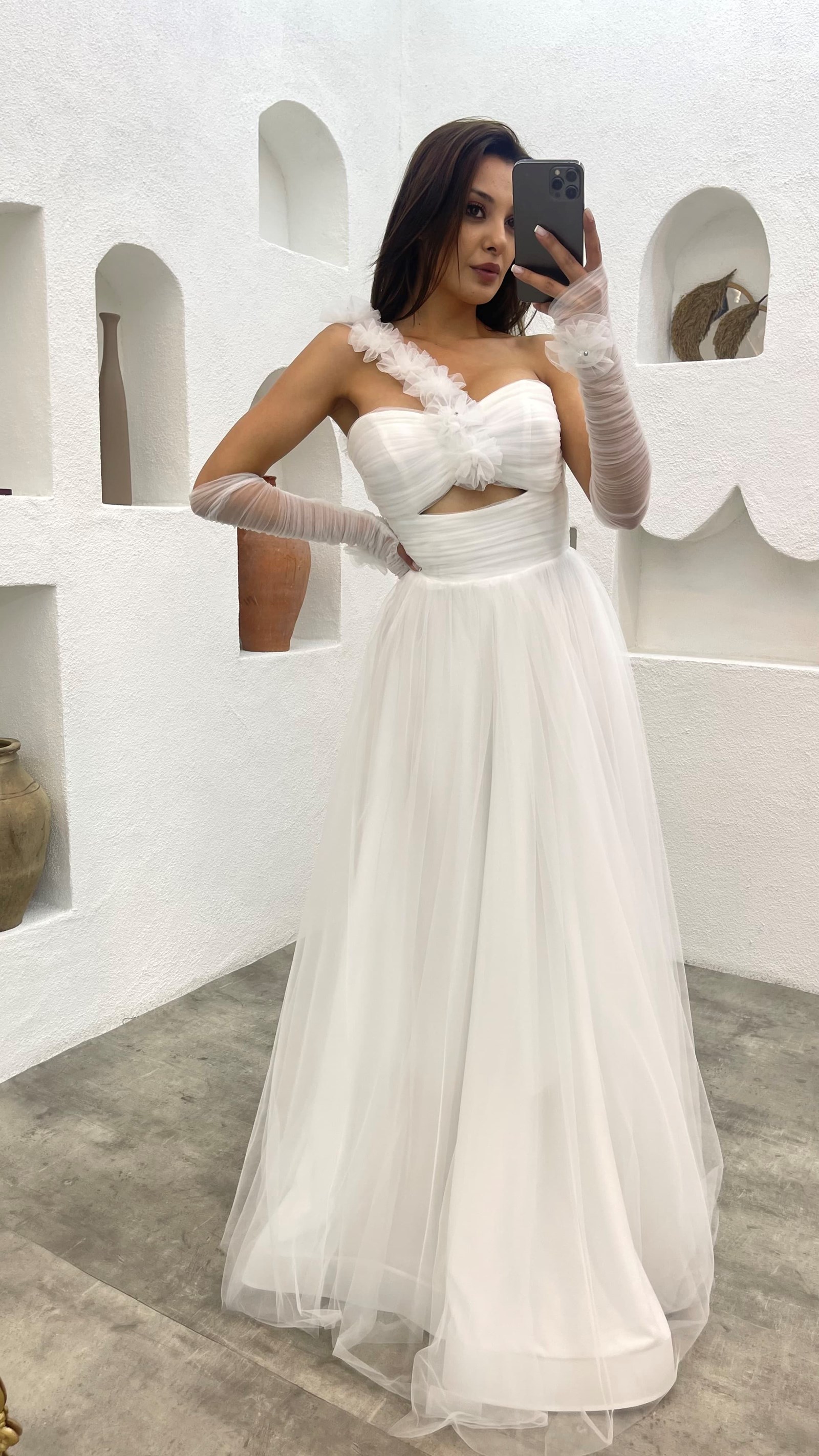 • Beyaz Tek Kol Çiçekli Tül Abiye