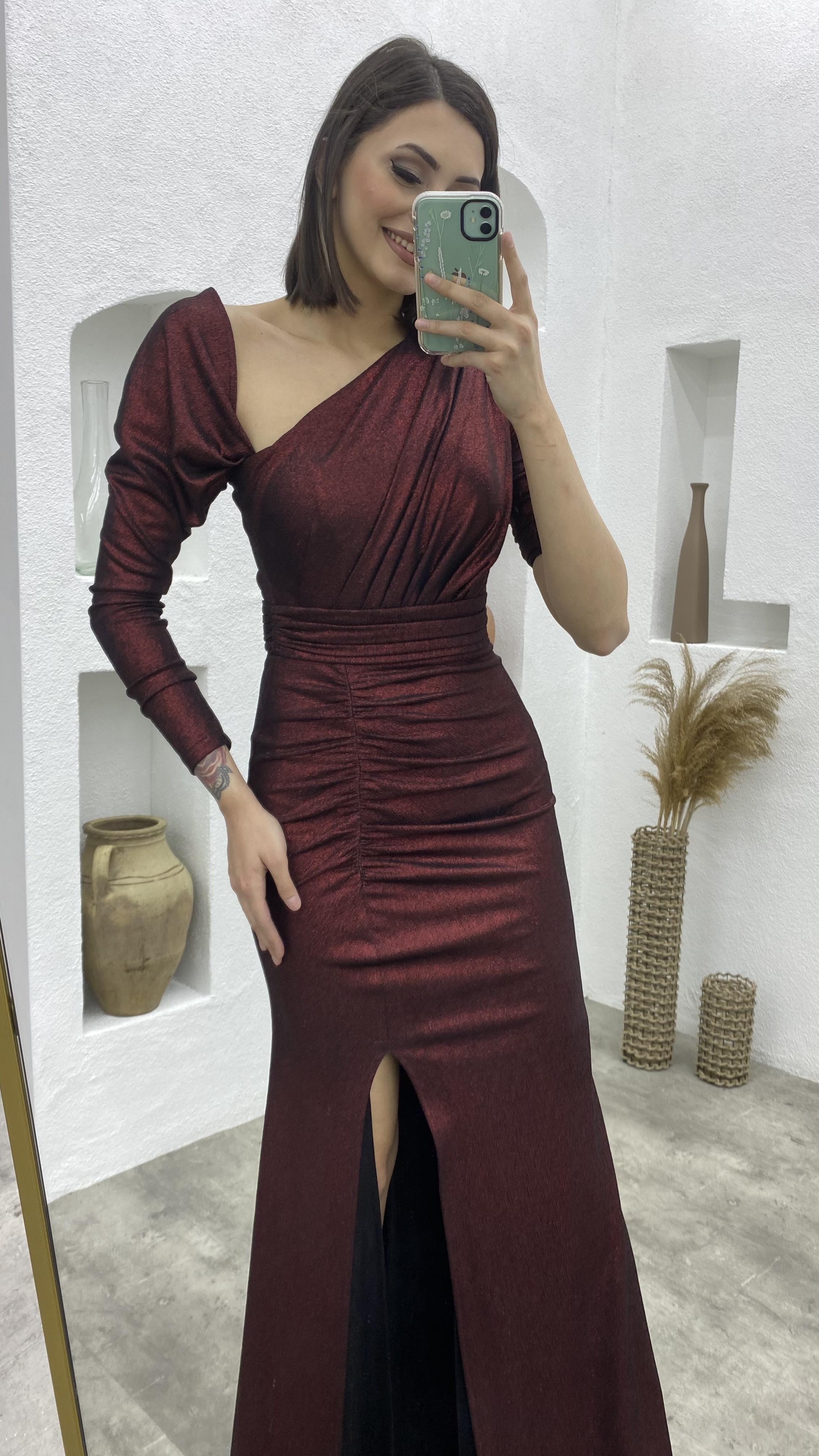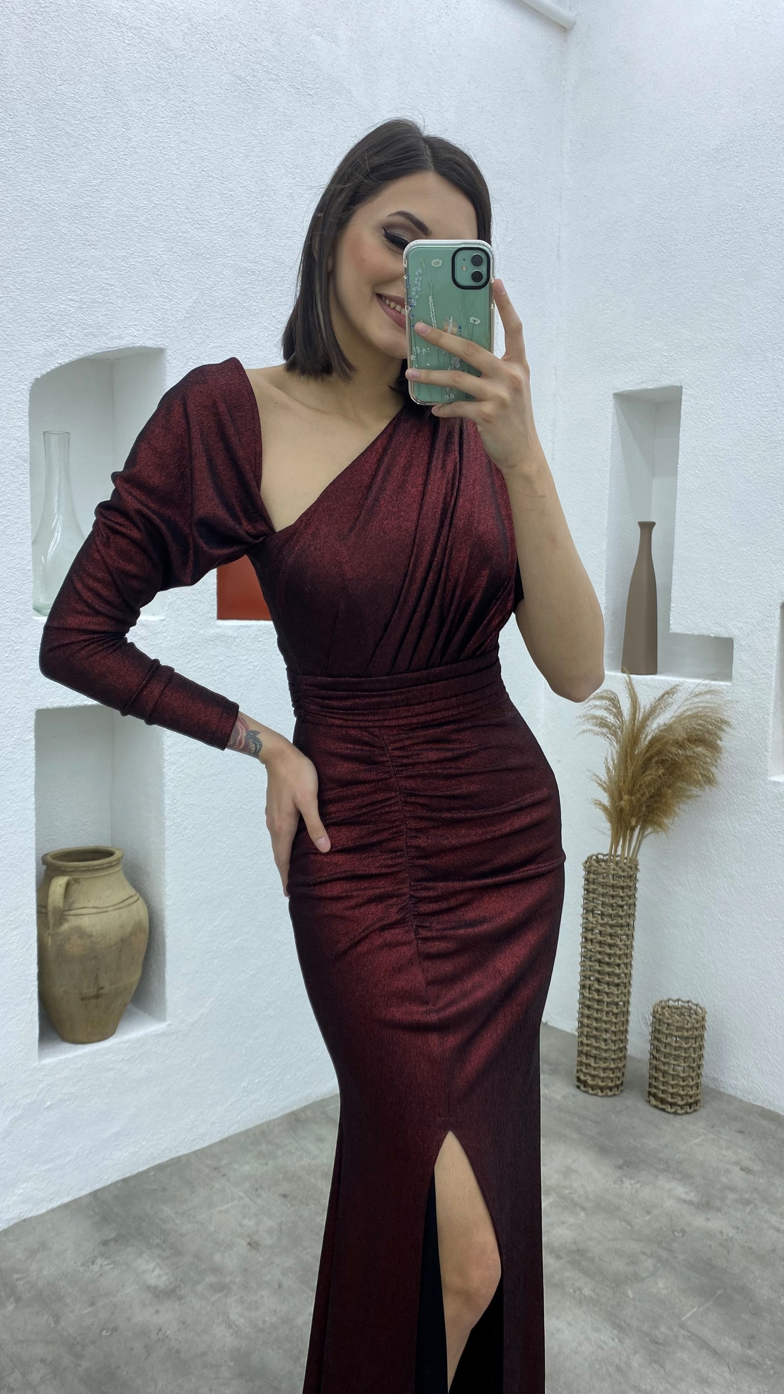 • Bordo Asimetrik Kesim Büzgülü Simli Abiye Elbise