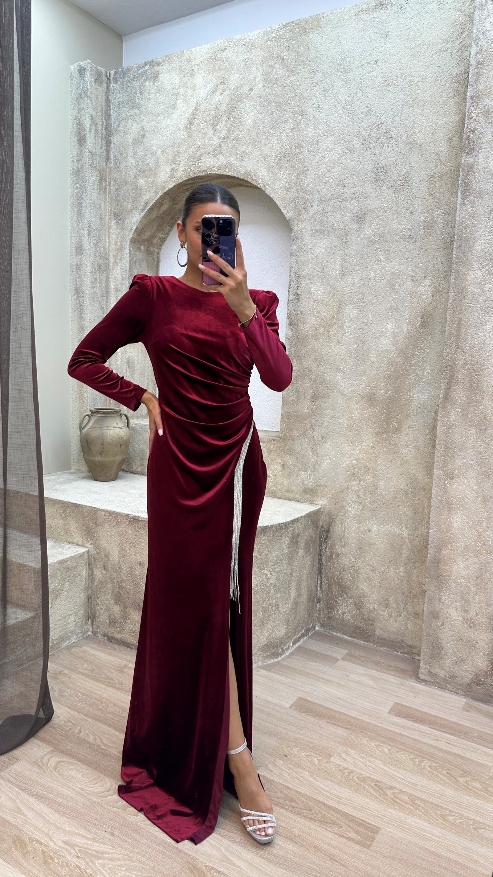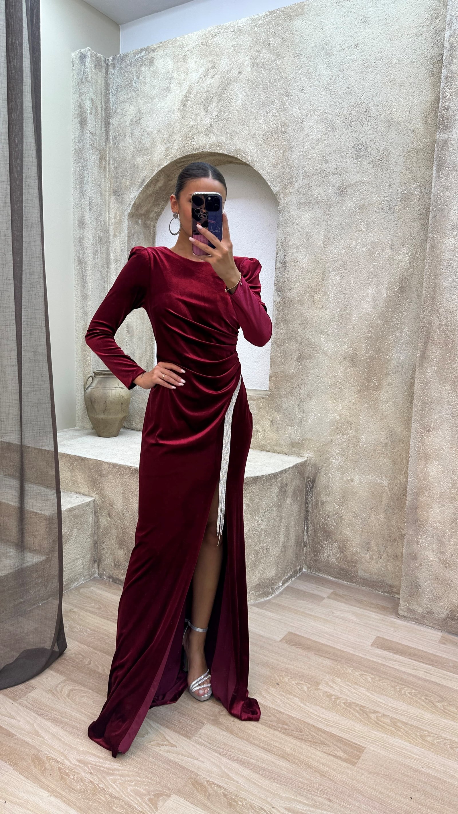 • Bordo Bisiklet Yaka İşlemeli Abiye Elbise