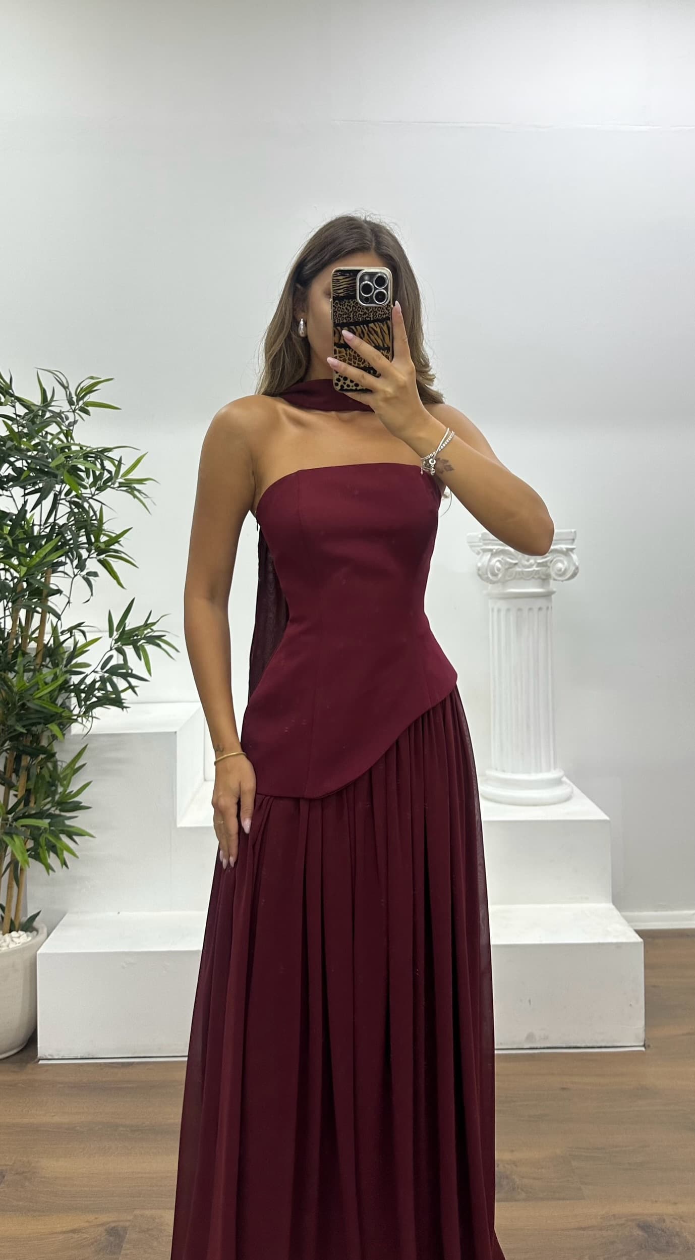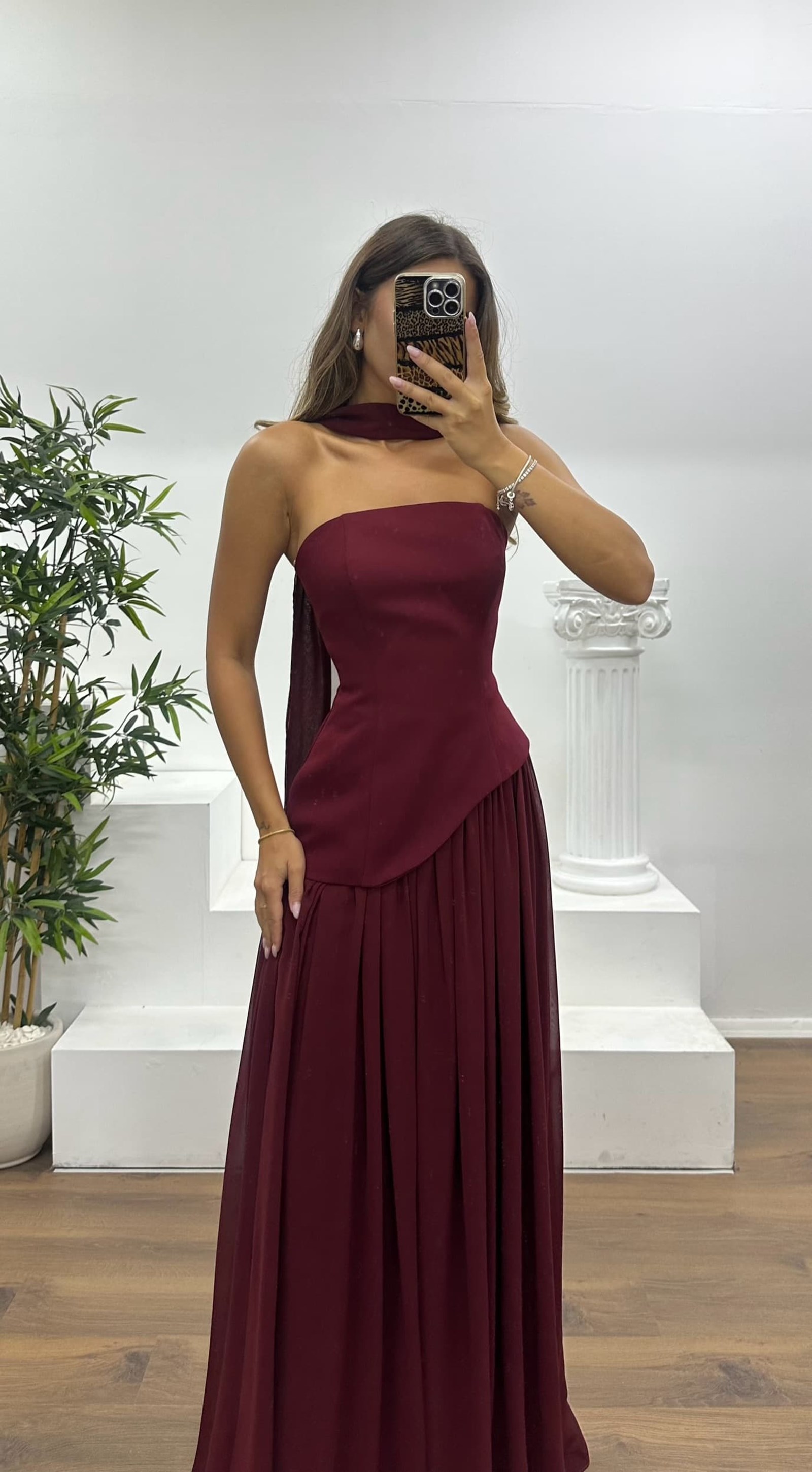 • Bordo Straplez Şifon Detay Abiye Elbise