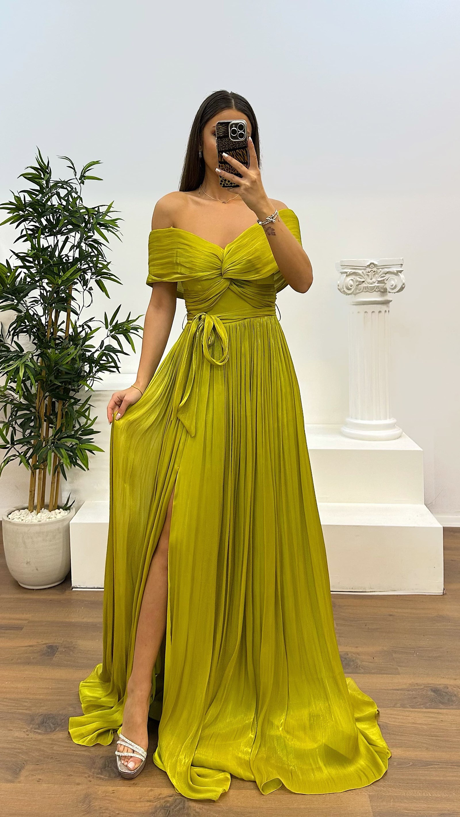 • Elma Yeşili Kayık Yaka Piliseli Abiye Elbise