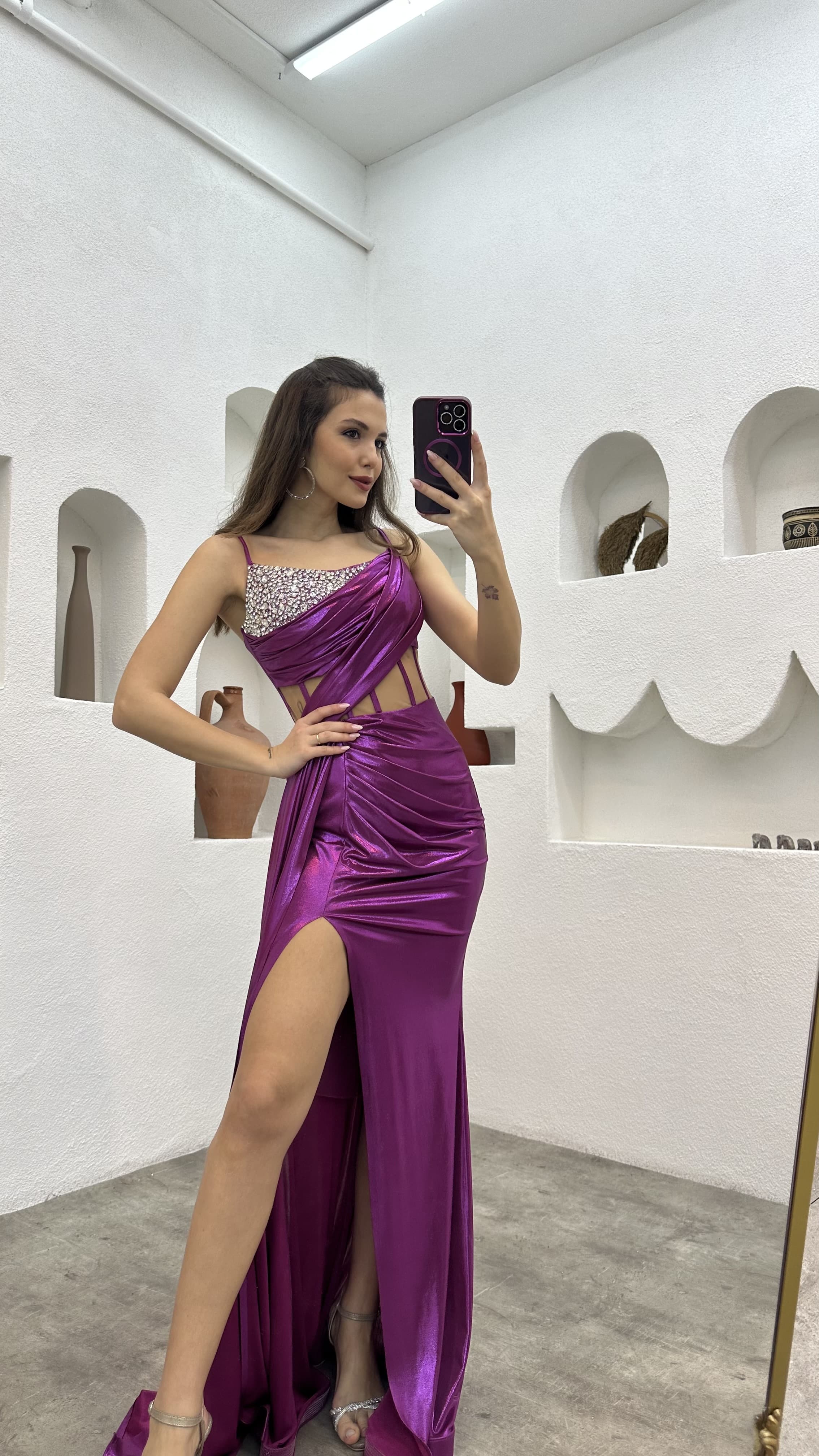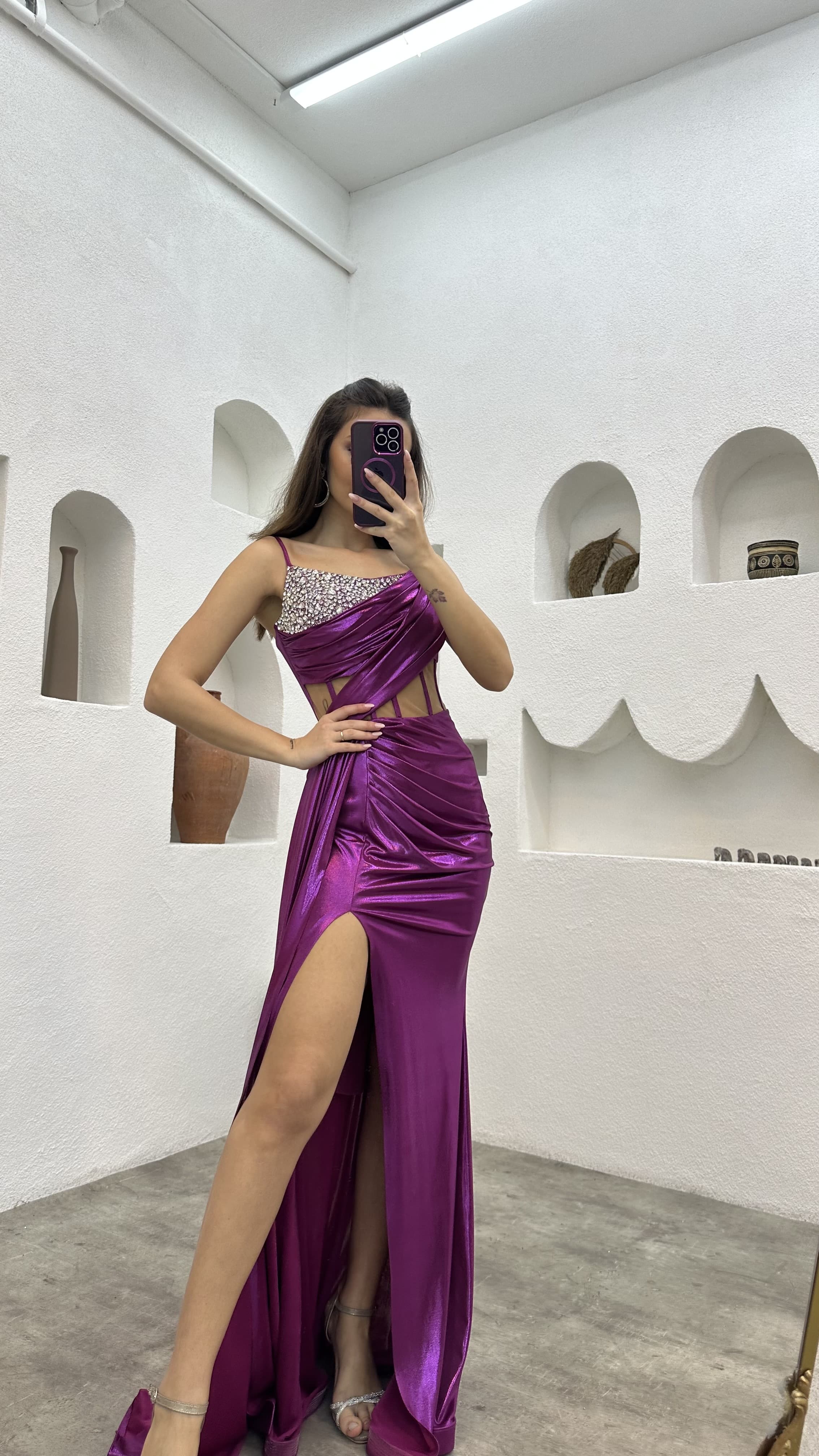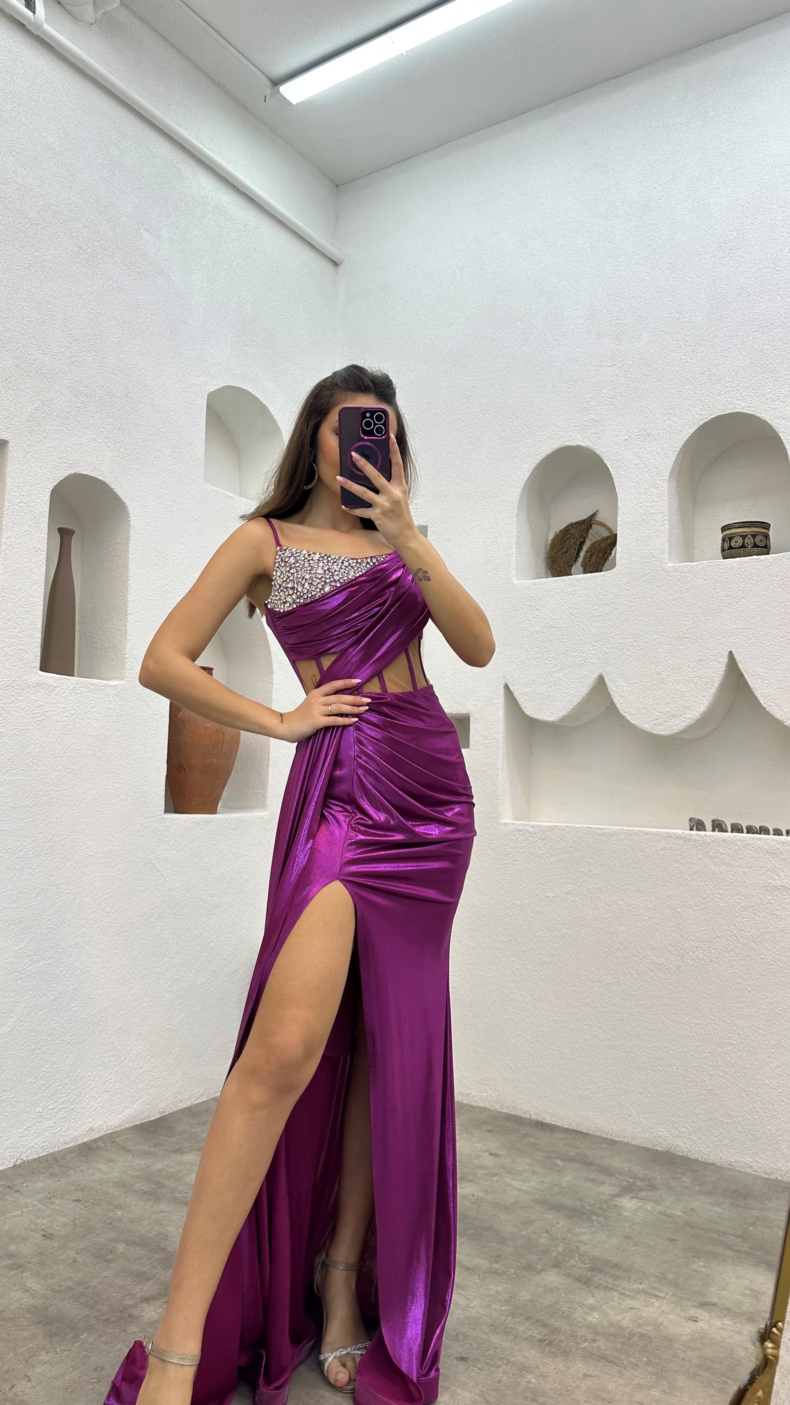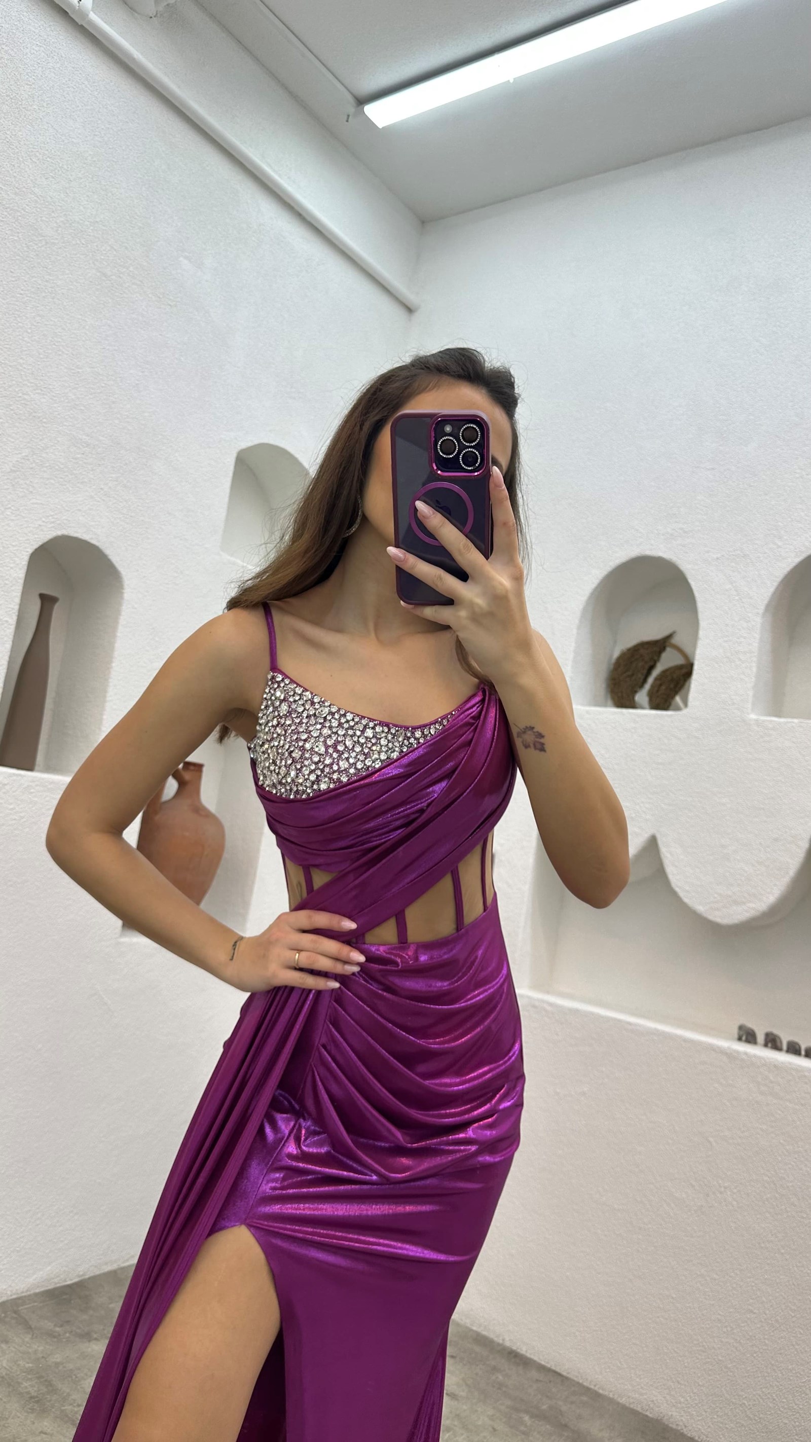 Plum Rope Strap Embroidered Detail Transparent Detail Satin Evening Dress