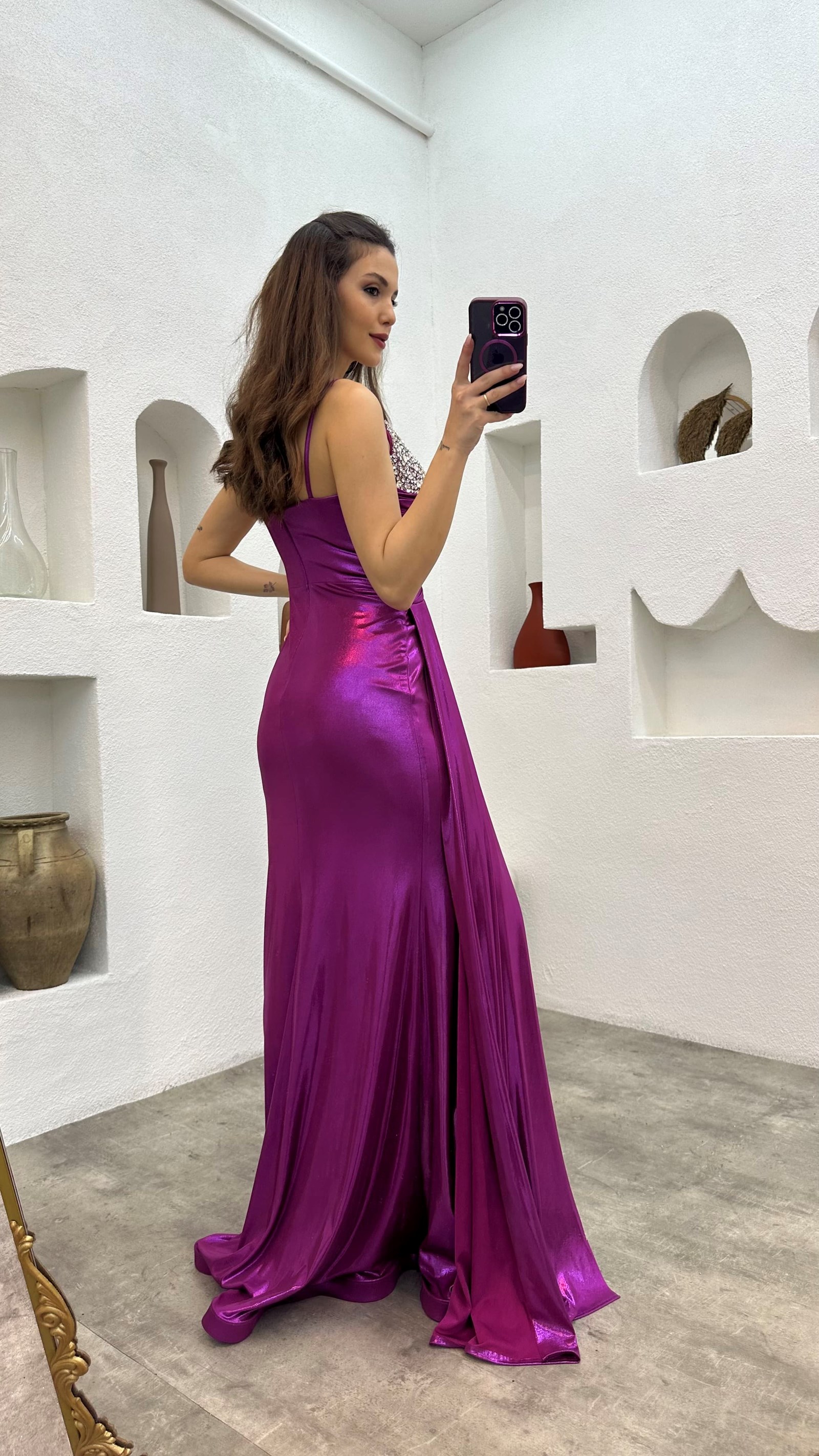 Fuşya İp Askılı İşlemeli Transparan Detay Saten Abiye Elbise