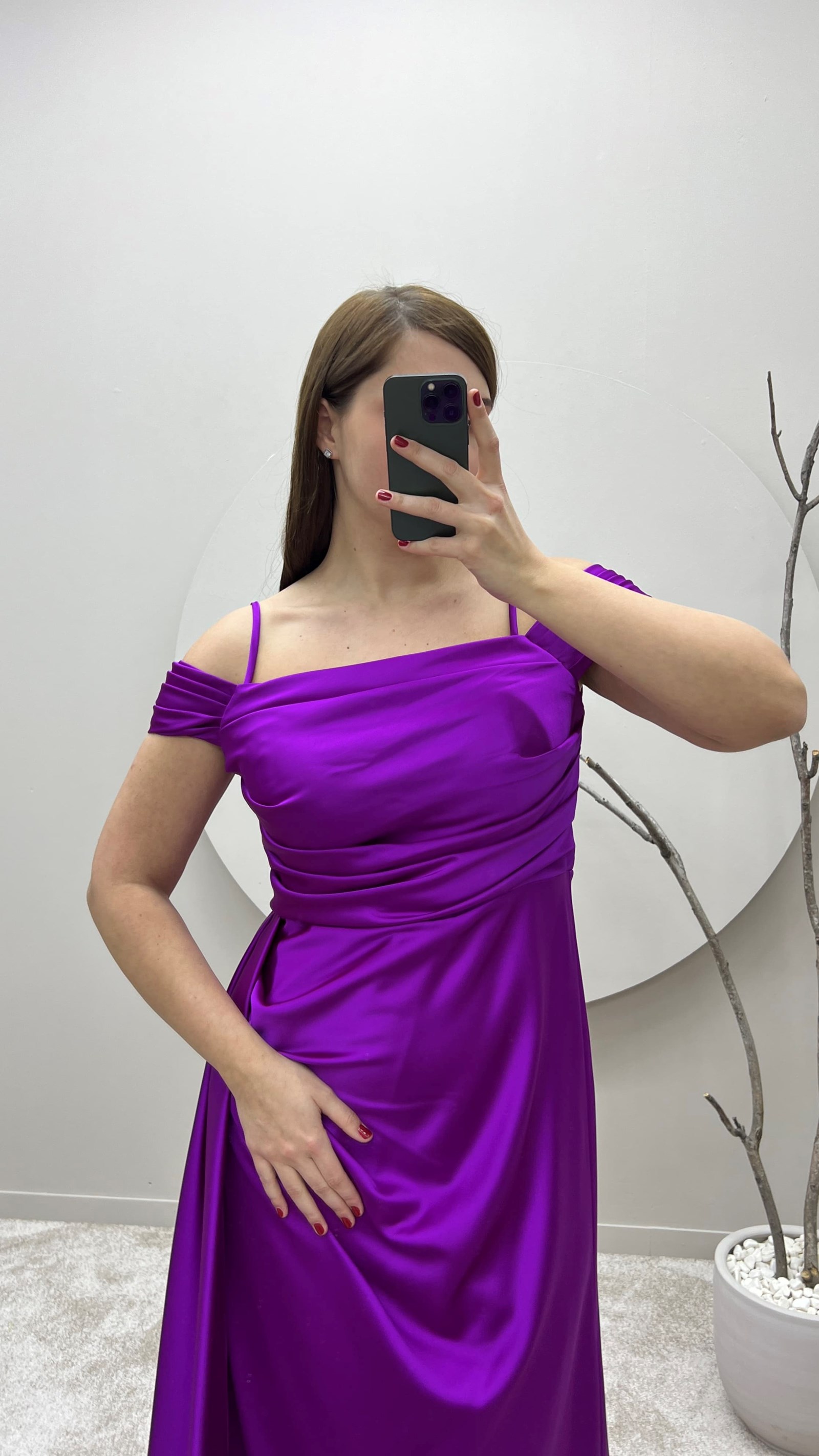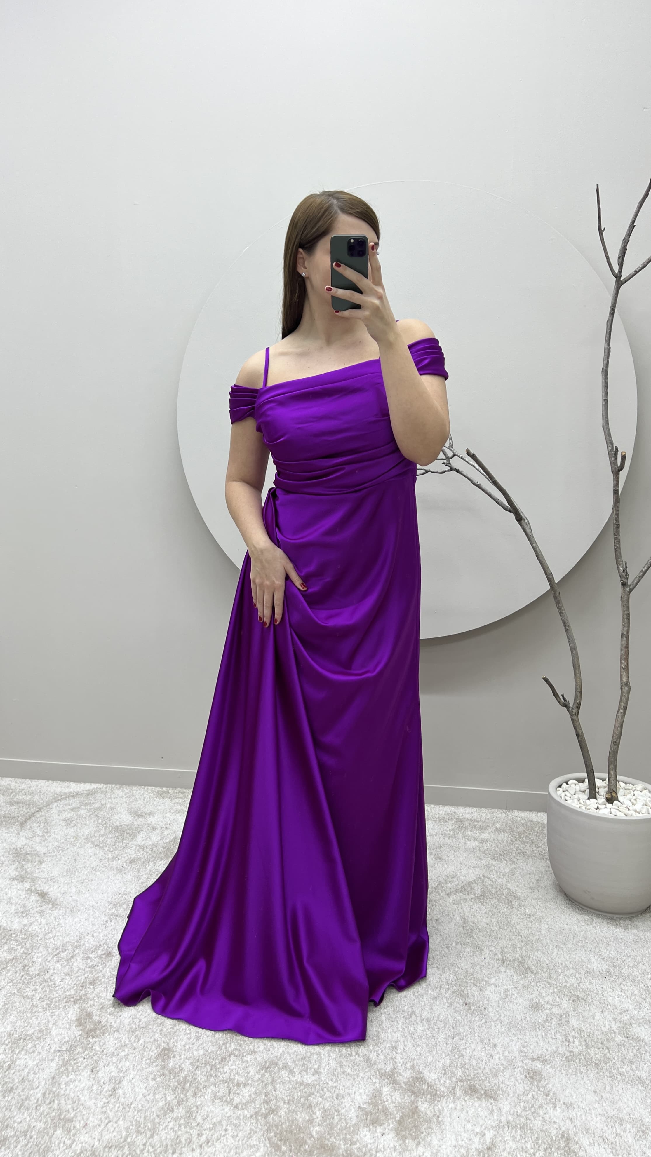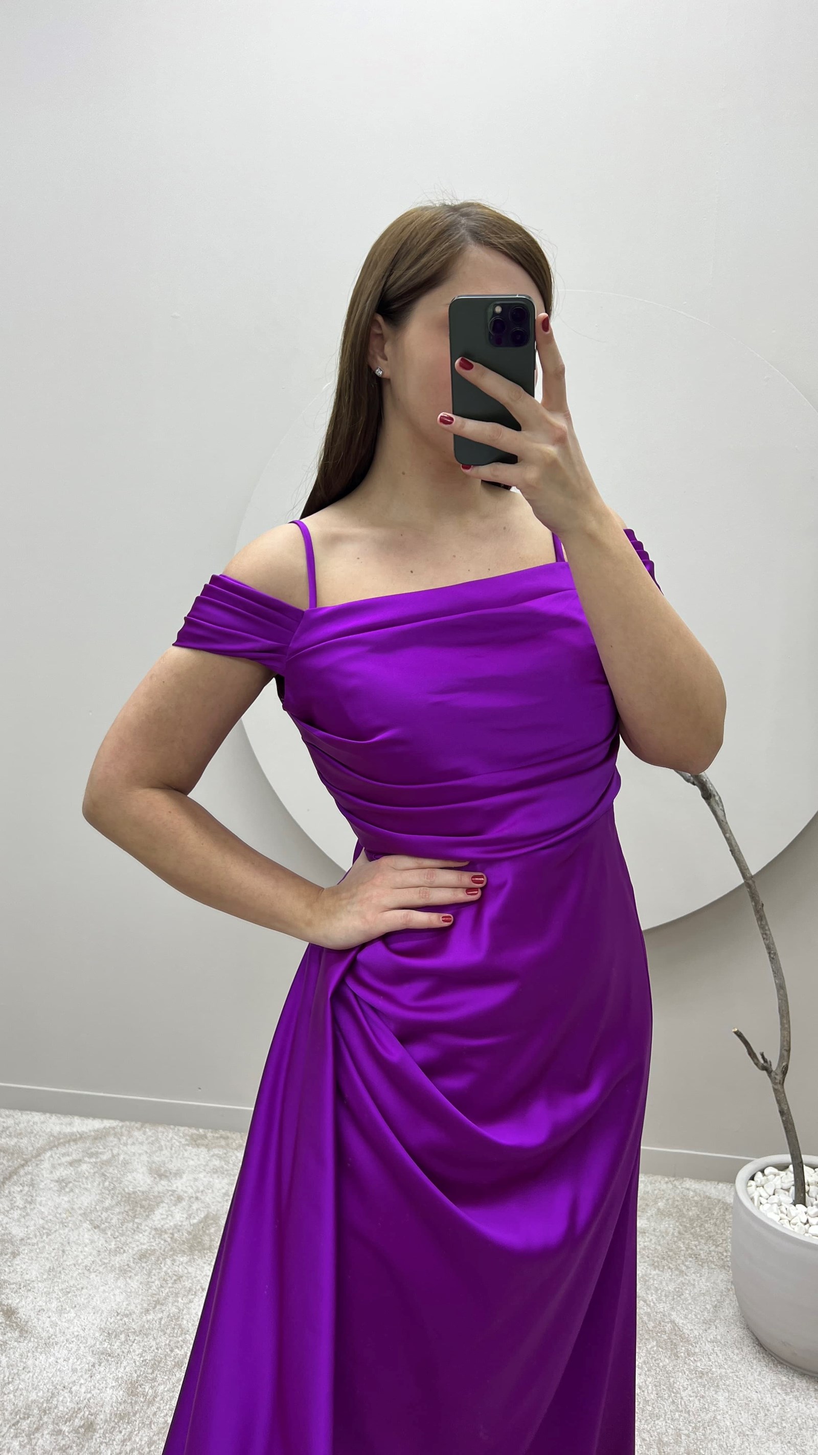 Fuşya İp Askılı Omuz Detay Tasarım Saten Büyük Beden Abiye Elbise