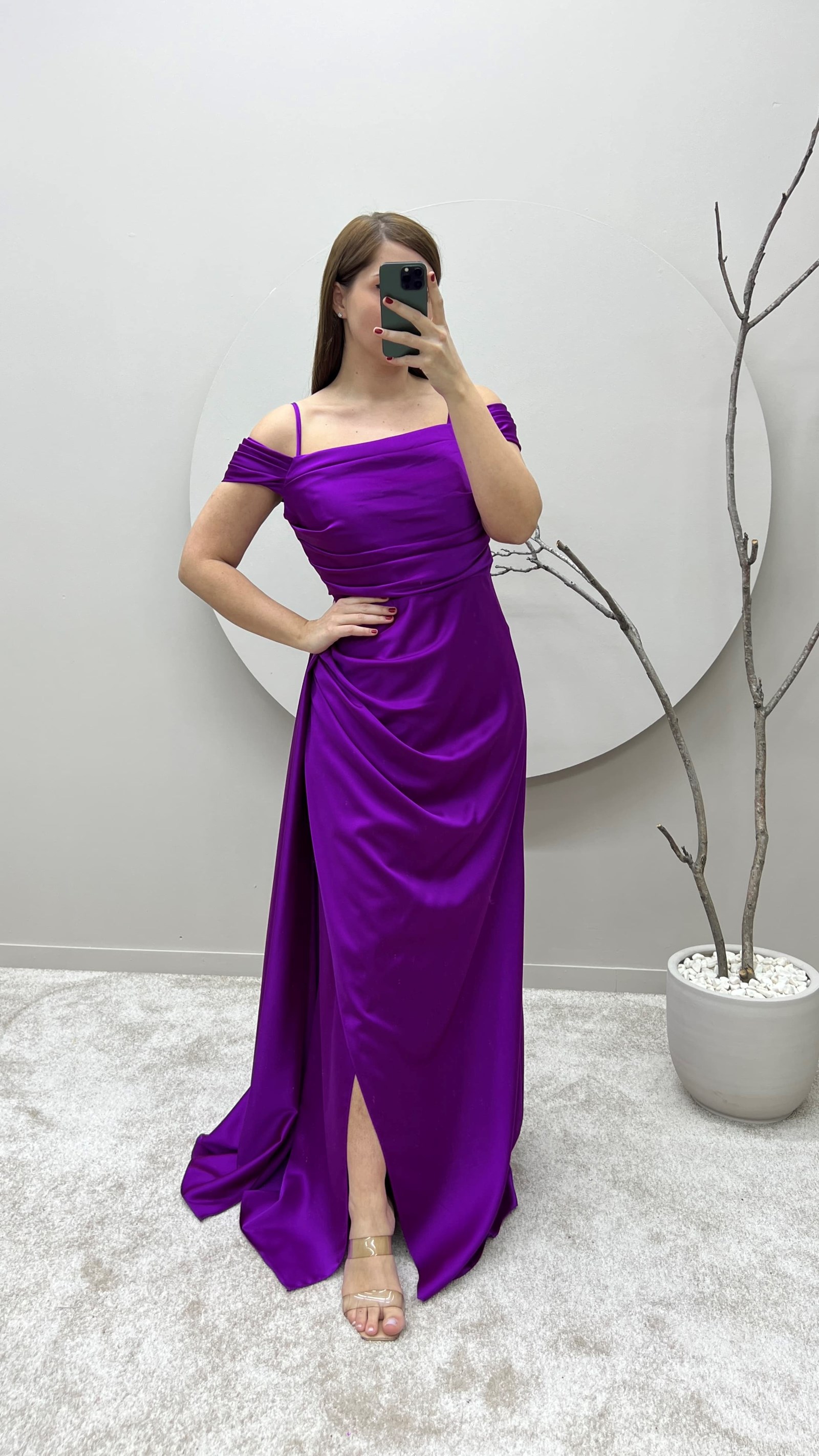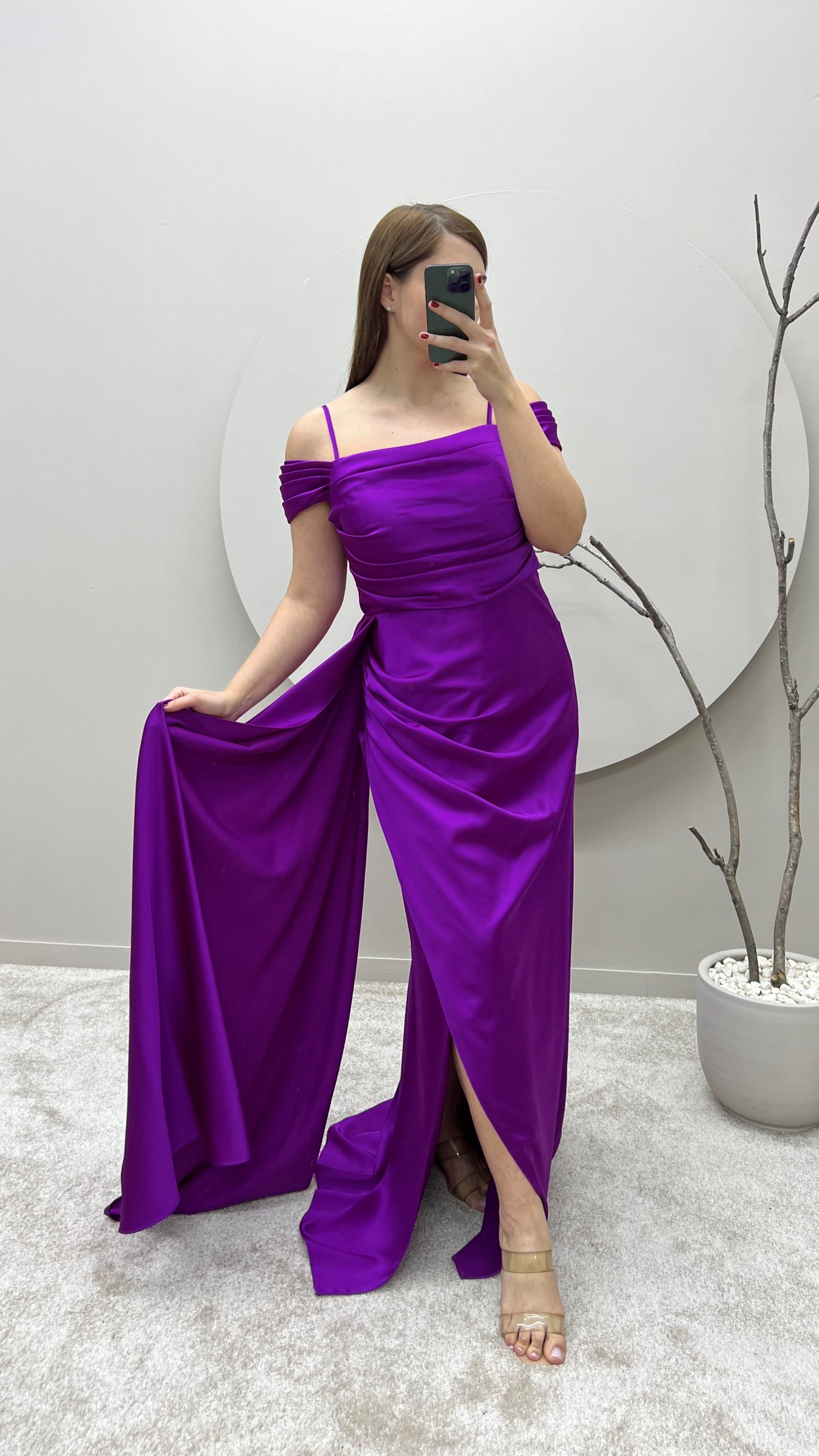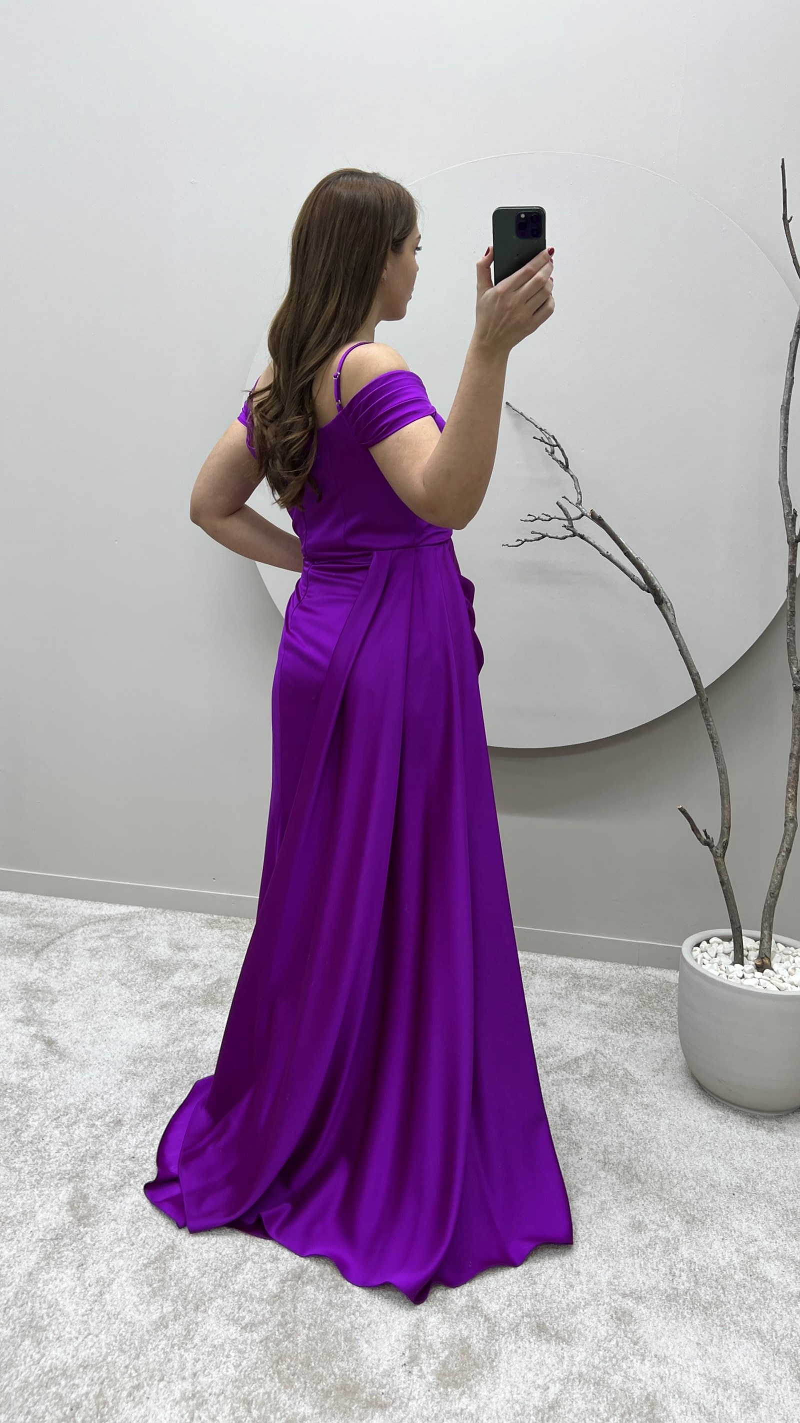 Fuşya İp Askılı Omuz Detay Tasarım Saten Büyük Beden Abiye Elbise
