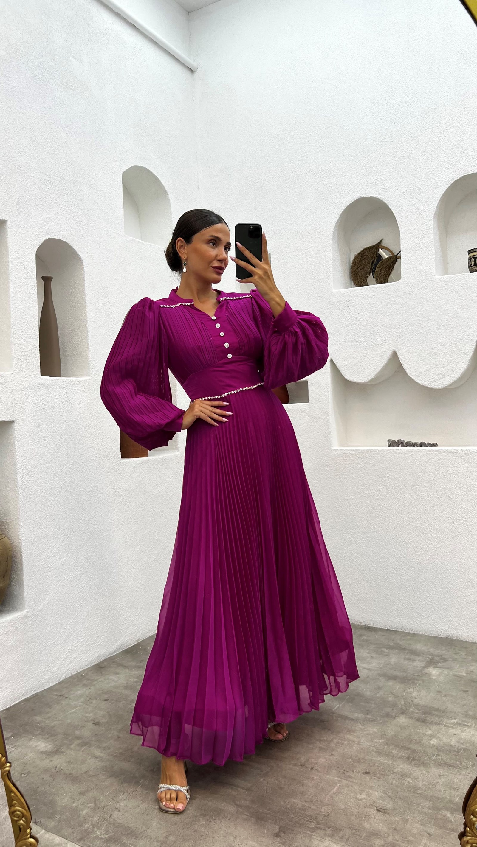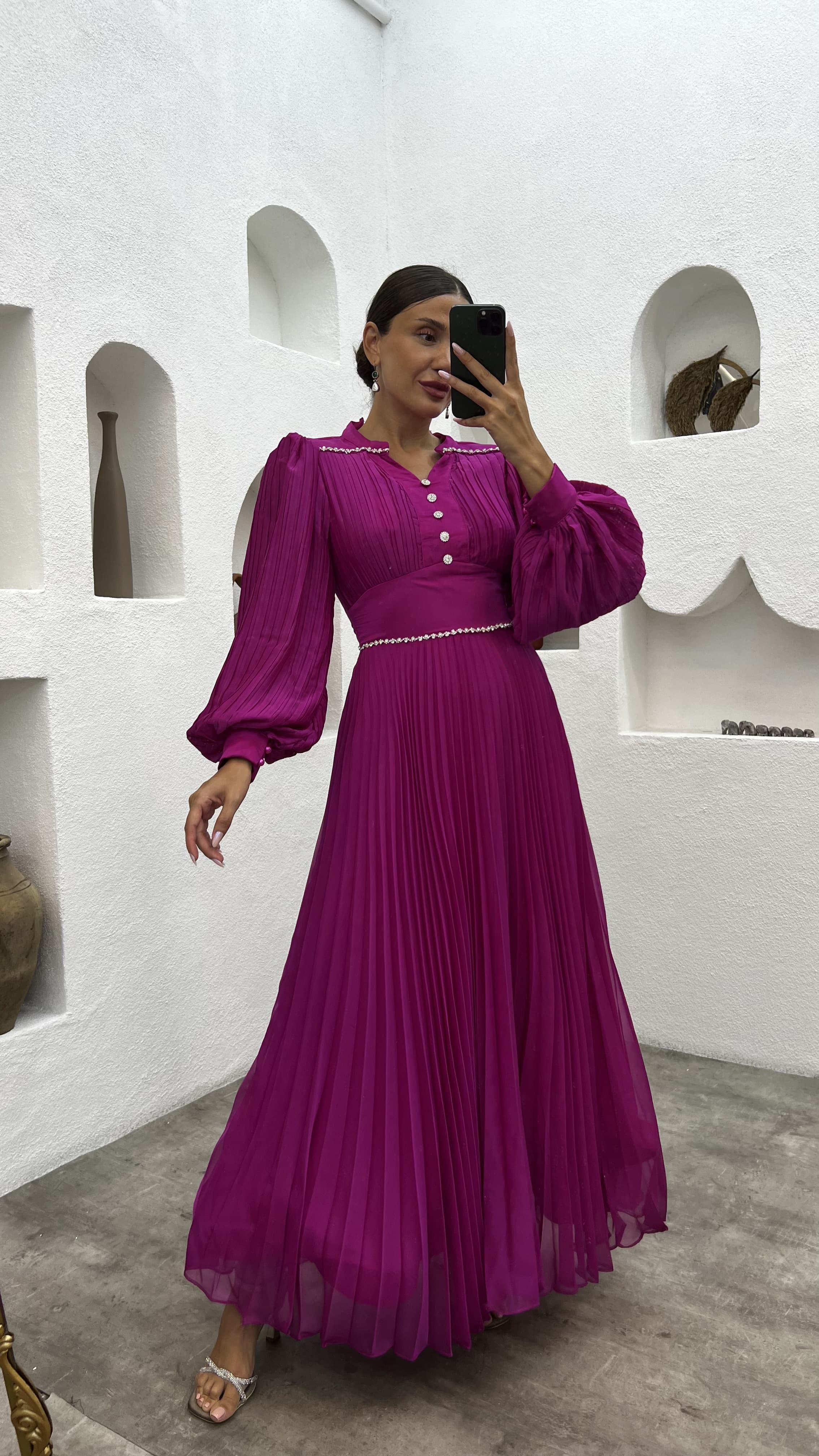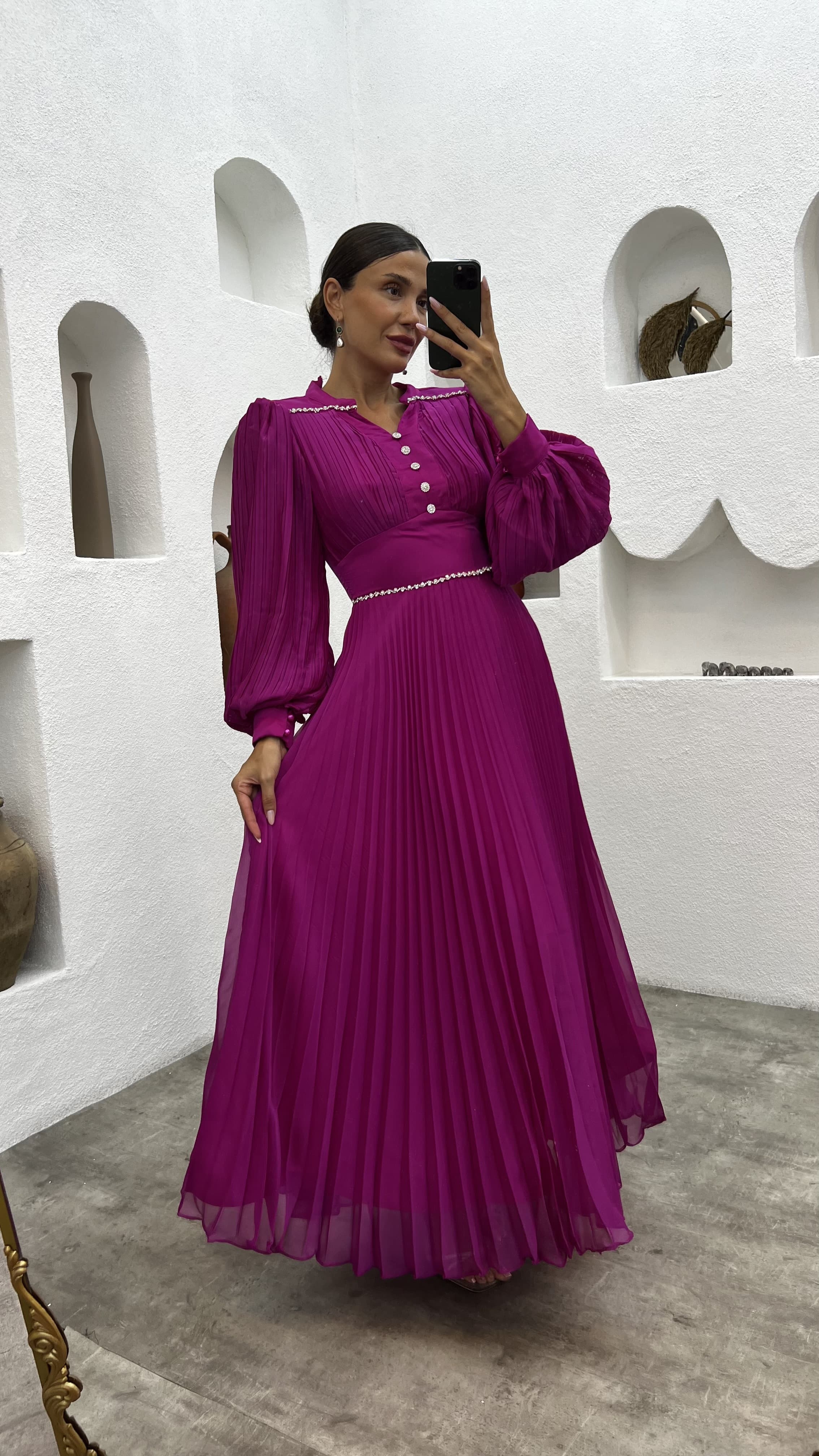 • Fuşya Pliseli Düğme Detay Abiye Elbise