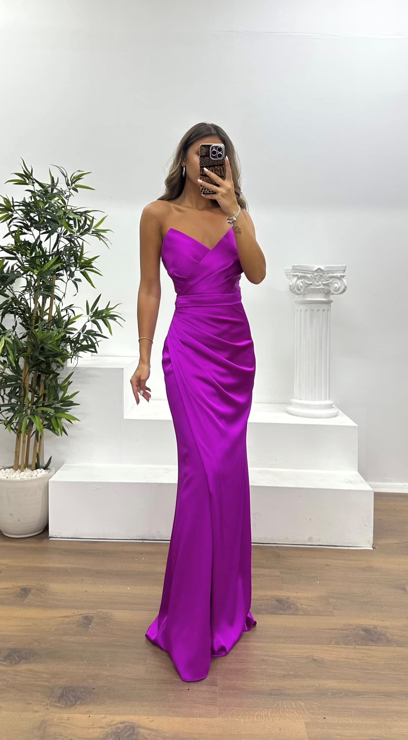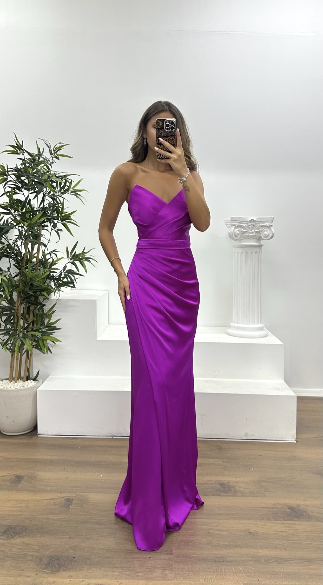 Strapless Draped Evening Dress The product is designed as a draped evening dress with a slit, inner lining, padded bust, and back zipper closure. It fits sizes 36 to 42. Product length: May vary between 170-175 cm. Fabric type: Satin polyester-viscose.
