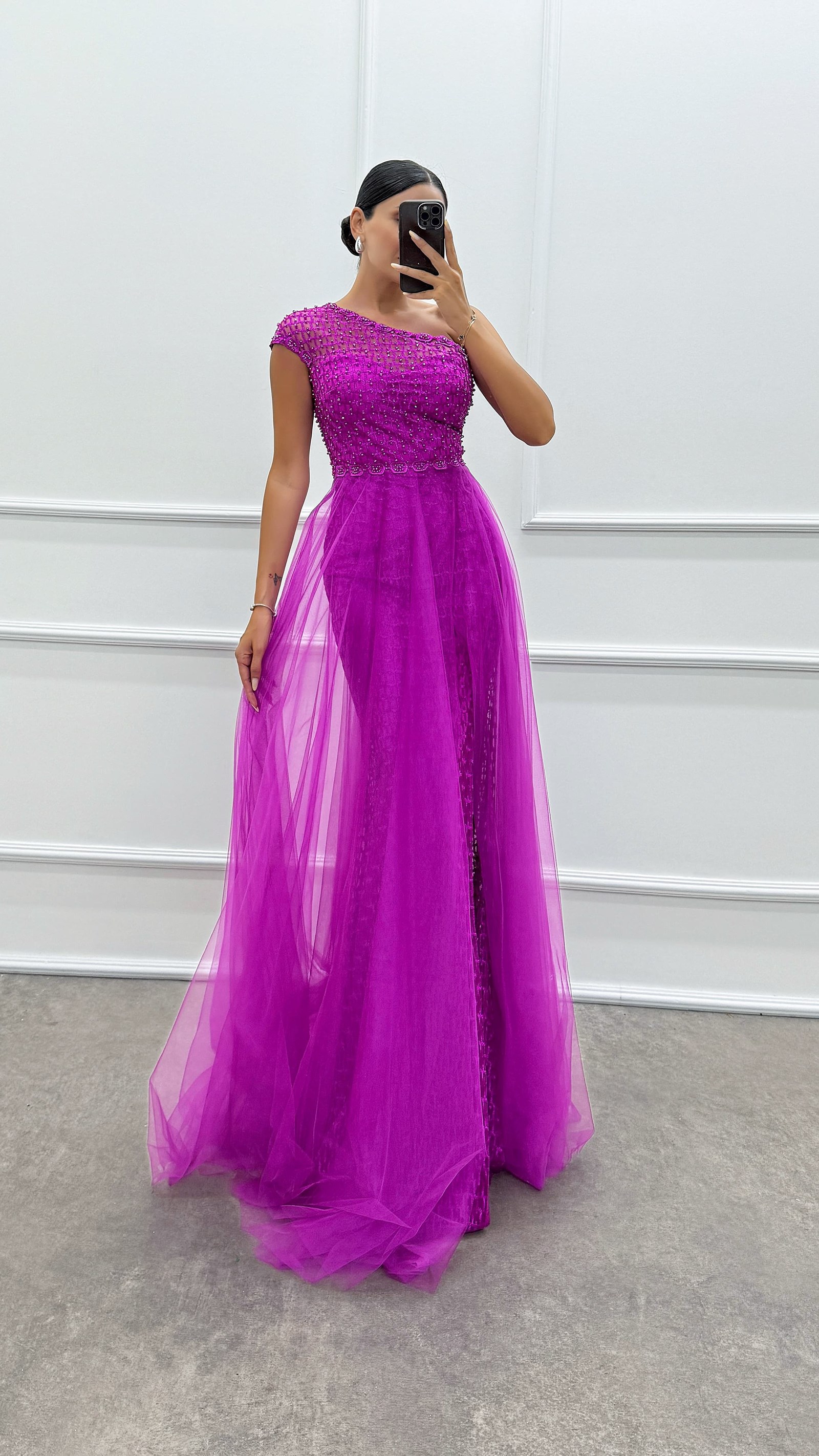 • Fuşya Tek Omuz İşleme Detay Tasarım Elbise