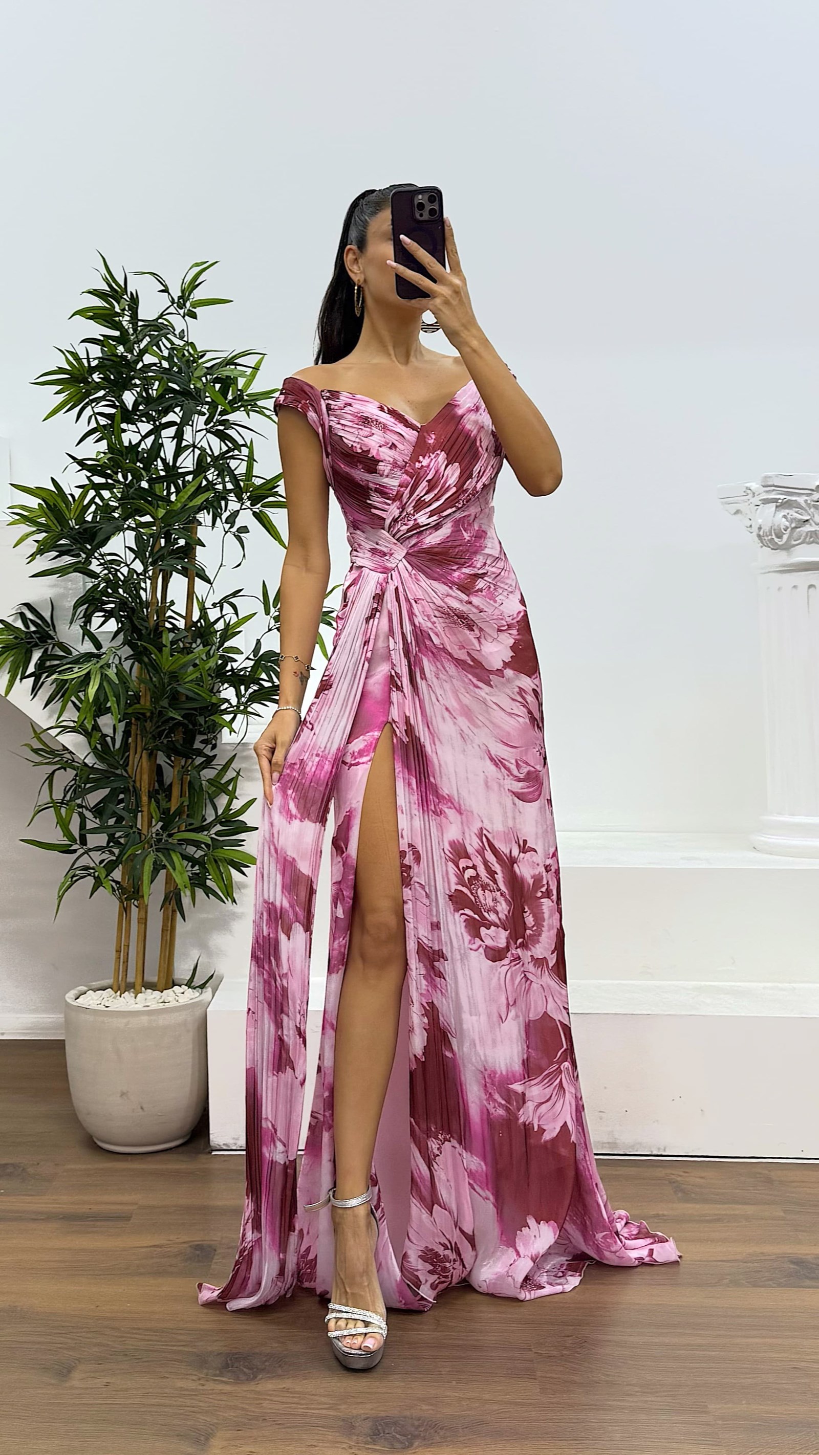Strappy patterned evening dress The product fits sizes 36 to 44, features padded cups, is lined, has a back zipper closure, and is designed with a slit. Product length: May vary between 170–175 cm. Fabric type: Chiffon – 66% viscose, 34% polyester